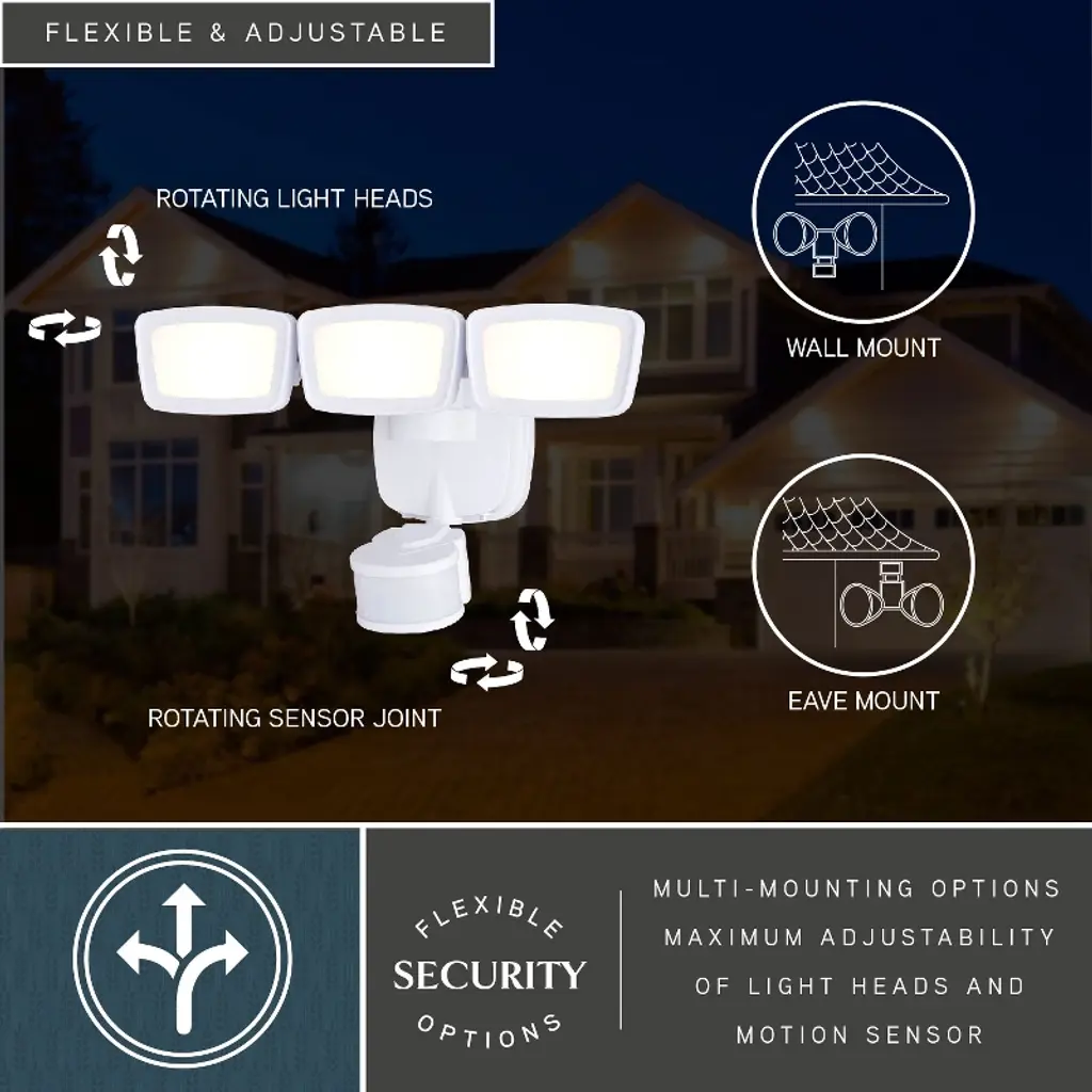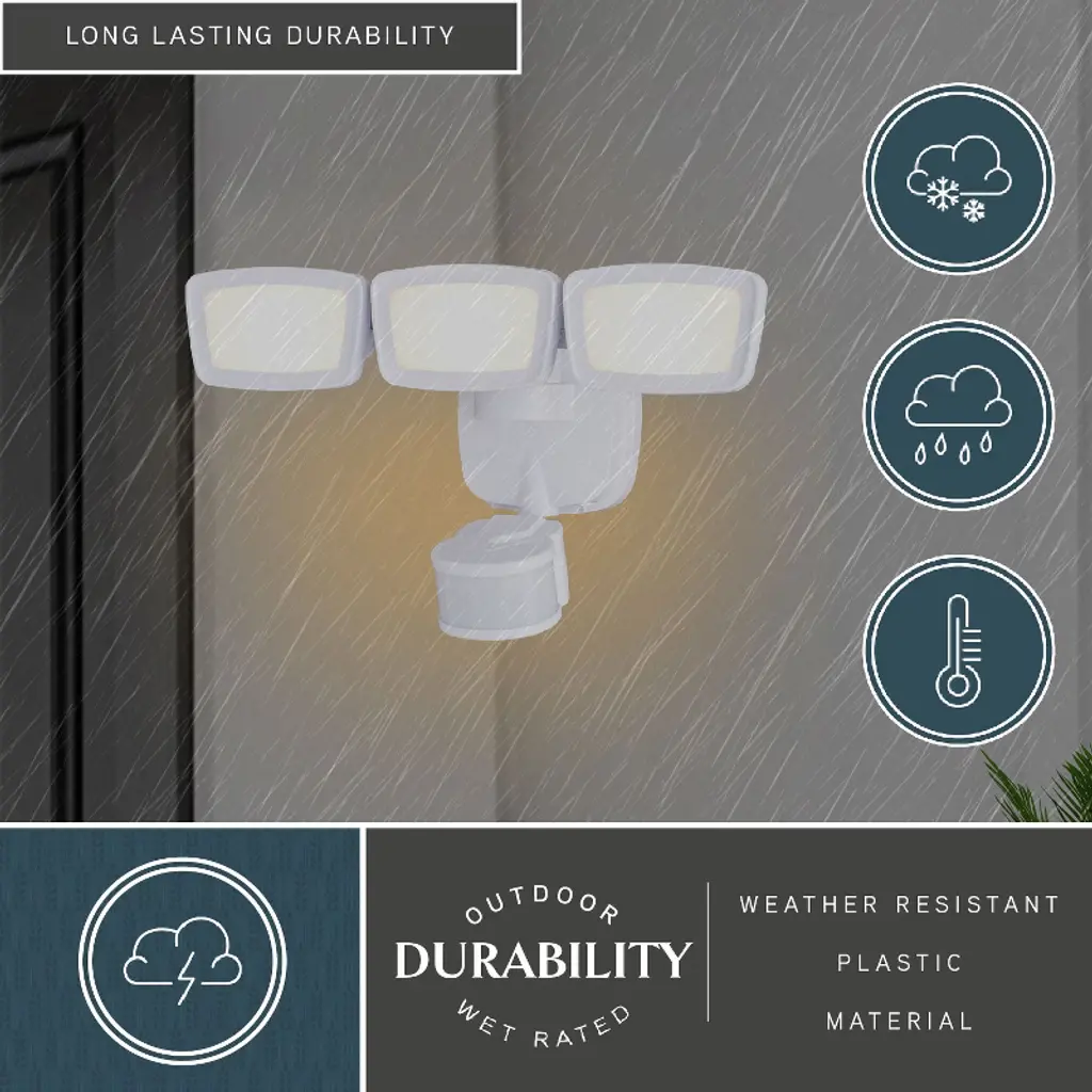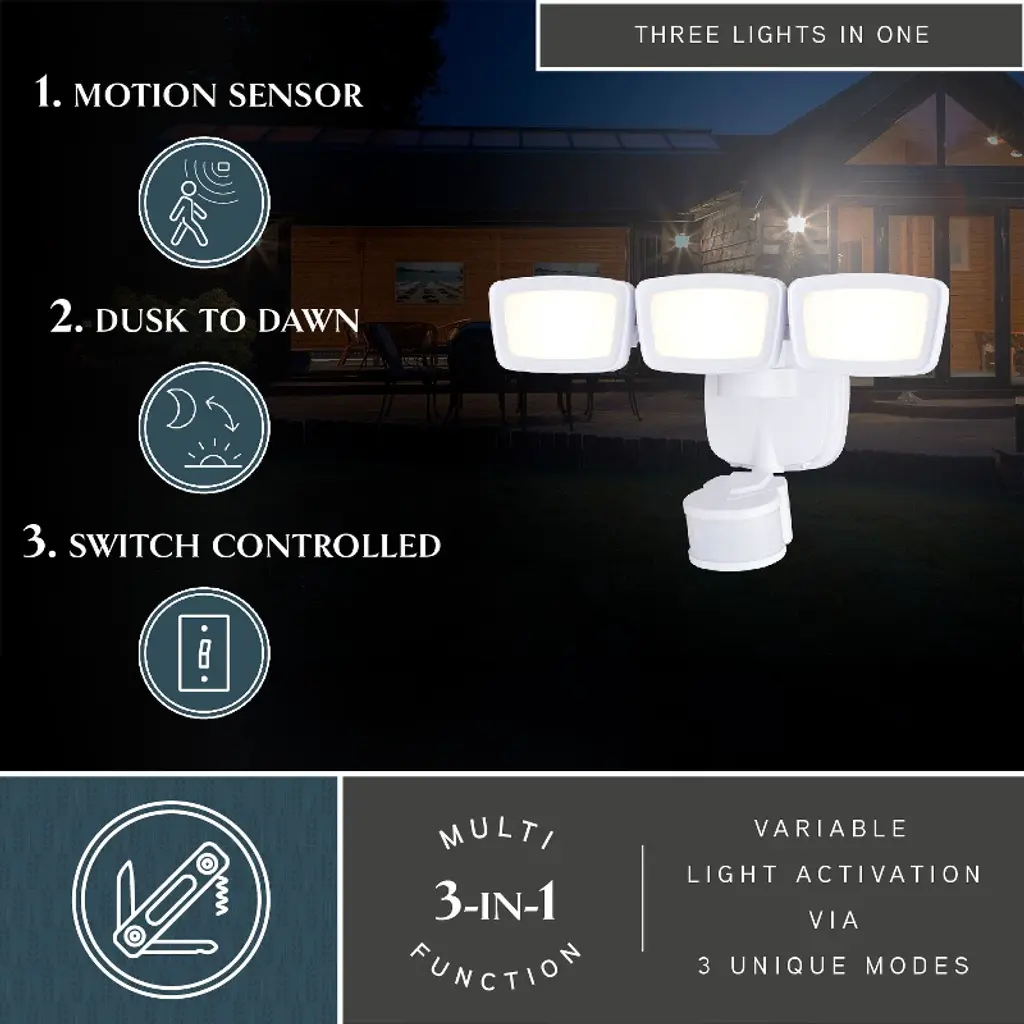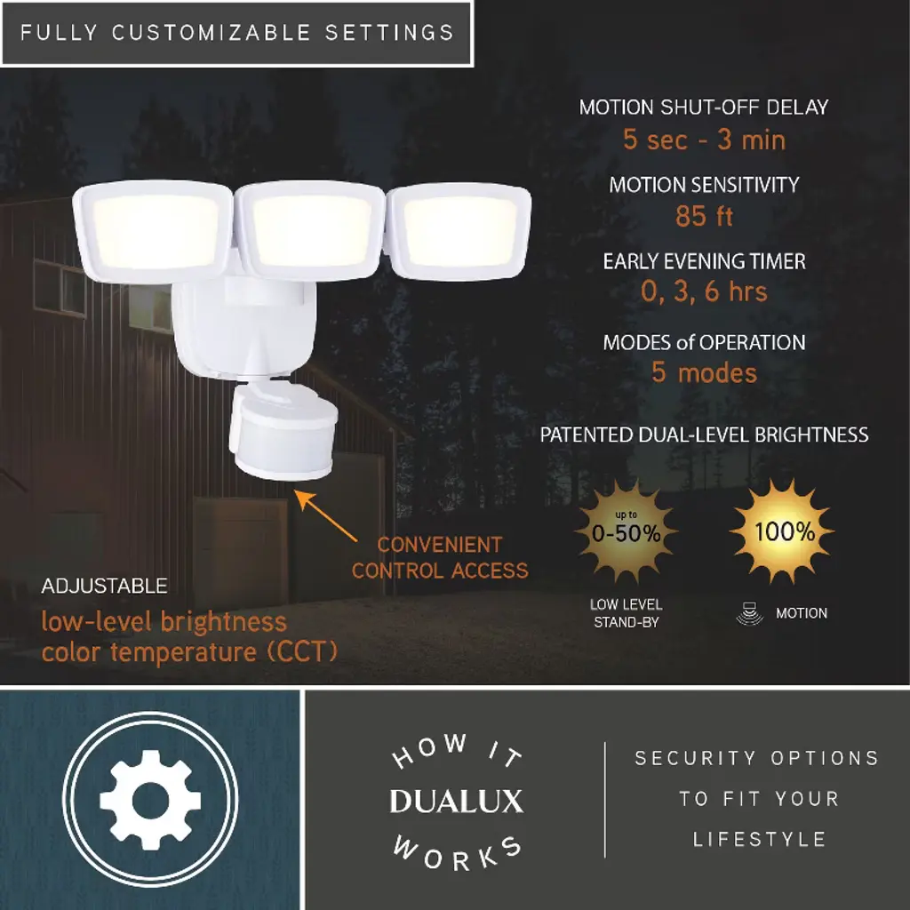 This 3-light integrated LED outdoor motion sensor security light ambient lighting that is adjustable both in CCT 2700K-5000K and brightness 0-50% throughout the night and 100% bright at 5000K high level when motion is detected. The light heads and sensor are fully adjustable and deliver 3200 lumens to keep your home's exterior brighter at dusk, dimmer at night, and instantly bright when motion is detected. Customize your lighting options with 5 modes of operation plus adjustable motion sensor sensitivity. Suitable for wall or eave mounting with a wide detection area of 240 degrees and 85 feet. This Dualux security flood light expands the functionality, safety, and security of your home's outdoor spaces with bright, reliable light when and where it is needed.