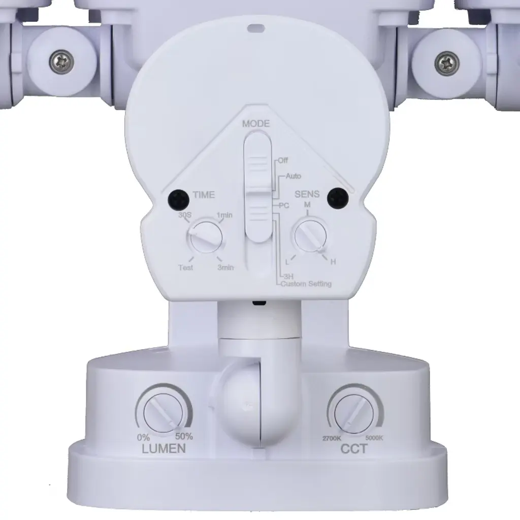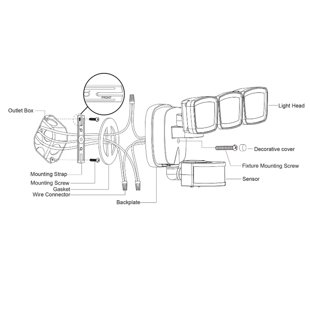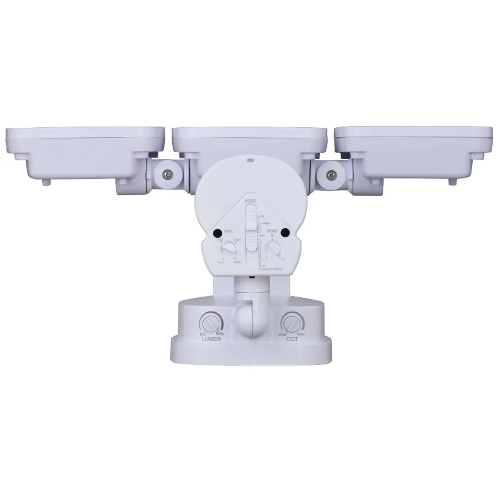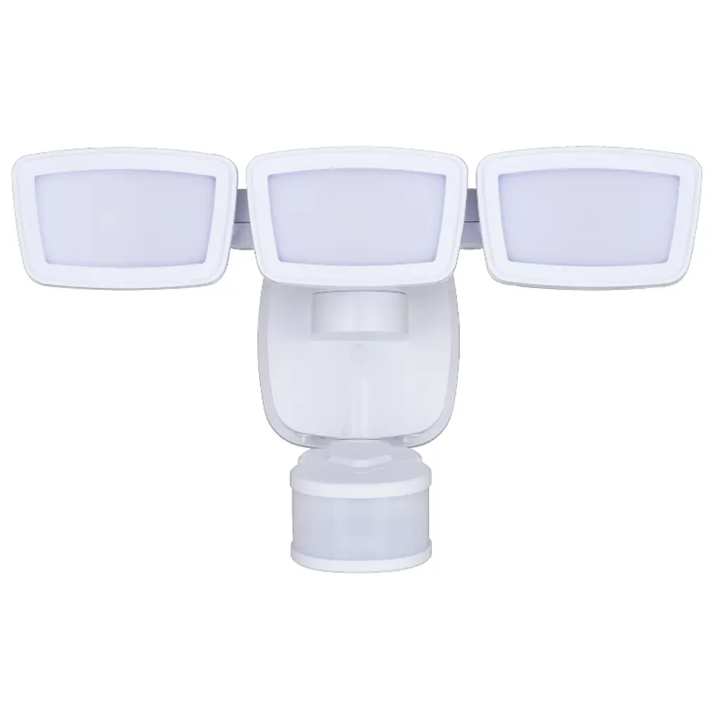 This 3-light integrated LED outdoor motion sensor security light ambient lighting that is adjustable both in CCT 2700K-5000K and brightness 0-50% throughout the night and 100% bright at 5000K high level when motion is detected. The light heads and sensor are fully adjustable and deliver 3200 lumens to keep your home's exterior brighter at dusk, dimmer at night, and instantly bright when motion is detected. Customize your lighting options with 5 modes of operation plus adjustable motion sensor sensitivity. Suitable for wall or eave mounting with a wide detection area of 240 degrees and 85 feet. This Dualux security flood light expands the functionality, safety, and security of your home's outdoor spaces with bright, reliable light when and where it is needed.