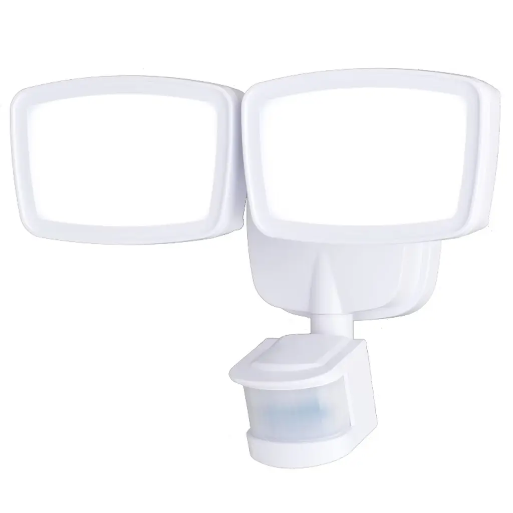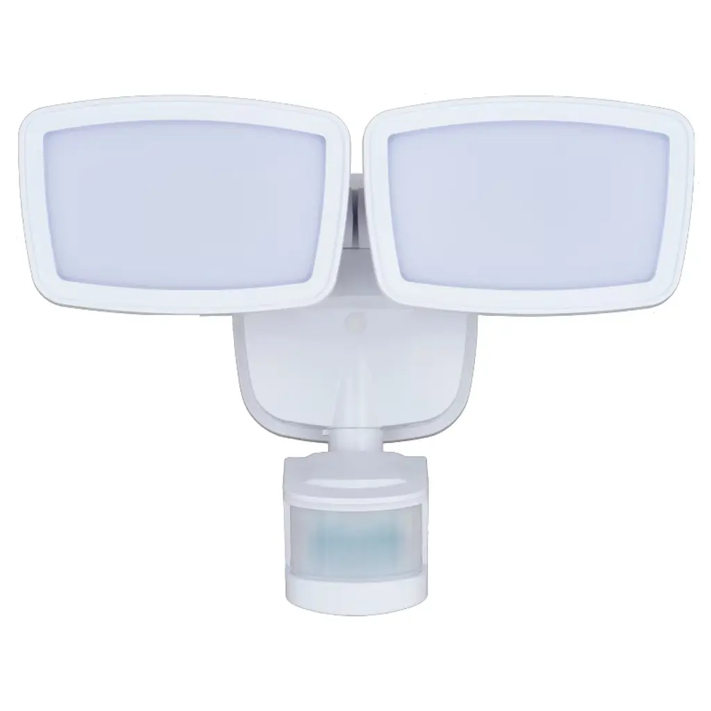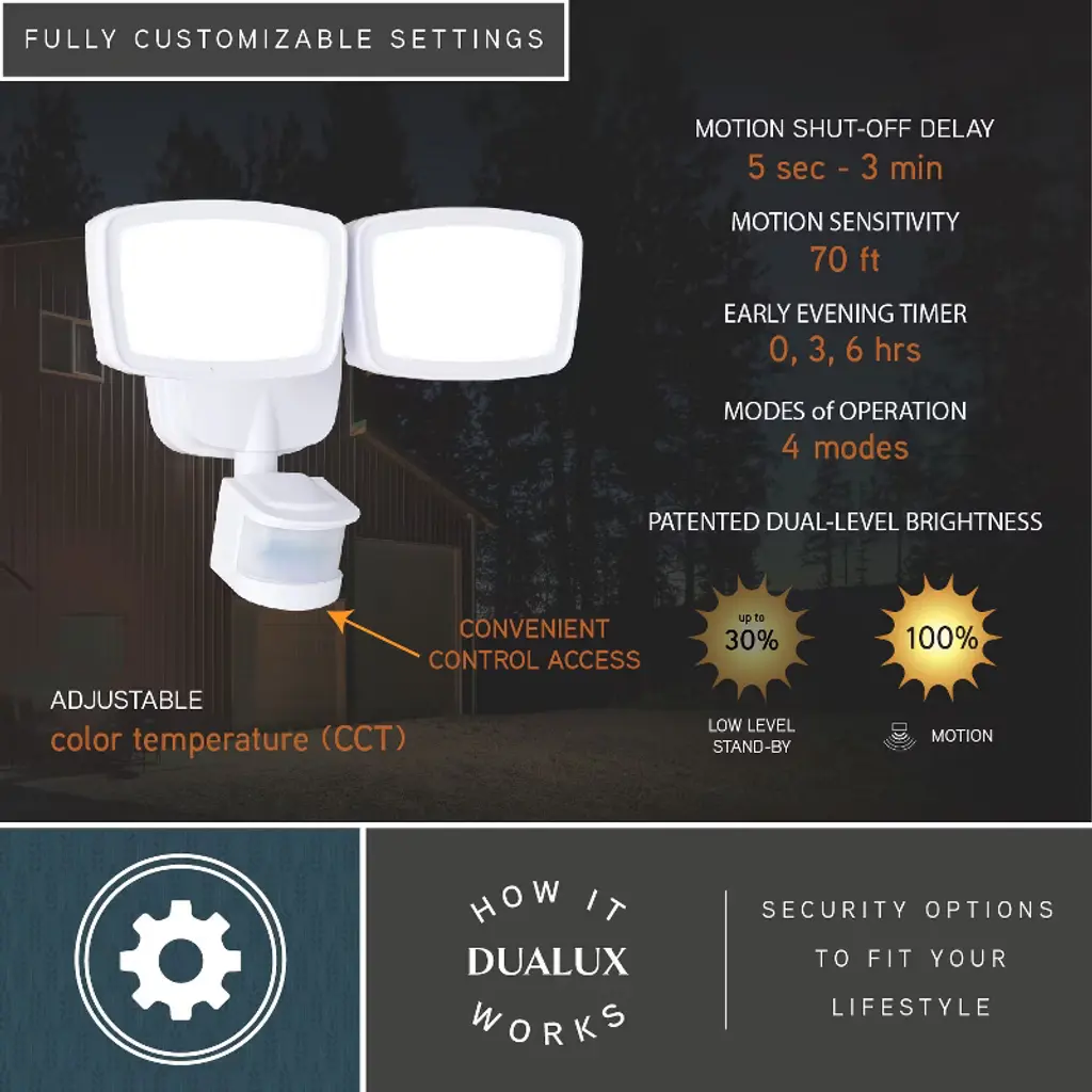 This 2-light integrated LED outdoor motion sensor security light provides low-level ambient lighting at 2700K and approximately 30% brightness throughout the night and bright 100% high level light at 5000K when motion is detected. The light heads and sensor are fully adjustable and deliver 2200 lumens to keep your home's exterior brighter at dusk, dimmer at night, and instantly bright when motion is detected. Customize your lighting options with 4 modes of operation plus adjustable motion sensor sensitivity. Suitable for wall or eave mounting with a wide detection area of 180 degrees and 70 feet. This Dualux security flood light expands the functionality, safety, and security of your home's outdoor spaces with bright, reliable light when and where it is needed most.