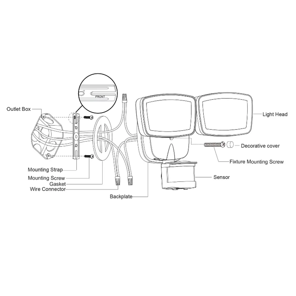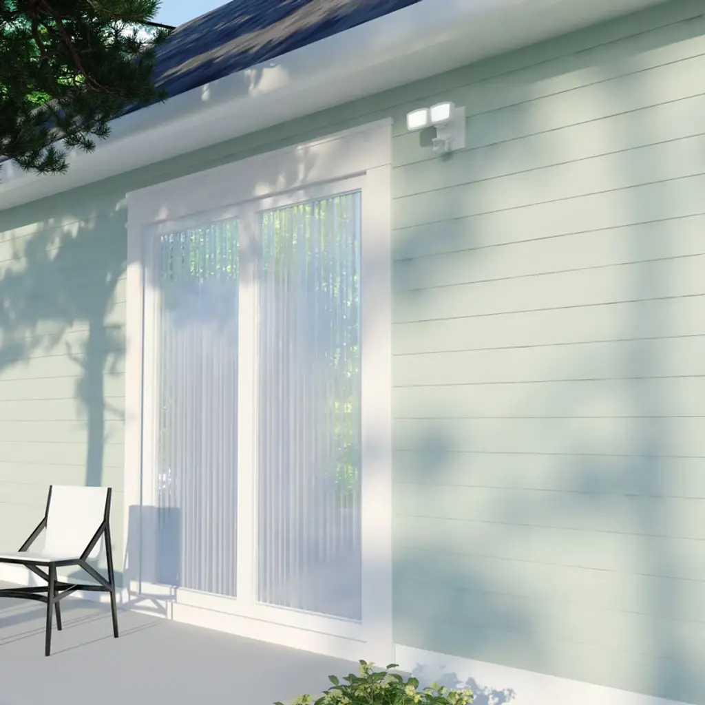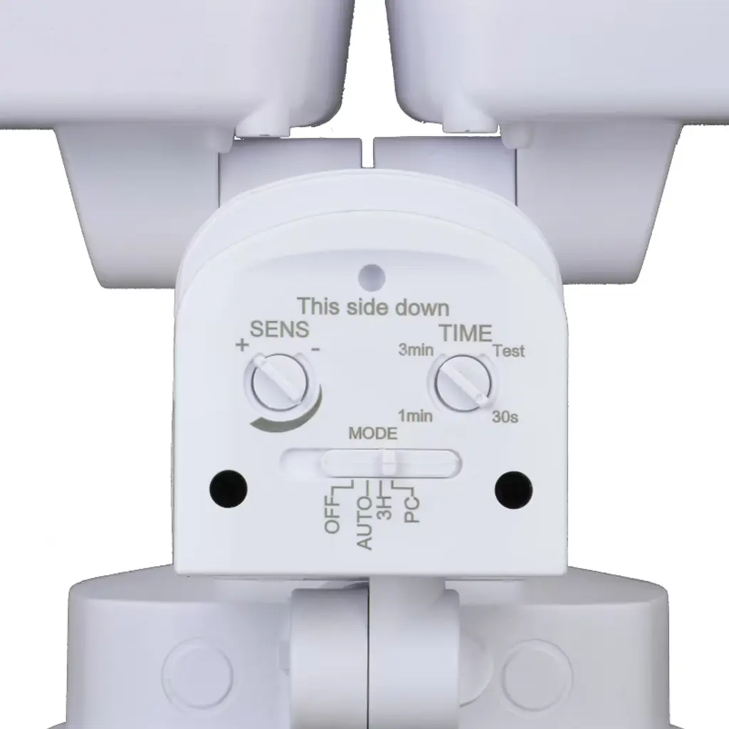 This 2-light integrated LED outdoor motion sensor security light provides low-level ambient lighting at 2700K and approximately 30% brightness throughout the night and bright 100% high level light at 5000K when motion is detected. The light heads and sensor are fully adjustable and deliver 2200 lumens to keep your home's exterior brighter at dusk, dimmer at night, and instantly bright when motion is detected. Customize your lighting options with 4 modes of operation plus adjustable motion sensor sensitivity. Suitable for wall or eave mounting with a wide detection area of 180 degrees and 70 feet. This Dualux security flood light expands the functionality, safety, and security of your home's outdoor spaces with bright, reliable light when and where it is needed most.