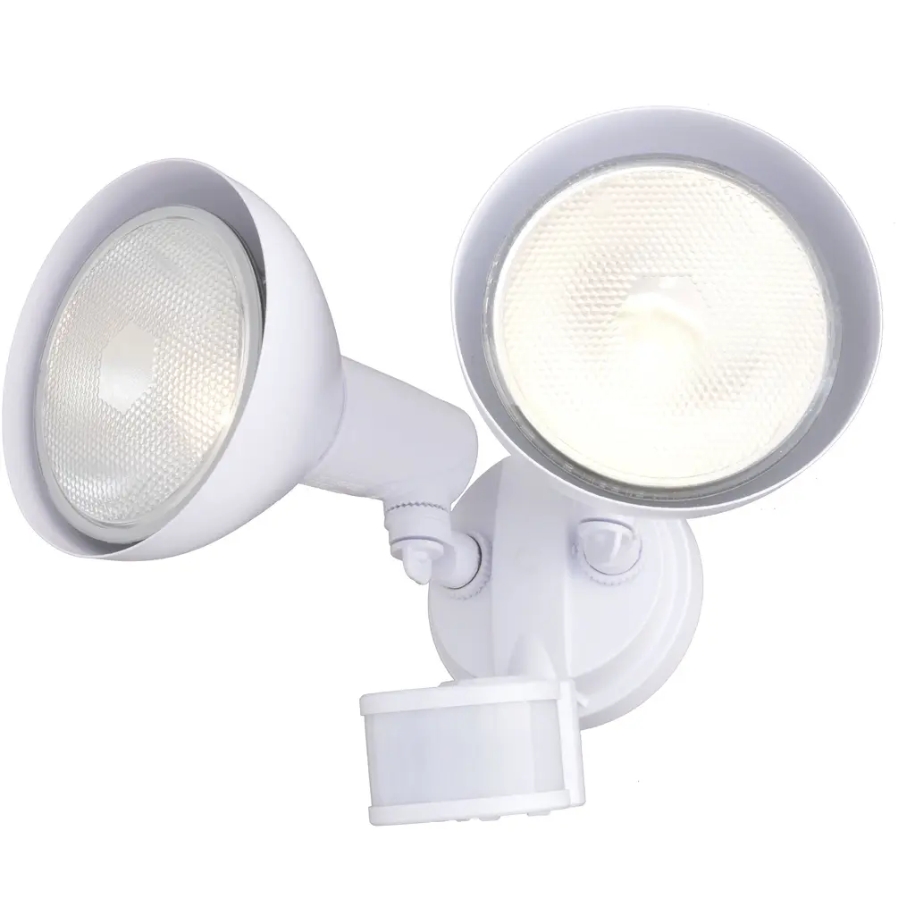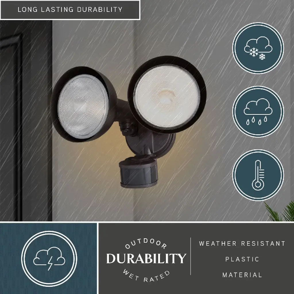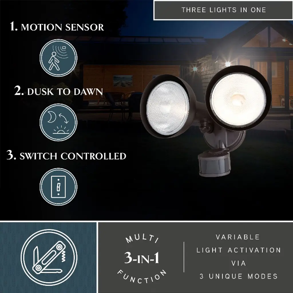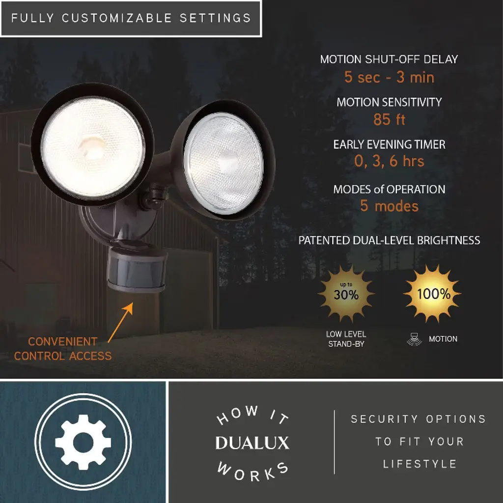 This 2-light outdoor motion sensor security light provides low-level approximately 30% ambient lighting throughout the night and bright 100% high level when motion is detected. The light heads and sensor are fully adjustable to keep your home's exterior brighter at dusk, dimmer at night, and instantly bright when motion is detected. Customize your lighting options with 5 modes of operation plus adjustable motion sensor sensitivity. Suitable for wall or eave mounting with a wide detection area of 240 degrees and 85 feet. This Dualux security flood light expands the functionality, safety, and security of your home's outdoor spaces with bright, reliable light when and where it is needed most.