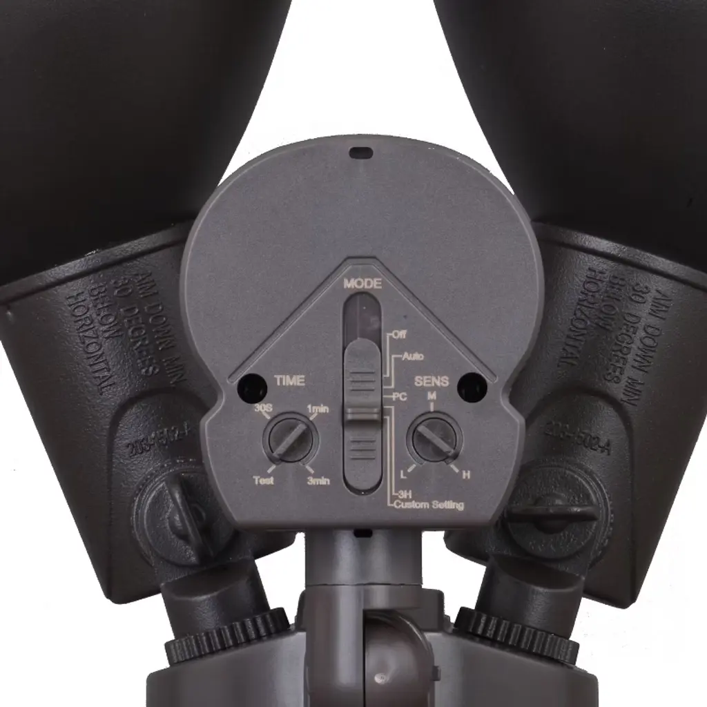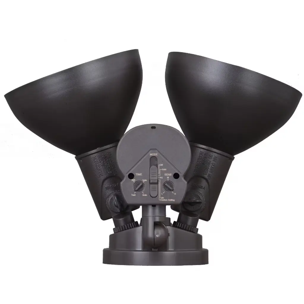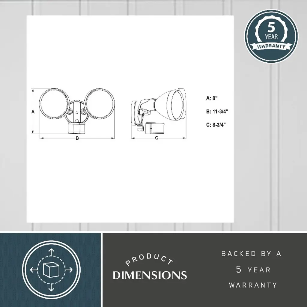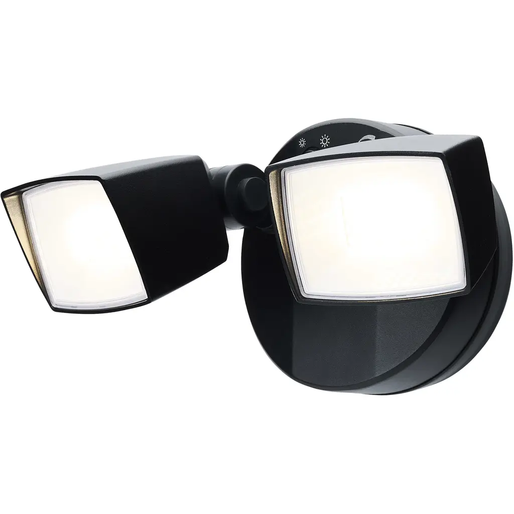 This 2-light outdoor motion sensor security light provides low-level approximately 30% ambient lighting throughout the night and bright 100% high level when motion is detected. The light heads and sensor are fully adjustable to keep your home's exterior brighter at dusk, dimmer at night, and instantly bright when motion is detected. Customize your lighting options with 5 modes of operation plus adjustable motion sensor sensitivity. Suitable for wall or eave mounting with a wide detection area of 240 degrees and 85 feet. This Dualux security flood light expands the functionality, safety, and security of your home's outdoor spaces with bright, reliable light when and where it is needed most.