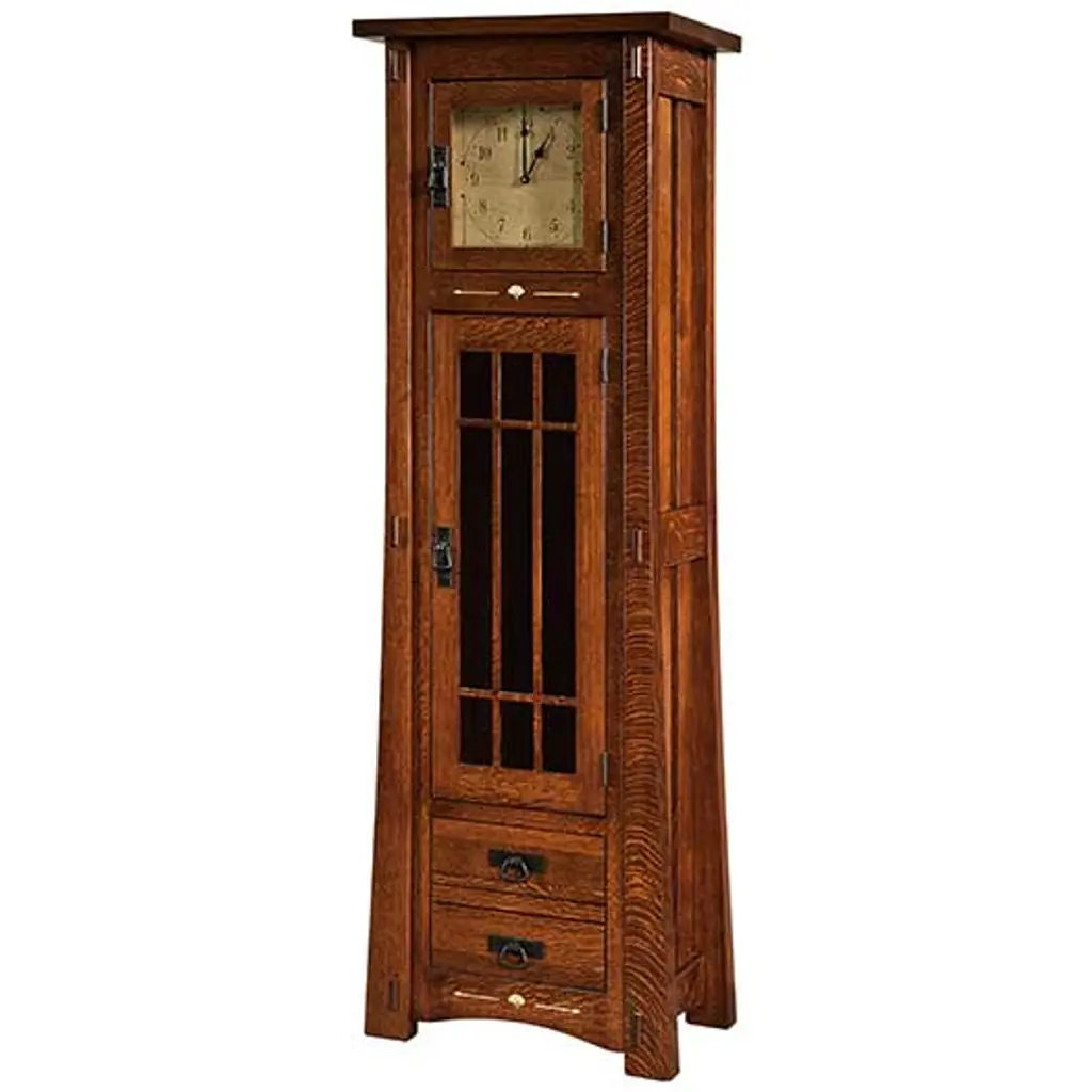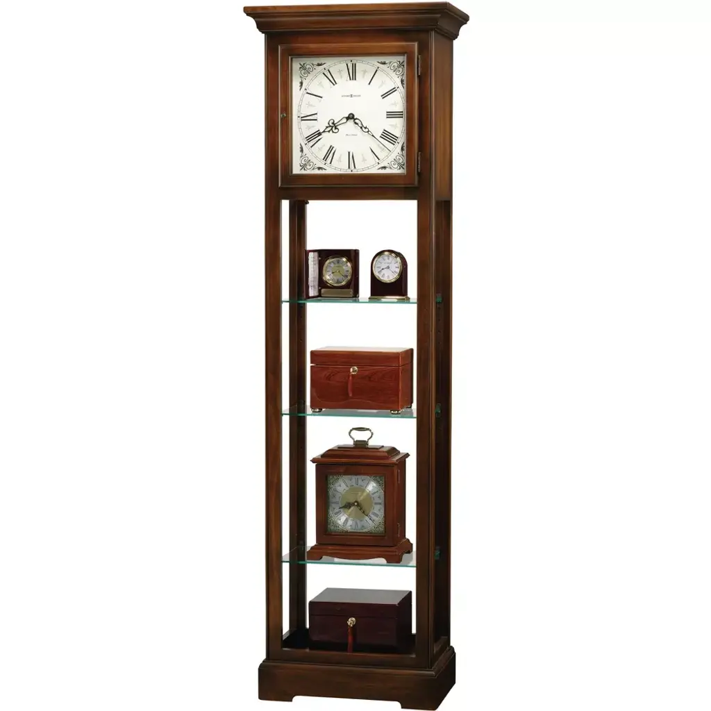 Offering the best of all worlds, Le Rose is a stunning wooden grandfather clock that doubles as a display cabinet. This distinctive design adds timeless character to any space thanks to its traditional-meets-contemporary design. The Hampton Cherry finish is versatile enough to fit beautifully into any room. On Display: It's easy to display everything from sculptures to trinkets to books thanks to this clock's trio of adjustable glass shelves. Each is supported with pad-lock metal shelf clips to ensure reliable stability. The fixed wood base shelf provides additional space for anything you want to display. Timed to Perfection: It's the little details that set this lovely grandfather clock apart. It has a flat top pediment, along with a base bearing a decorative cutout. It's open on each side, allowing for easy access. Set behind a flat glass panel, the illuminated dial features a vintage ivory tone and striking black Roman numerals with golden accents between each. The corner spandrels are finished in two-tone gold and black. The hinged top door opens easily, allowing for simple access. Adjustable levels are included for stability on any surface. The case has an interior light, allowing for easy viewing in any light. Quartz Movement: Quartz, triple-chime Harmonic movement plays your choice of full Westminster or Ave Maria chimes with strike on the hour with 1/4, 1/2, and 3/4 chimes accordingly; Westminster chime and strike on the hour only; or Bim Bam chime on the hour only. Volume control and automatic nighttime chime shut-off are optional. Two C batteries are required. Howard Miller: Founded in 1926 and still family-owned in its third generation, Howard Miller is the world's leading clock company and a respected brand name in fine specialty furnishings such as curio cabinets, wine & bar furnishings, custom storage cabinets, and SmartMoves adjustable height desks.