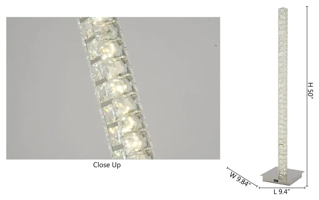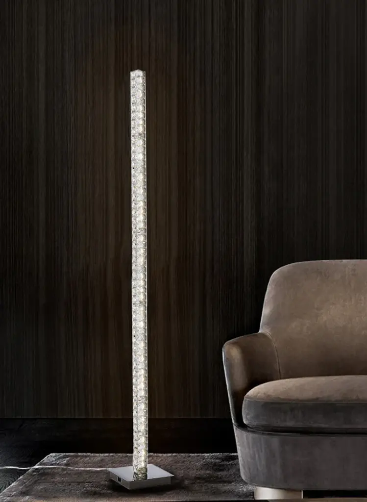 This modern LED and stylish floor lamp features a unique crystal pillar design. The minimalist design creates a dramatic and eye-catching effect, perfect for adding a touch of contemporary flair to a living room, dining room or bedroom.