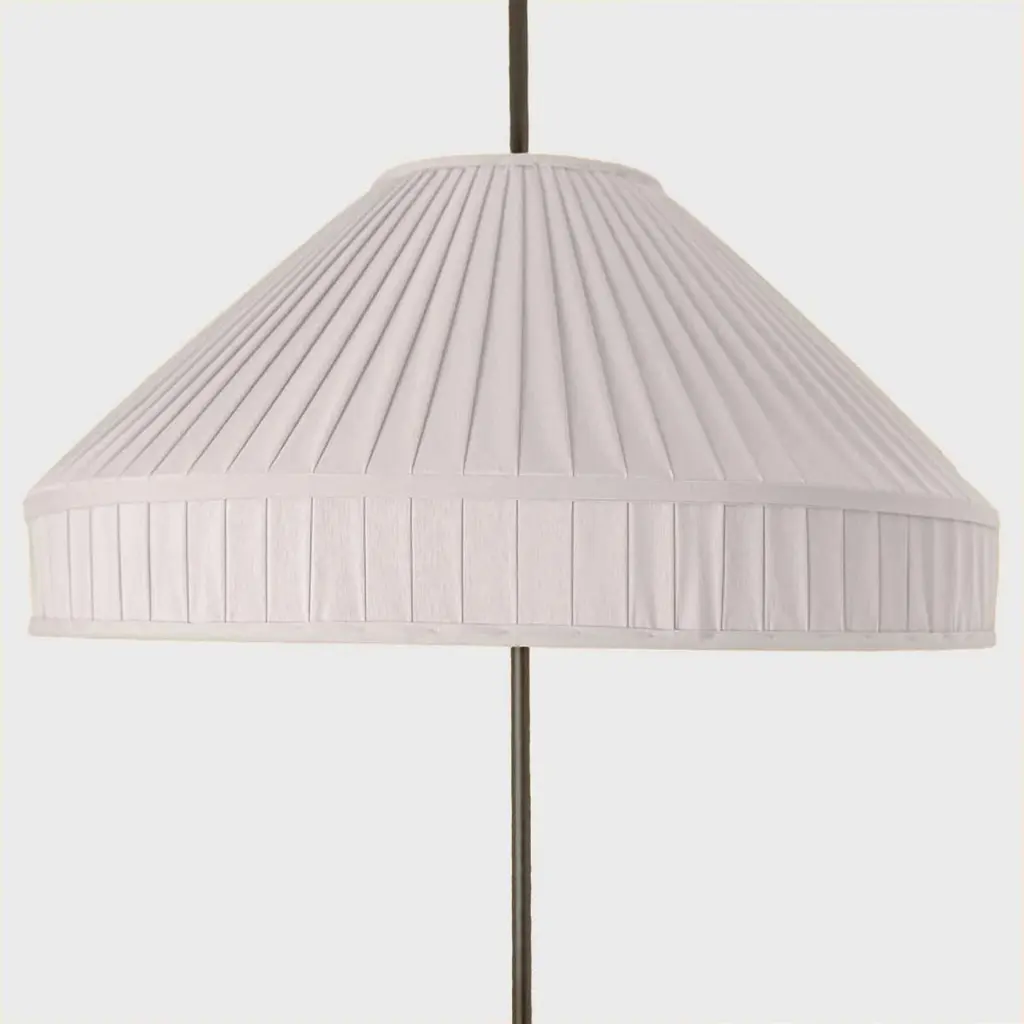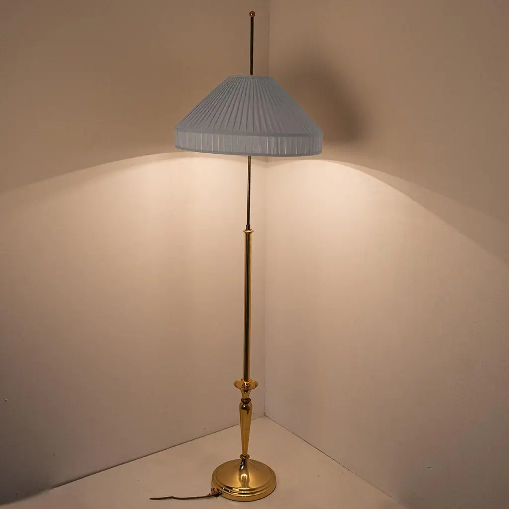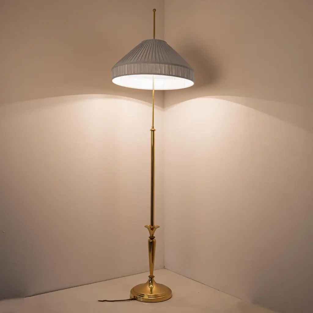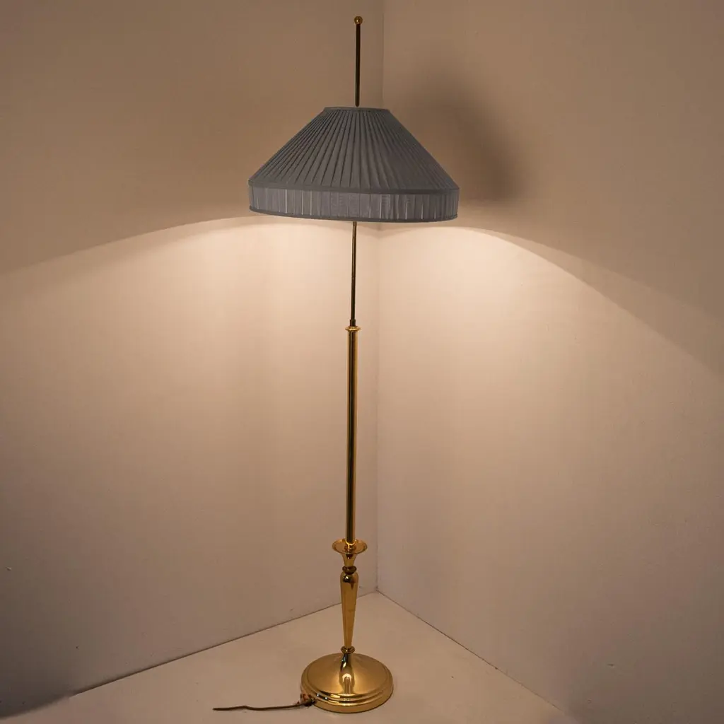 Classic Floor Lamp on a Brass and Black Base, Germany 1960.The relatively large fabric shade, characterized by a subtle slope and a straight vertical edge at its end, was also common for the time, but it was usually decorated with fringes at the bottom.Please notice the price is for one piece. 2 pieces available.Cleaned and well-wired, in full working and ready to use. The fixture requires two E27 light bulbs.