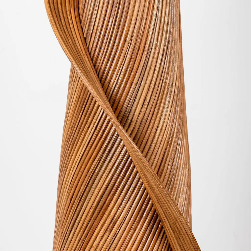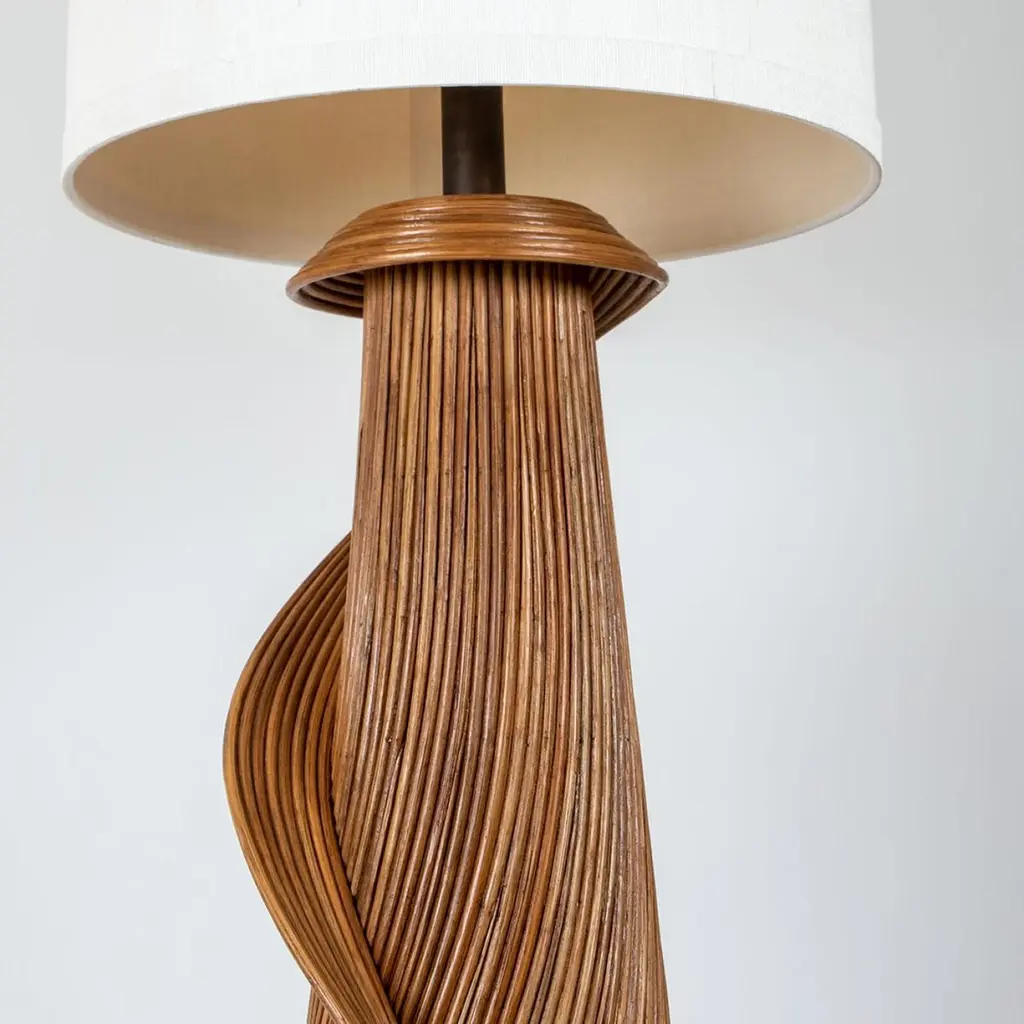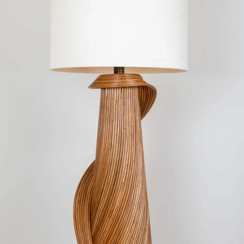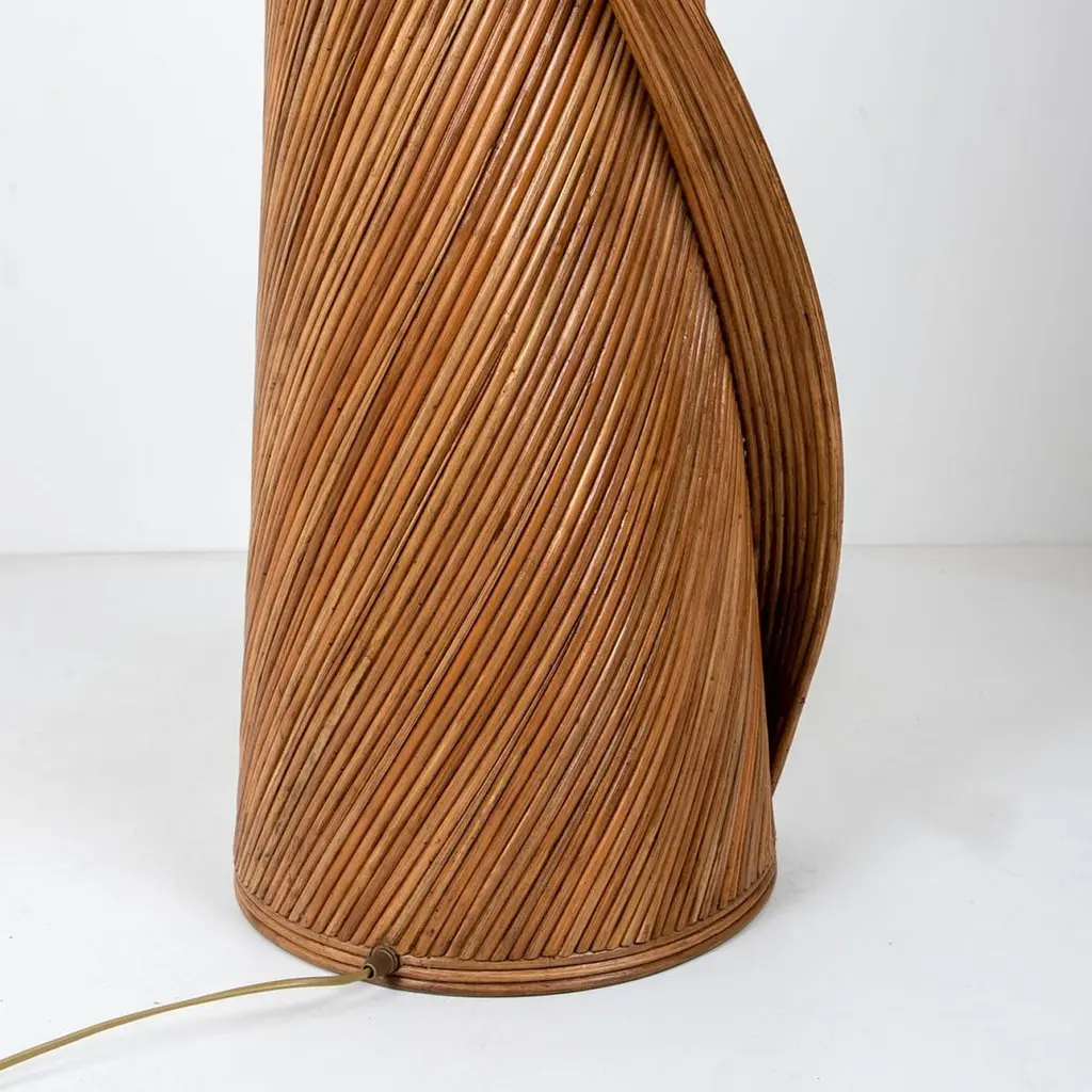 Exceptional XL Rattan structured floor lamps, designed by the Dutch artist René Houben.The contemporary sculptural rattan Lamp-foot is topped by a lampshade made of handwoven linen.A real piece of art. Bohemian chic design and trendy style!DimensionsBody: Ø 40 x H 155 cm / Ø 15,7″ x H 61″Total height: 200 cm / 78,7″Shade: 45 x 37 cm / 17,7″ x 14,6″Bespoke colors (of the lamp shade) and dimensions on request. Feel free to ask for additional information.Please notice the price is for 1 piece. More pieces available on request.- Rattan has increased significantly in popularity. Many people confuse rattan with bamboo, but they are totally different. This Rattan lamp-foot is 100% sustainable and recyclable. The biodegradable rattan grows quickly and can be easily harvested. It does not require pollutants or machinery to be harvested or made. It will be durable and long-lasting for many years. It is also sustainable because every part of the rattan can be used for making products-.It seems that eco-friendly goods can be extremely chic and suitable for any home style. It is a practical solution to the demand for chic and high-quality.