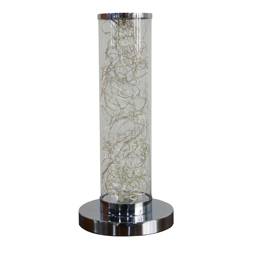 Material: Silver Chrome Metal Base and Top Cover.90 pcs LED 8-wattfor energy-efficient use.750 Lumens equals to 8-watt LED, 2700 KelvinsIntegrated LED Bulb built-in on the Linear Body Pole. Fully assembled.Linear Column LED/Metal Body Tube measures 3.25" L x 11" H. Metal Base measures 6" L x 6" W x 0.95" H. Input: 110v, 60Hz.Black Cord measures 72" L w/ an AC Adaptor Plug. In-line On/Off Switch located on the Black Cord. Distance from the lamp to the in-line Switch measures 15" L