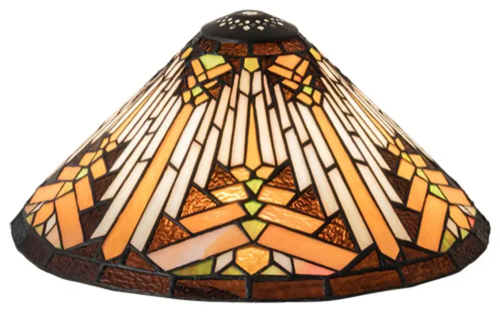Like gazing out your window across the warm desert at sunset; interlocking tiles of Sand tone Beige glows behind the sun glistened Orange; Amber Green and Brown rays. All this is surrounded by a Root Brown border. The stunning shade is created using the famous Meyda Tiffany copperfoil construction method. The shade can be paired with a base to create a table/floor lamp or with hardware to build a beautiful ceiling fixture.