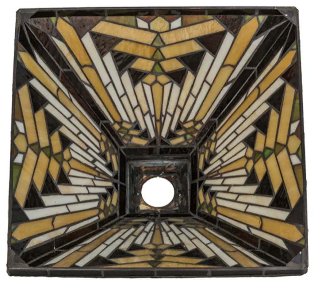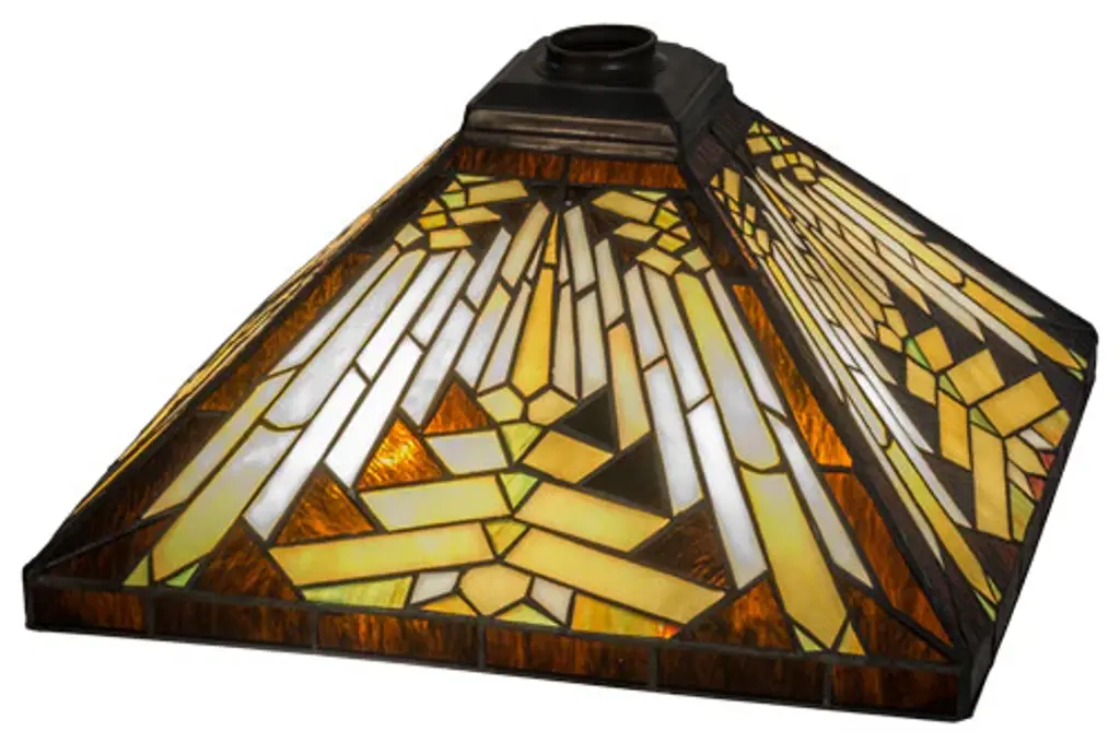 Like gazing out your window across the warm desert at sunset; interlocking tiles of Sand tone Beige glows behind the sun glistened Orange; Amber Green and Brown rays. All this is surrounded by a Root Brown border. ?The stunning shade is created using the famous Meyda Tiffany copperfoil construction method. The shade can be paired with a base to create a table/floor lamp or with hardware to build a beautiful ceiling fixture.