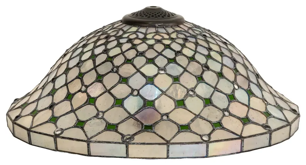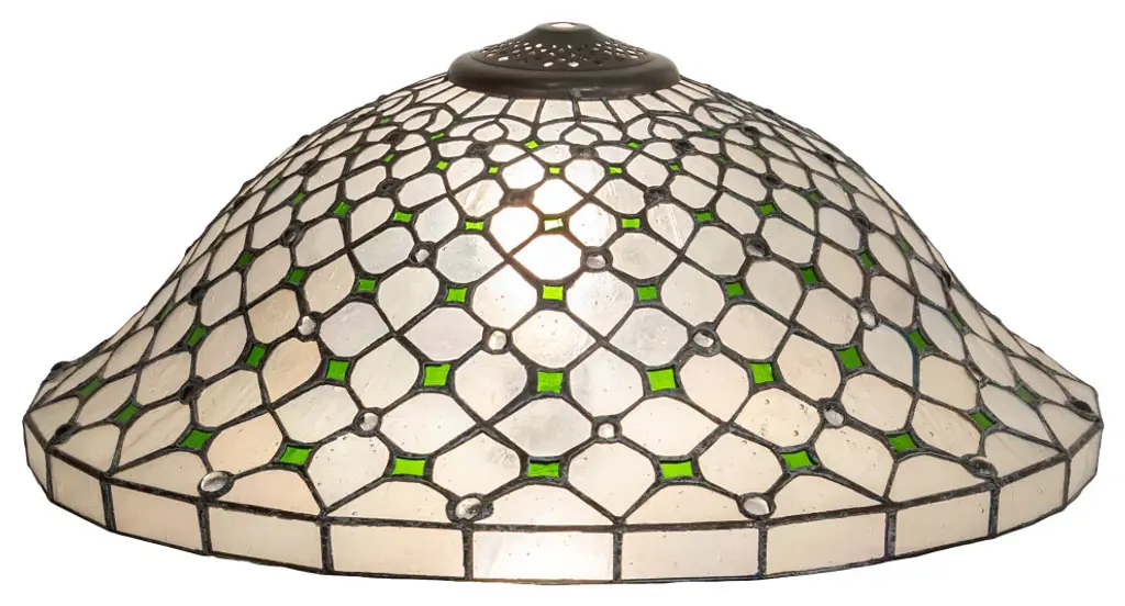 Diamond patterns of Iridized Ivory and Ivy Green are accented with sparkling Clear jewels droplets in this elegant Victorian-style shade. The versatile stained glass shade is created using the famous Meyda Tiffany copperfoil construction technique. Pairs beautifully with a base to create a stunning table or floor lamp. Match with hardware to build a gorgeous ceiling or wall fixture. The Diamond and Jewel Recurve Shade is featured in our American-designed; handcrafted Stained Glass Lighting Collection. Each shade is a unique work of art with color variations based on natural ingredients inherent in the glass. Contact us if color matching is critical when ordering multiple items.