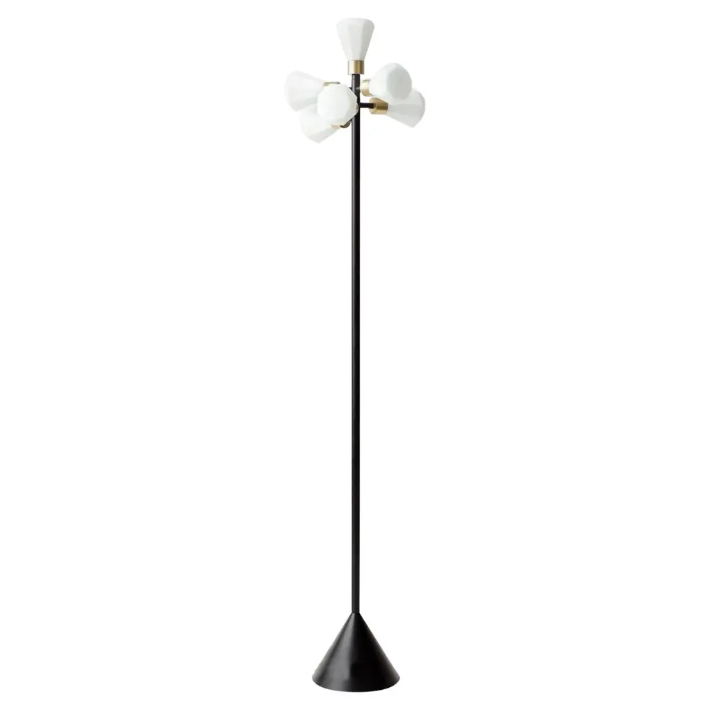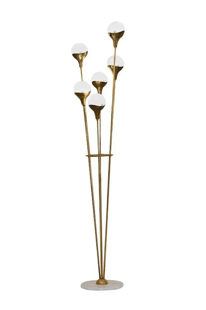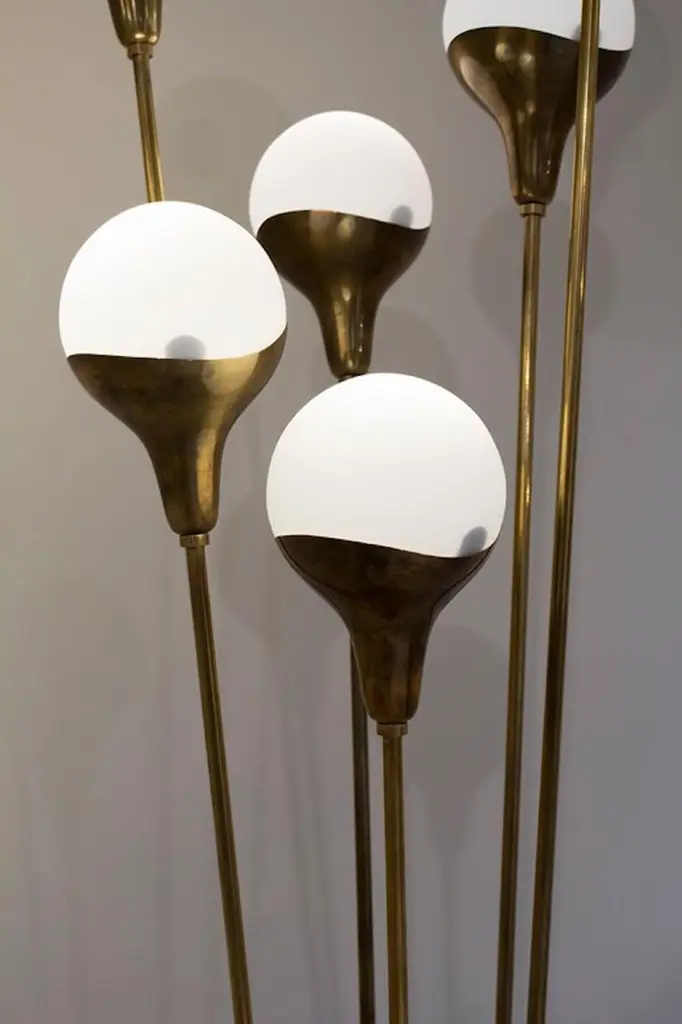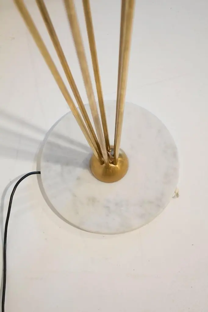 Glass ball floor lampBrass stems and fittingsMarble base1950s Stilnovo styleMade in Italy.