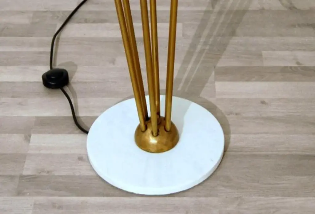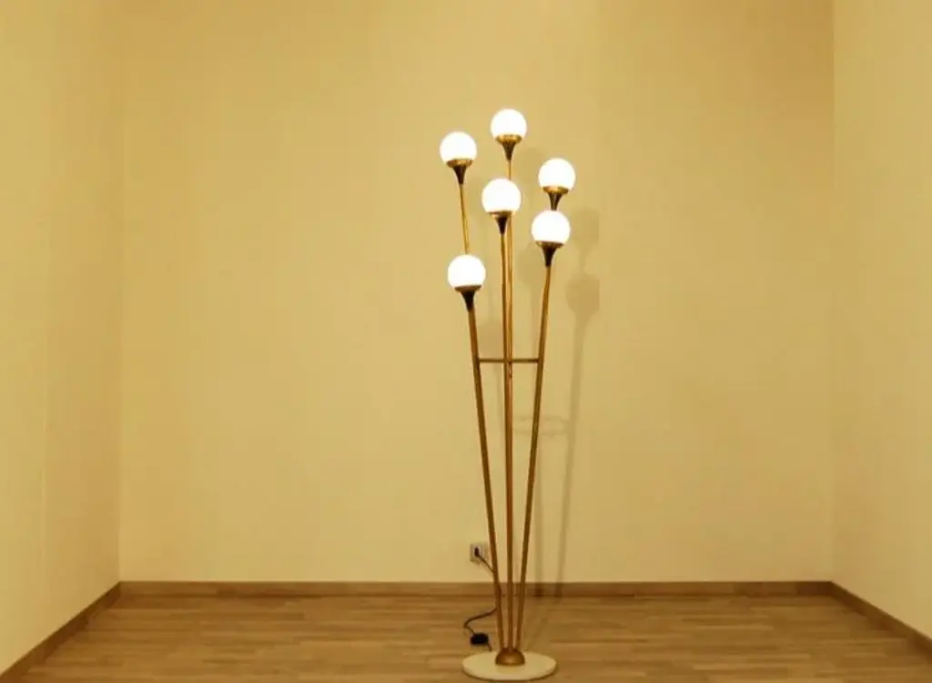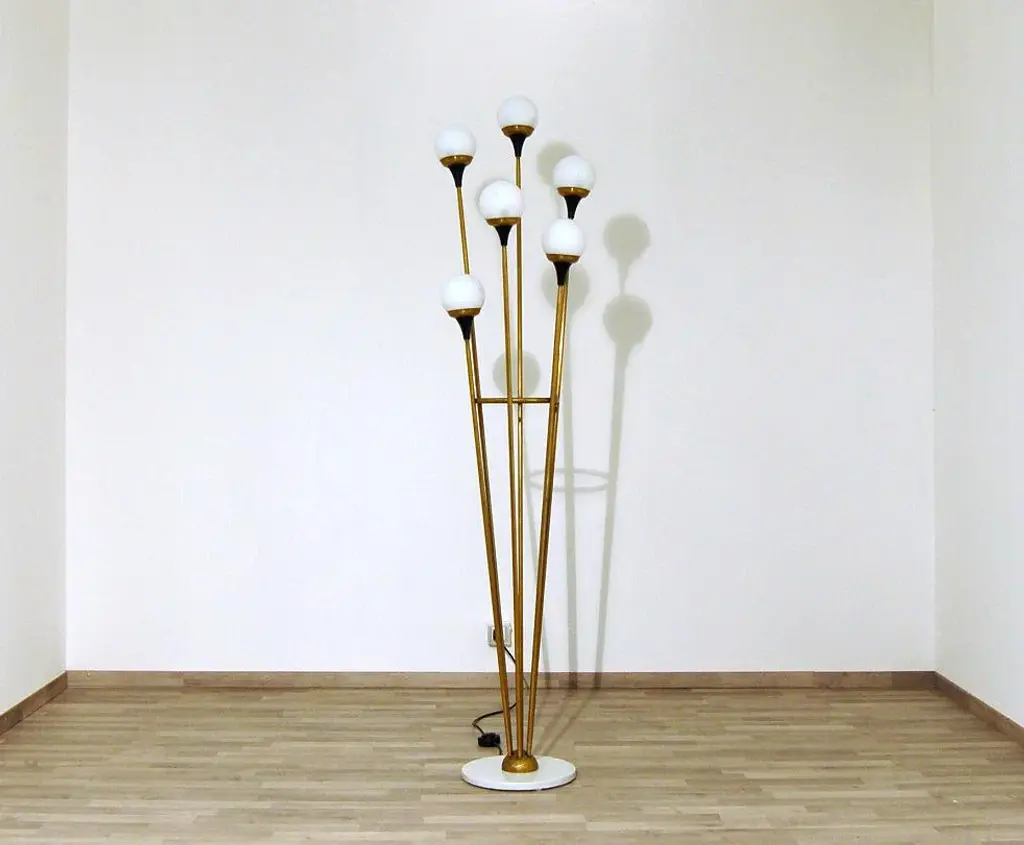 This elegant iconic brass globes lamp has been made in the pure tradition of Italian mid-century design. It was handmade in Italy. This lamp is newly designed, reimagined and manufactured based on the inspiration of the vintage mid century Italian design. Dimensions: 11" diameter x 73" height Wiring: Built for U.S. voltage (120 V, 60Hz) with standard U.S. sockets (E26). 100W maximum per bulb. Compatible with LED. Dimmable. Light bulbs are not included. MMDESIGN DEPARTMENT is a furniture broker for Interior Designer and Architects based in USA. All our lightings are completely rewired for USA with UL electric components. Shipping are insured and are done at your home address in USA by DHL Express. Shipping pick up is done within 8 days after order confirmation received.