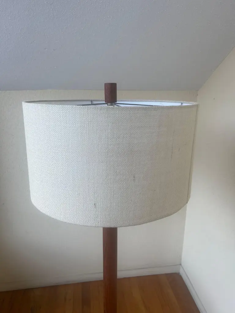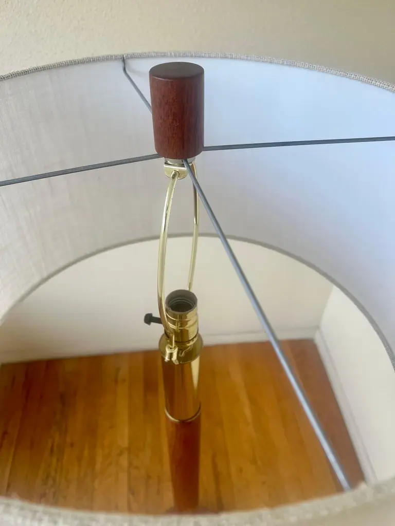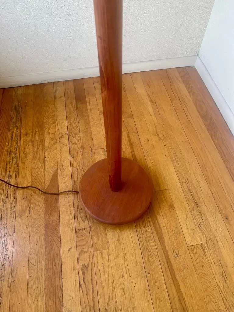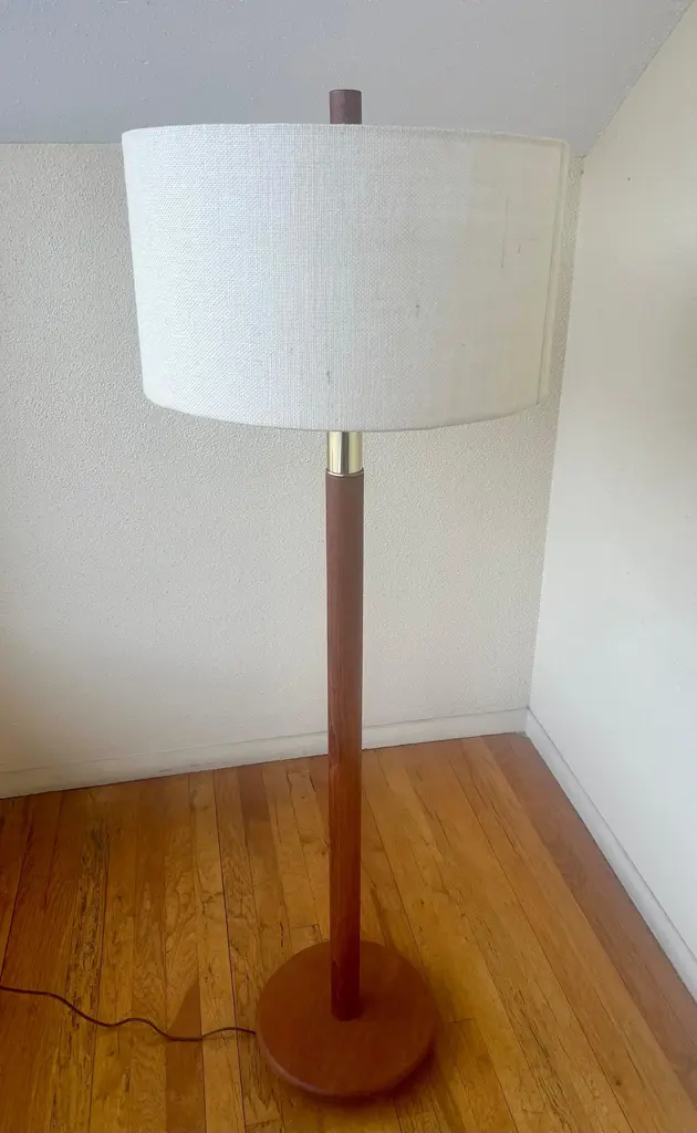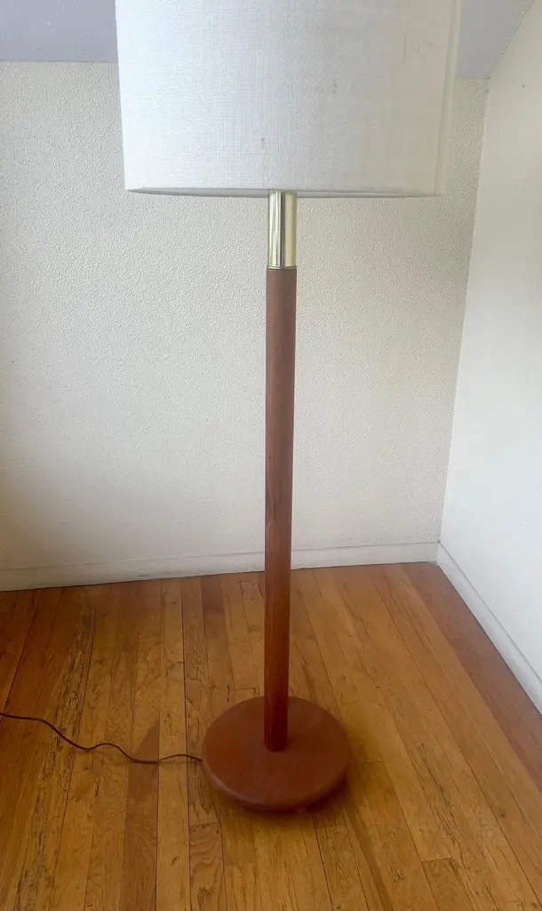 A pair of elegant solid teak and brass floor lamps, freshly rewired, The lampshade is included and redone in burlap material, and the final is in solid teak everything its been restored including the wood, lampshade, and rewired, we have 2 available buyer has the choice to buy 1 or 2. the lamp shade its 18" x 10"