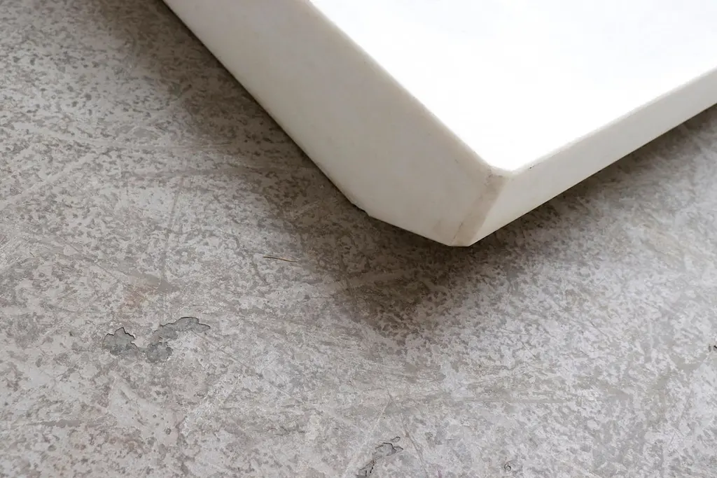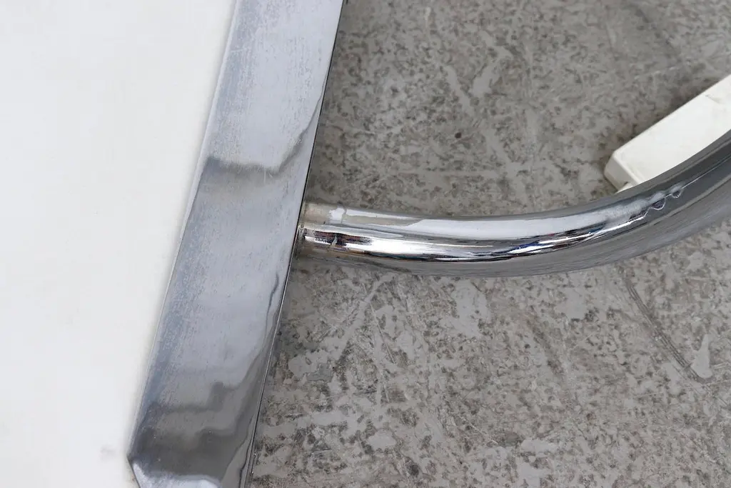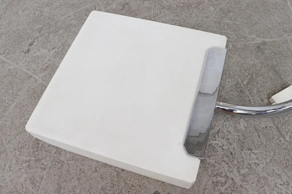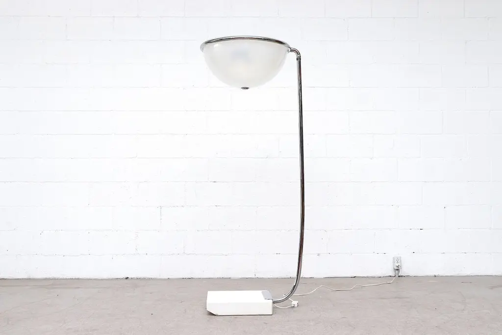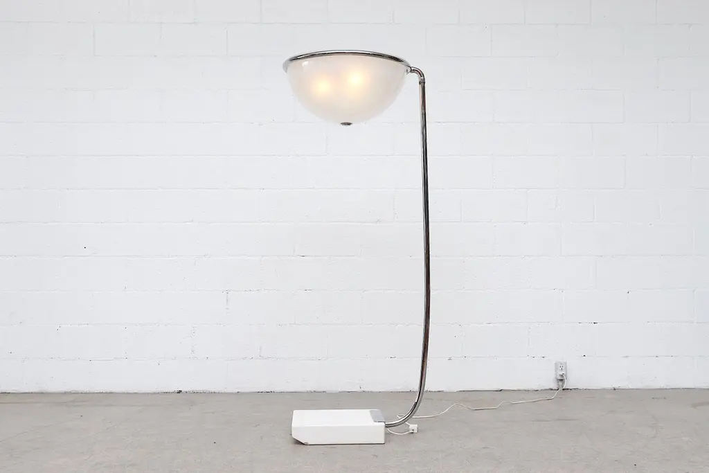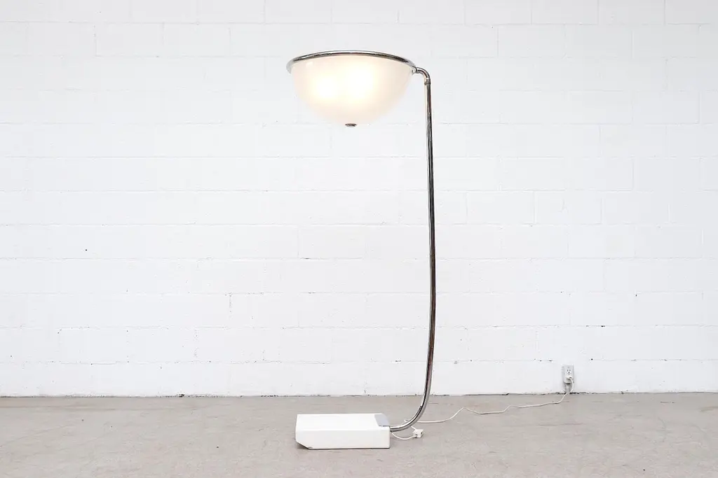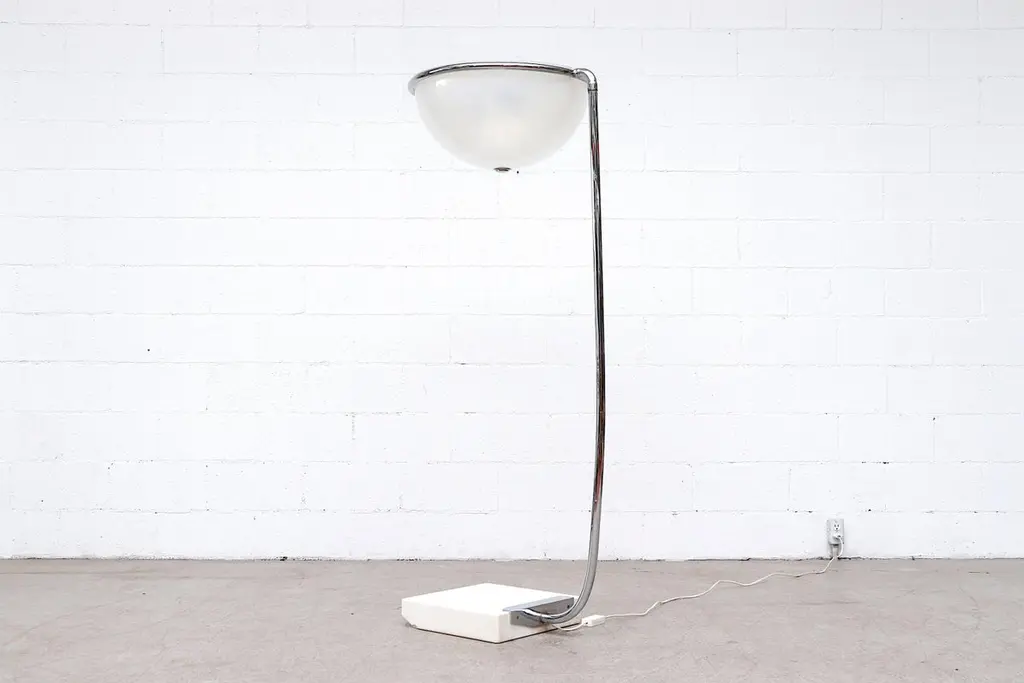 Awesome 1970's modern floor lamp with tubular chrome frame, heavy marble base and plexiglass shade. In original condition with visible wear, including scratching and some chipping to marble. Retains original dimmer switch. Marble base measures 15.75" square. Two available.