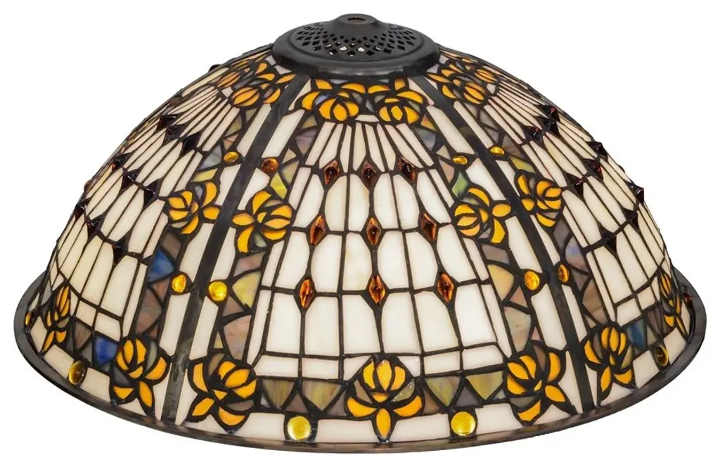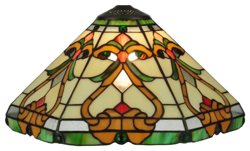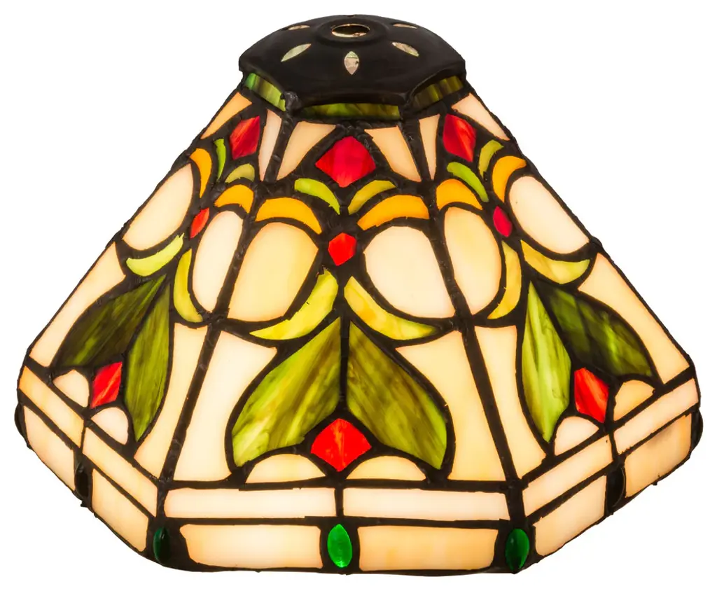 Oceanic Iridescent Blue/Green Jeweled nautical shells; surrounded by Blue and Red jewels; highlight an intricate Art Nouveau motif in Amber and Clear Ripple glass; accented with iridescent Amber formed jewels on Bone Beige. A Multicolored ringlet motif featured on bottom accented with Amber oval jewels while Amber diamond shaped jewels accent the top. The shade is handcrafted using the famous Meyda Tiffany copperfoil construction process. Add a base to create a table or floor lamp; or use hardware to build a ceiling fixture.The Shell with Jewels Wall Sconce is featured in our American designed; handcrafted Stained Glass Lighting Collection. Each shade is a unique work of art with color variations based on natural ingredients inherent in the glass. Contact us if color matching is critical when ordering multiple items.