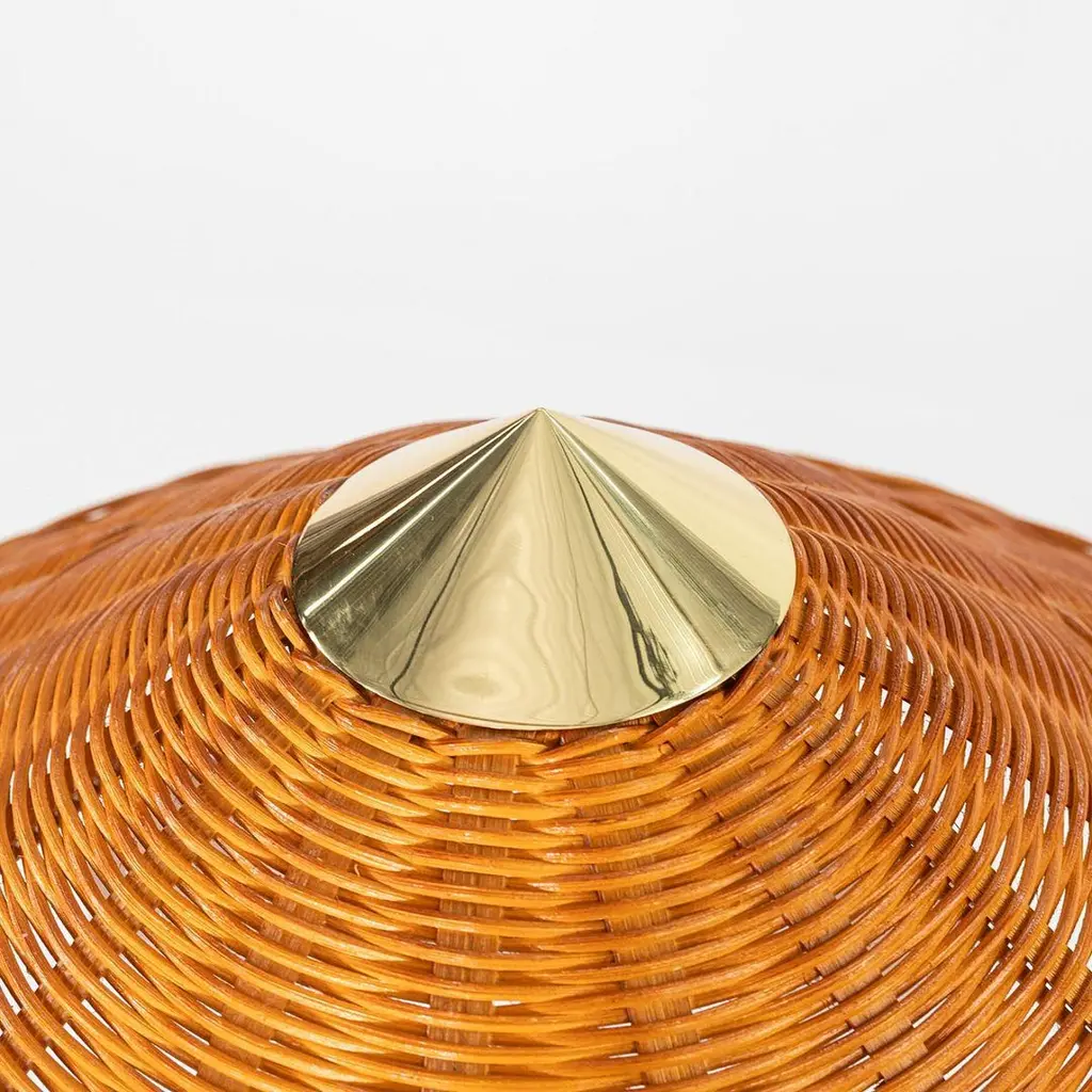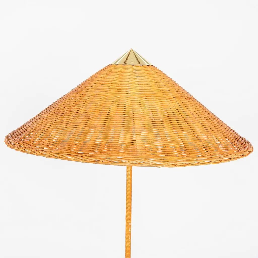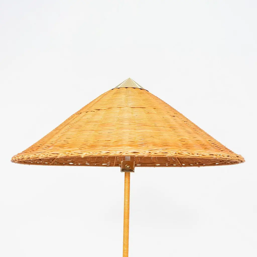 This is a 9602 Floor Lamp, originally designed by Paavo Tynell in 1938 the hotel Aulanko. This particular example was produced by GUBI in Denmark in 2024. Commonly referred to as the "Chinese Hat" lamp, this piece features a wide, gently flared wicker willow shade paired with a rattan-wrapped stem and a brass base.The listed price includes one lamp and there are three available to purchase.The lamp measures approximately 22 inches in diameter and 60.4 inches tall. This example shows very light wear from previous use and overall is in very good condition. Please see photos.
