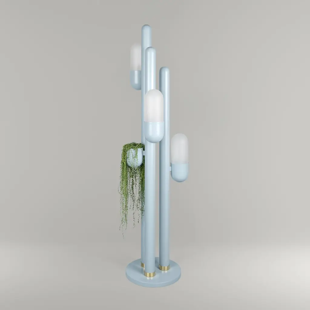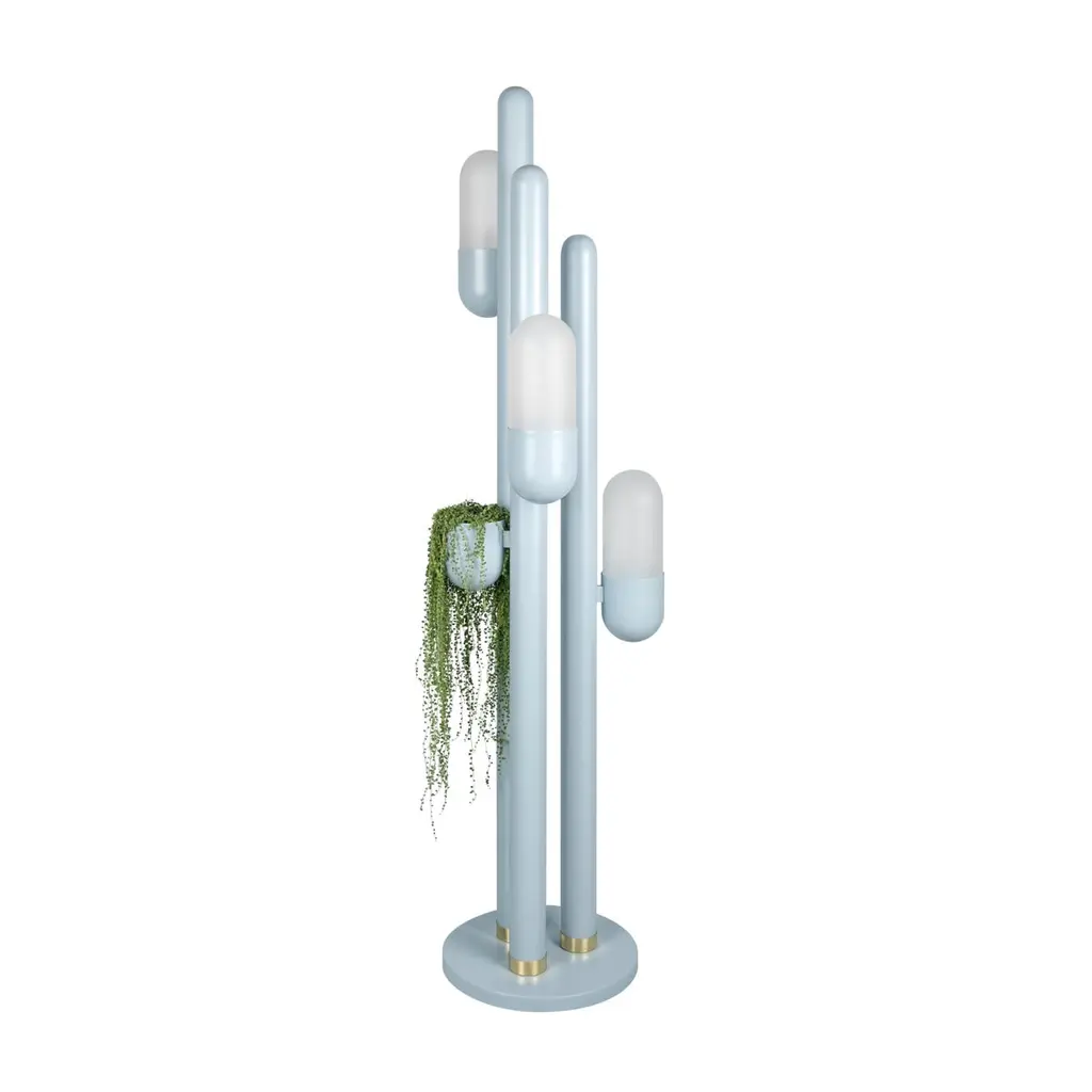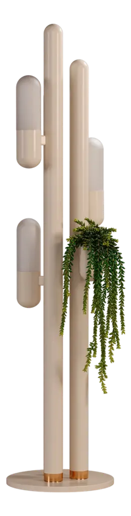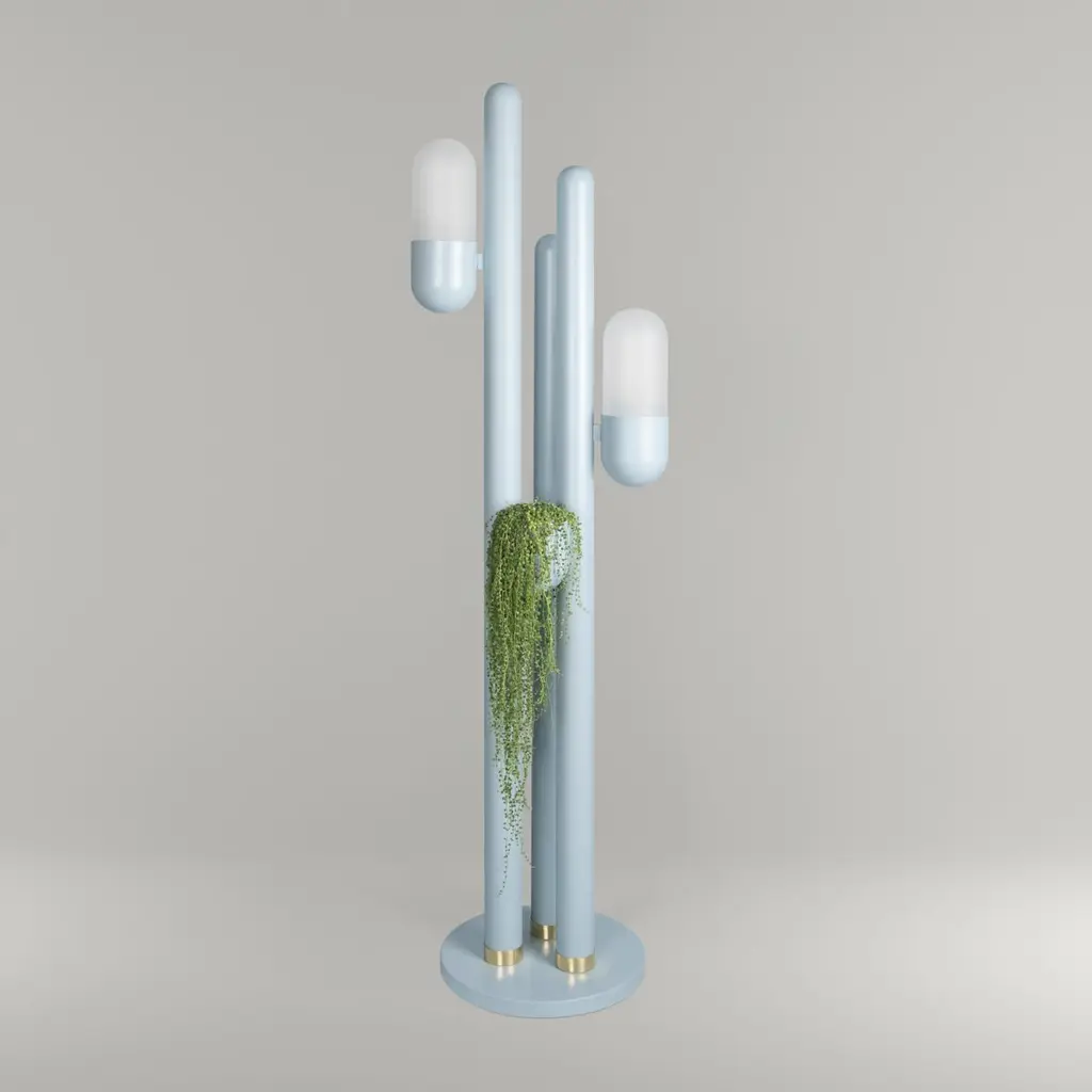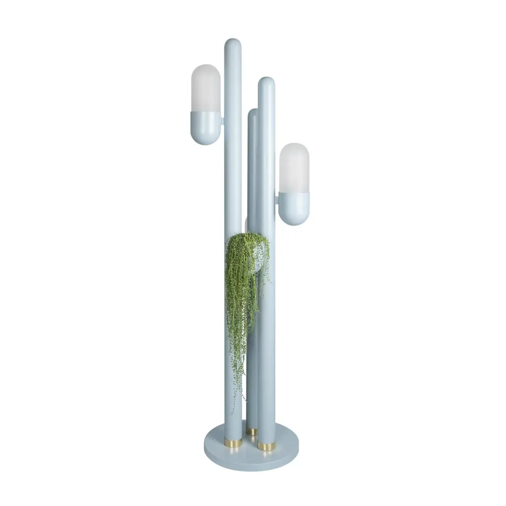 Cacti, belonging to the succulent family, exhibit a remarkable adaptation to thrive in the deserted regions of America. Their distinctive characteristics include thick, fleshy stems, often adorned with spiny projections that provide a singular charm appearance. Creativemary designers conceived a stunning suspension lamp of lighting inspired by the striking and intricate forms of the cactus plant.Crafted from metal and featuring opal glass lampshades, this unique floor lamp captures the organic essence of the cactus. The body of the Cactus Floor Lamp is shaped like a cactus stem that catches the light and keeps your favorite plants.
