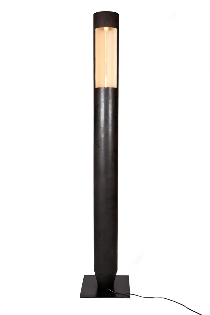 Floor lamp made of rough steel which is patinated. Inside covered with white chalk paint.Transparent led lamps inside.