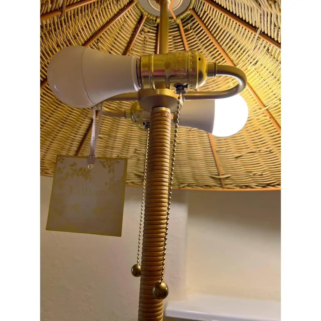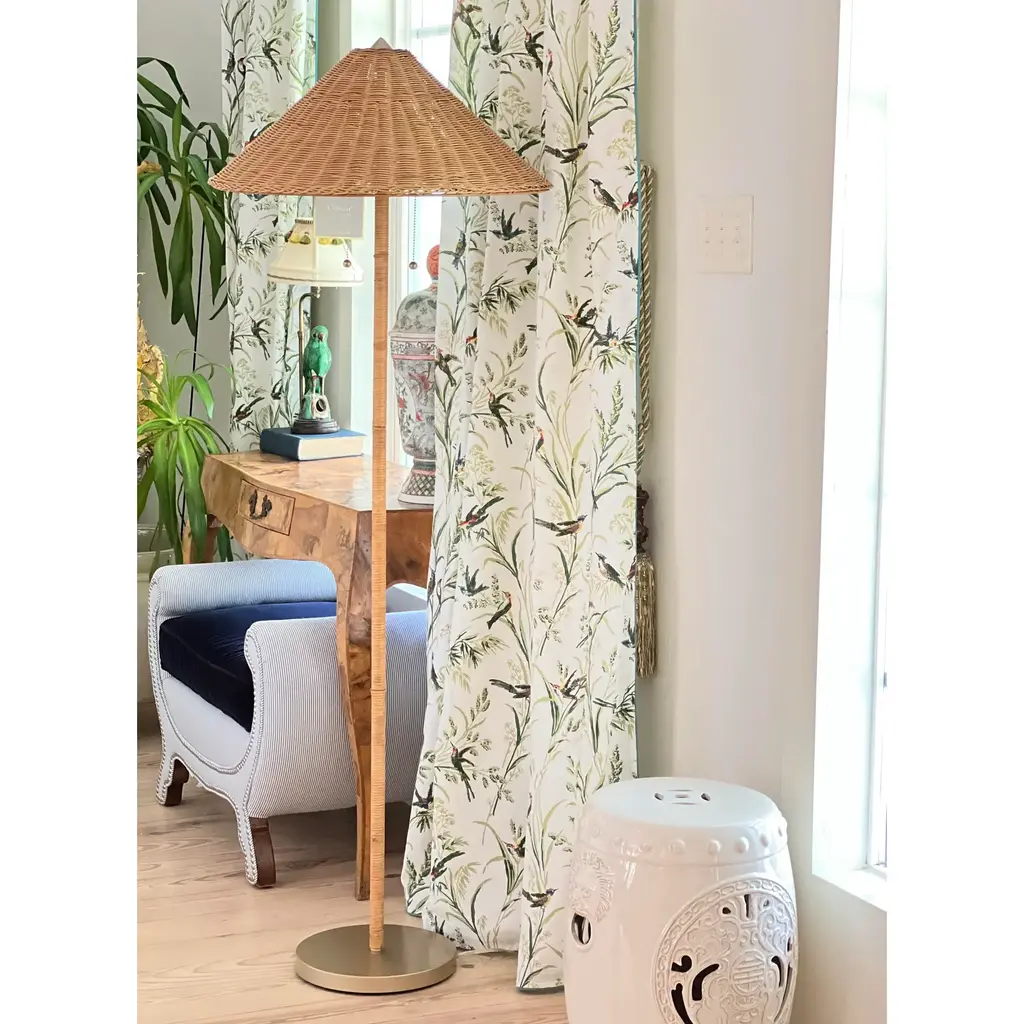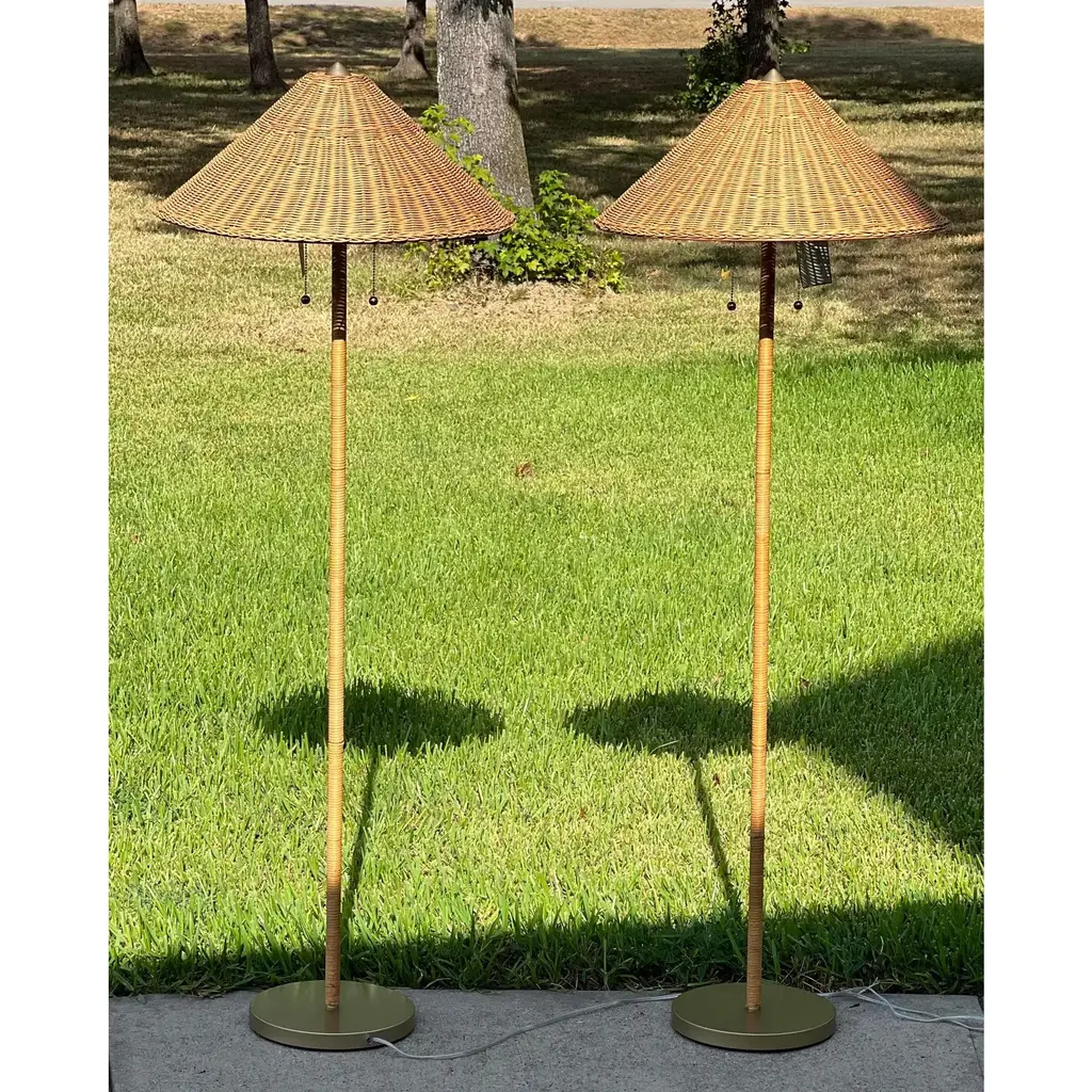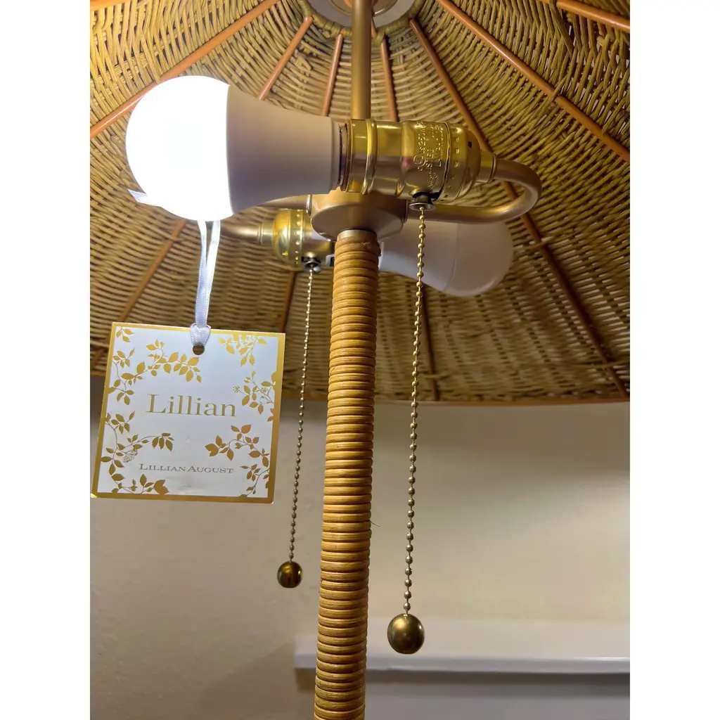 Pretty lamp giving coastal vibes! Freshen up your room's aesthetic with this Lilian August Floor Lamp. Standing over 5 feet tall with a natural handwoven rattan cone shade and wrapped rattan base, this light fixture will show well in a modern, coastal or farmhouse setting. It's outfitted with double pull chains and offers easy access from either side. Also allows you to control the brightness depending on the mood/activity. Base is a subtle painted brass finish. -Lamp comes boxed and a very simple assembly is required, instructions included. -3 way switch -maximum: 60w bulb, type A included: 9w LED bulb -22in W (shade) x 63in H, 5ft cord length -2 matching available and priced separately