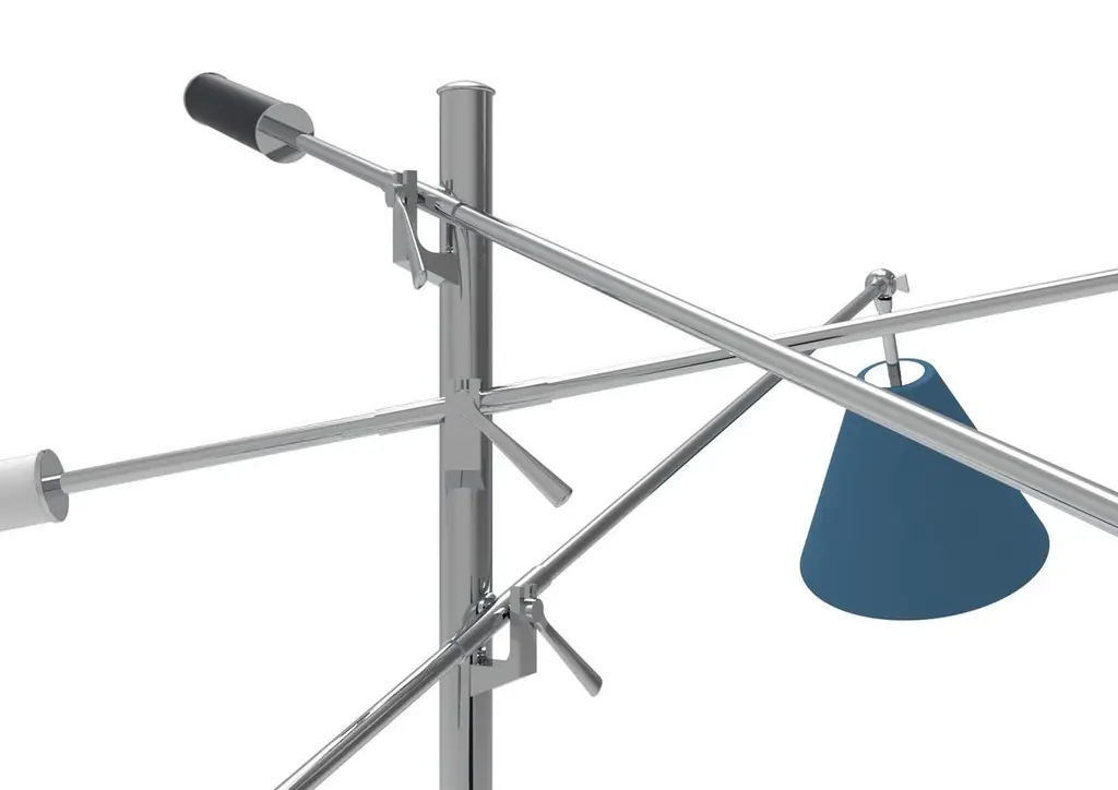 Icon of Arredoluce, symbol of an era and source of inspiration for many objects to follow over time, Triennale is perhaps the best known project by Angelo Lellii. Presented at the VII Milan Triennale in 1947, it is a floor lamp with a chromed linear structure and three adjustable arms, each ending with a diffuser colored in light blue, black or white. New edition 2019. On-off lighting control. Bulbs included (7W - 230V - E27 LED dimmable - 2700K - 806 lm).