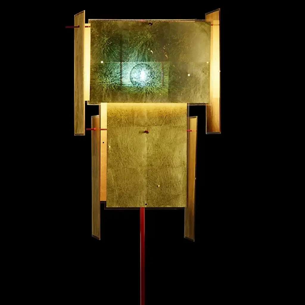 The 24 Karat Blau Floor Lamp from Ingo Maurer features eight metal plates infused with gold leaf, each hand-cast in acrylic using a special Japanese technique. A 200 cm red plug-in cable and pull switch add character and function. The result? A unique glow where yellow-gold light reflects off the surfaces while only short-wave blue light passes through the layers—creating a stunning visual effect, even when paired with an LED filament bulb.