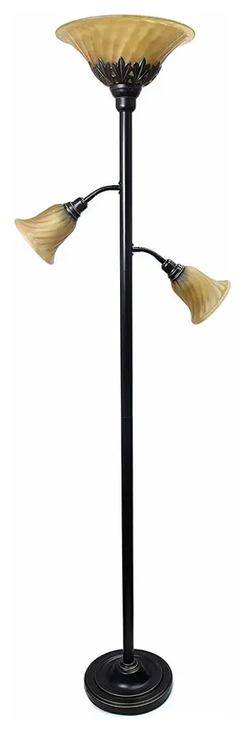 Elegant Designs 3 Light Floor Lamp with Scalloped Glass Shades, Restoration Bronze.Light up your bedroom, office, foyer or living room with this elegant yet affordable 3 light floor lamp. It features a stunning restoration bronze finish and marbelized champagne shades with spiraled cut glass to complete the timeless look.Restoration Bronze FinishChampagne Scalloped Glass ShadesMain Light Uses: 1 x 100W Medium Base Type A bulb (not included)Reading Lights Use: 2 x 60W Type A Medium Base Bulbs (not included)Dimensions; L: 13" x W: 21.5" x H: 71"Some Assembly RequiredUL/CULBulb Type: IncandescentSwitch Type: RotarySwitch Location: Lamp holder (controls all 3 lights, each click turns on until all are on)Shade Diameter: Main: 13"Small shades: 5.5"Shade Top Opening: 13"Shade Height/Slant: 8" Main5 inches smallShade Security: socket nutsNumber of Lights: 3Shade Material: glassCord Color: BlackPrimary Material (Leather,Metal,Wood): MetalBase Type: E26Medium BaseBase Dimensions:Base diameter: 10.5"Height 67"Height from Base to Shade:Top: 66"Middle: 55.5"Bottom: 49.5"Bulb Included: No