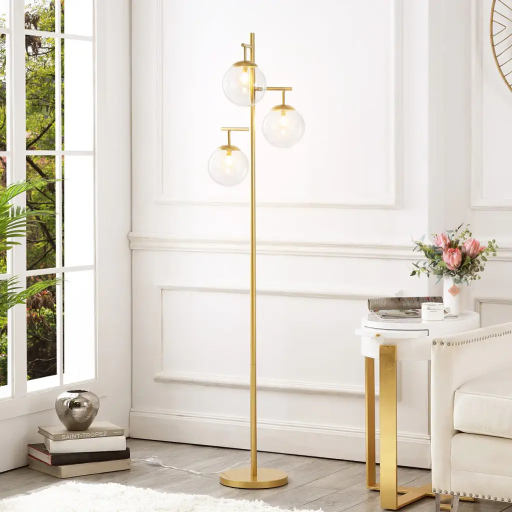 3-Light Gold Tree Floor Lamp With Glass Globe Shades, Clear Glass Shades