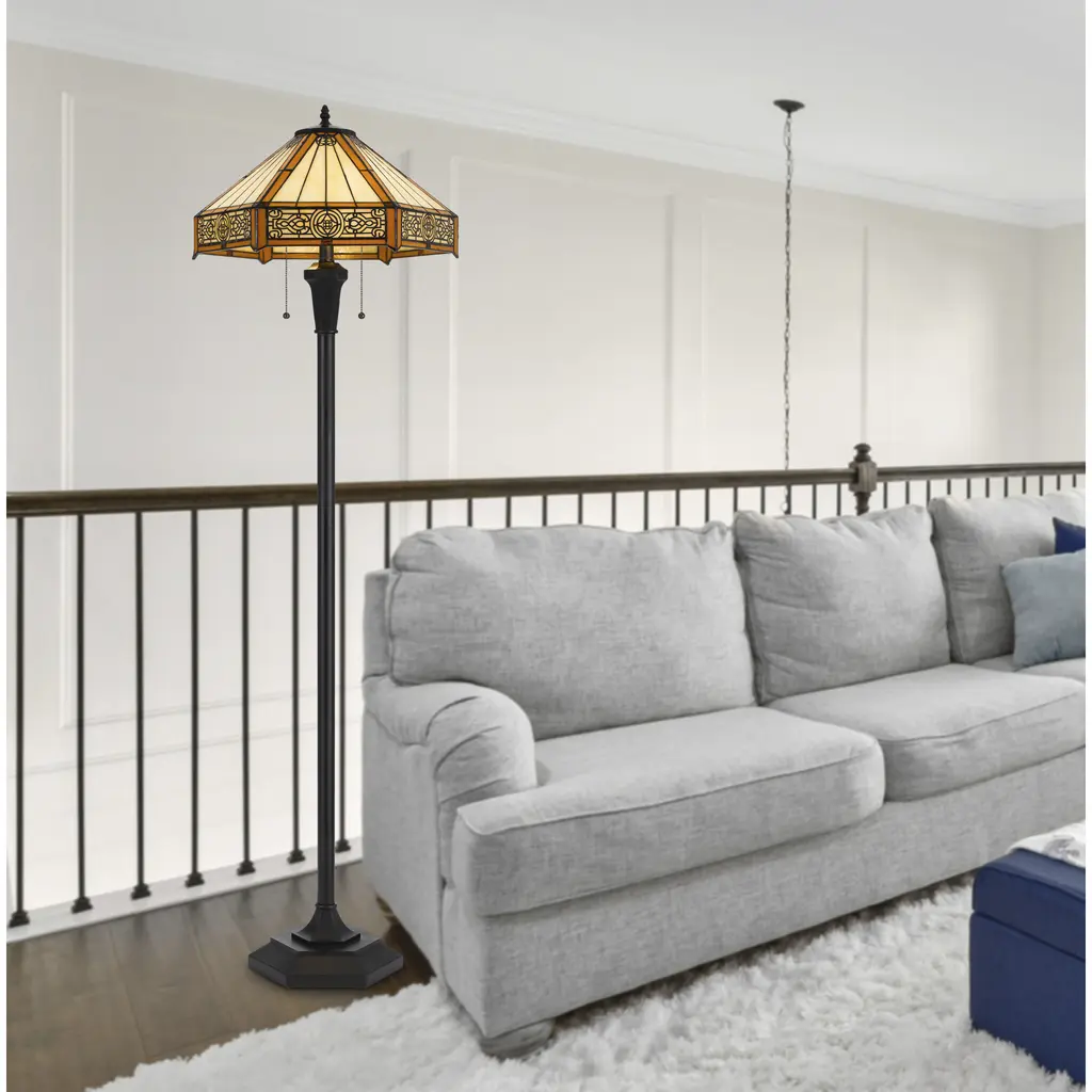 Add a pop of color to your home with this stained glass tiffany floor lamp. It features a dark bronze body with metal and resin accents along with a weighted base for added stability. This lamp is sure to make a great addition next to your favorite chair or sofa.