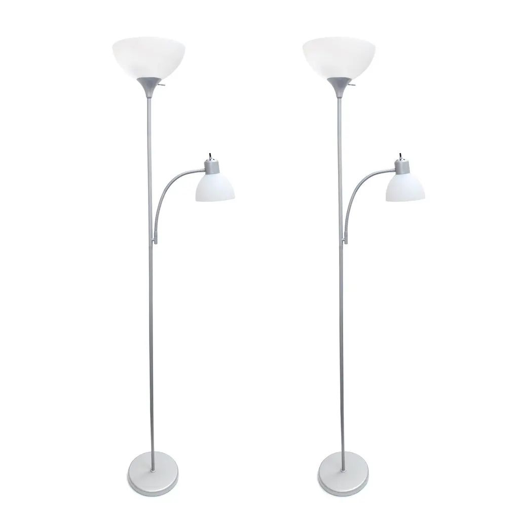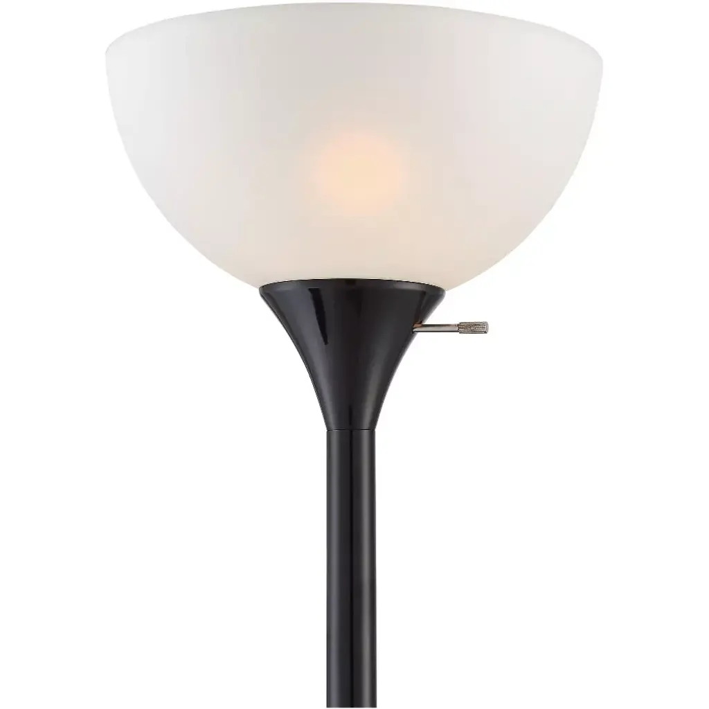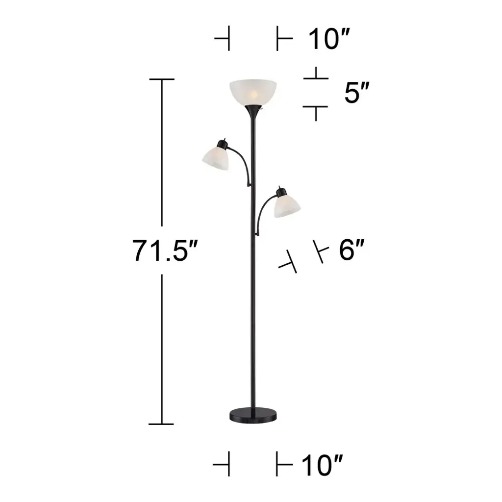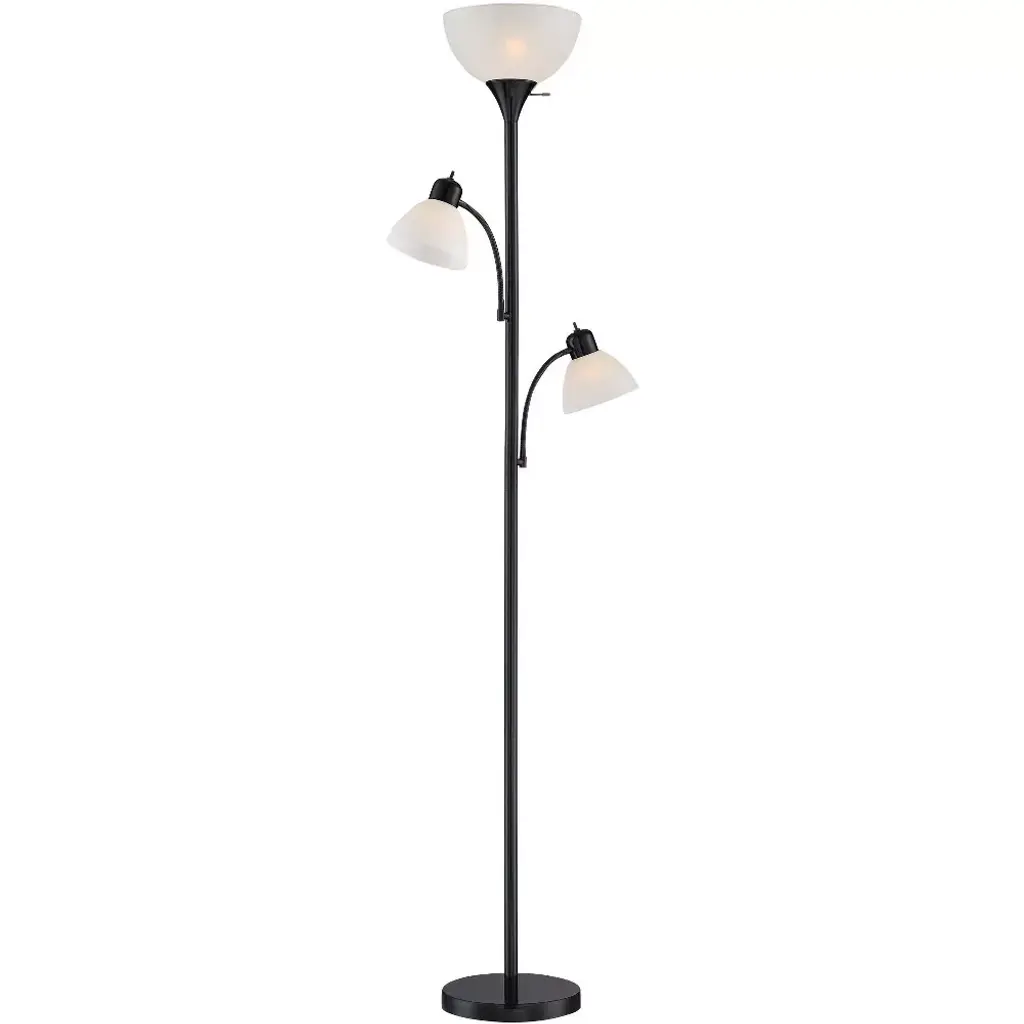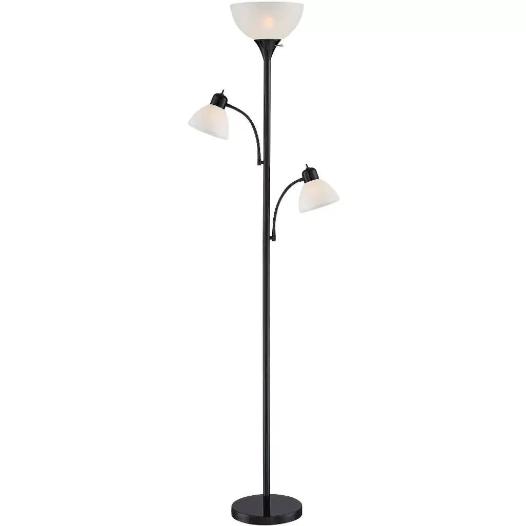 The three lights of this sleek torchiere floor lamp offer ample illumination for any space in your home. The metal design features an all-black finish paired with white plastic shades. An individual on/off switch for each light allows you to control the light output to create the ideal lighting solution for your room.