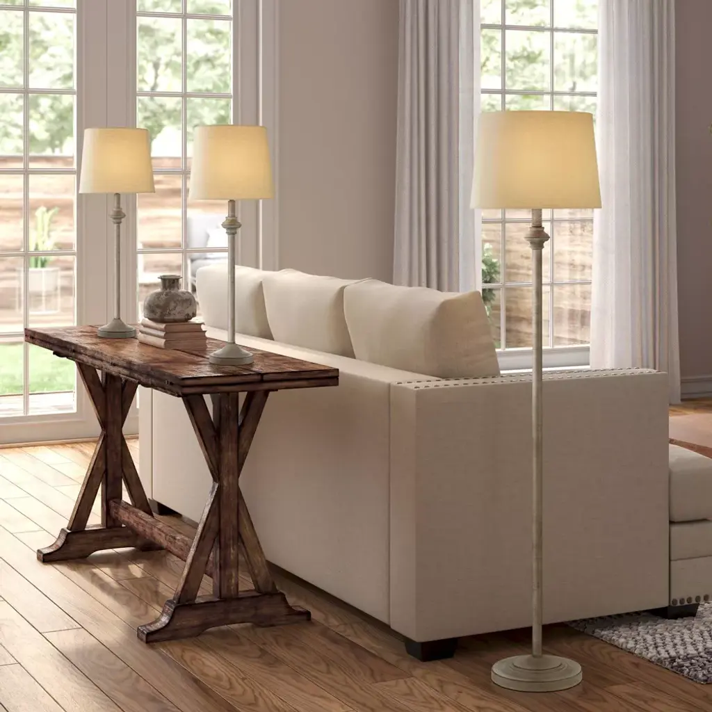 From the 360 Lighting brand, this three-piece lamp set comes with one floor lamp and two table lamps in a matching elegant style. Each lamp comes in a beige finish metal frame, topped by a cream fabric drum shade. An on-off switch is located on the socket of each piece. Perfect for spacious living rooms, bedrooms, and more.