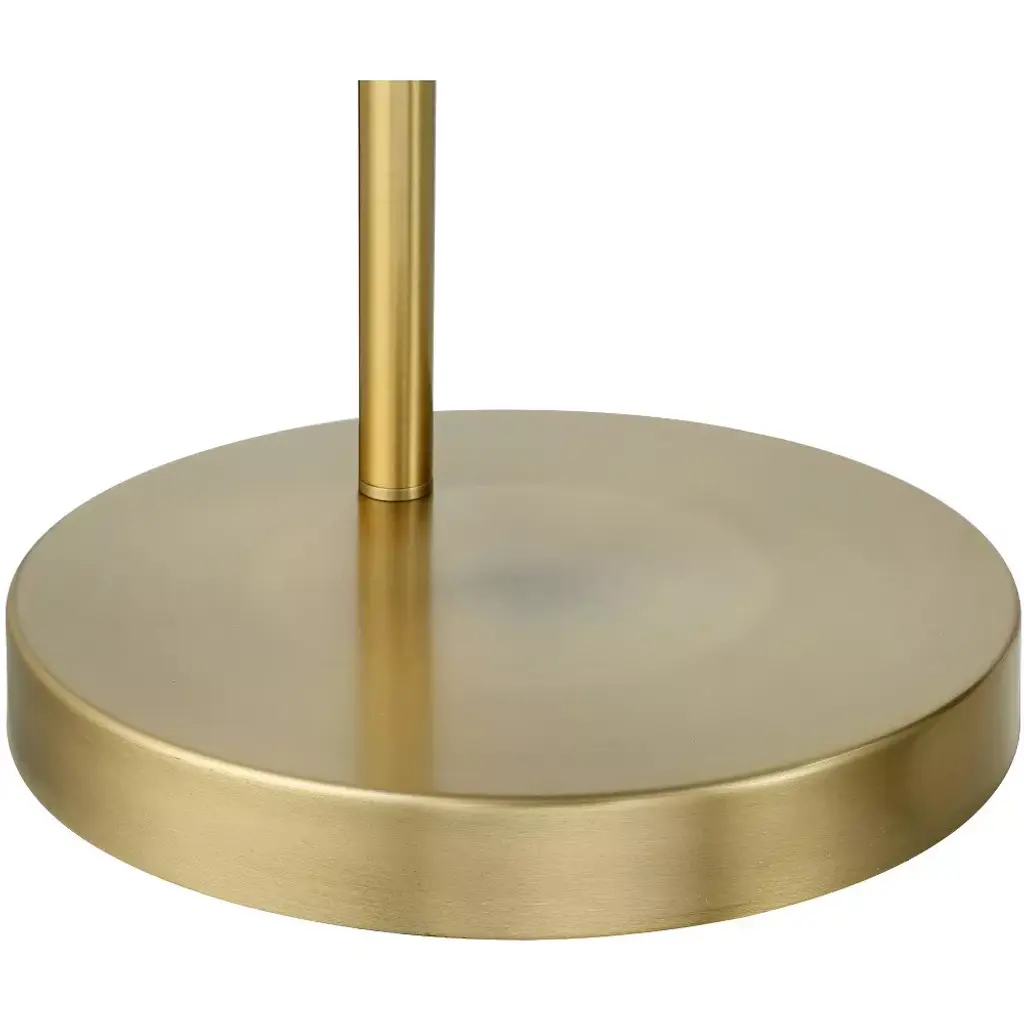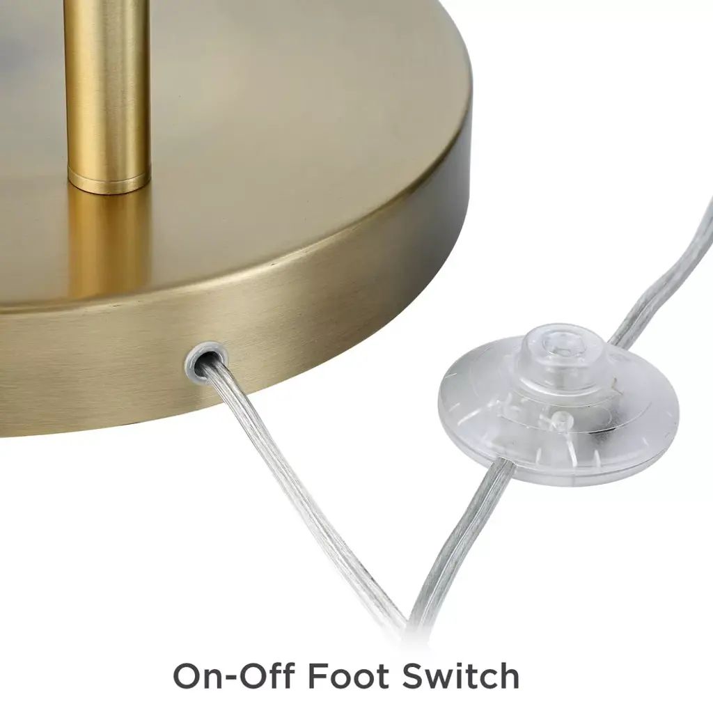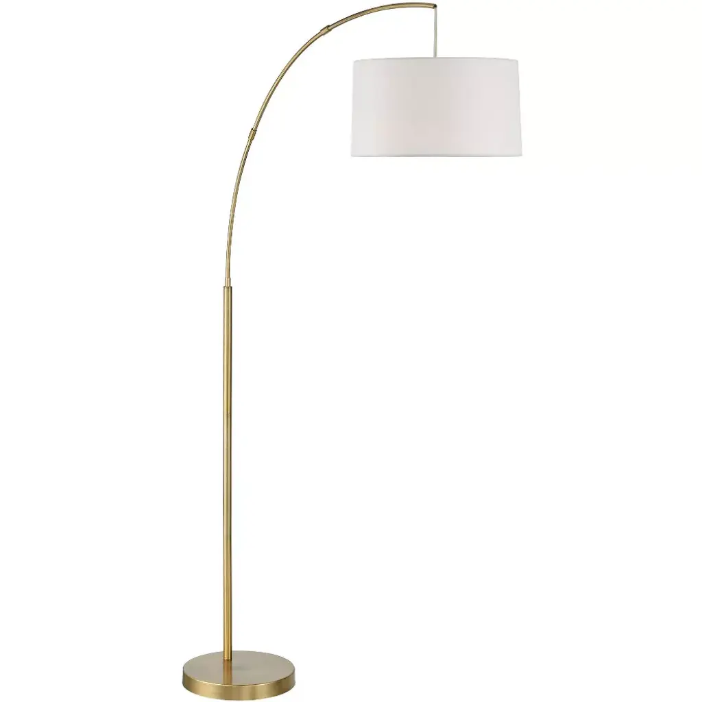 From the 360 Lighting brand, this elegant arc floor lamp offers contemporary styling for your home. It features a widely arching frame in a lovely brass finish and a white linen drum shade on top, resulting in a sleek modern look. A great upgrade for seating areas and living rooms, this floor lamp is great for reading task lighting.
