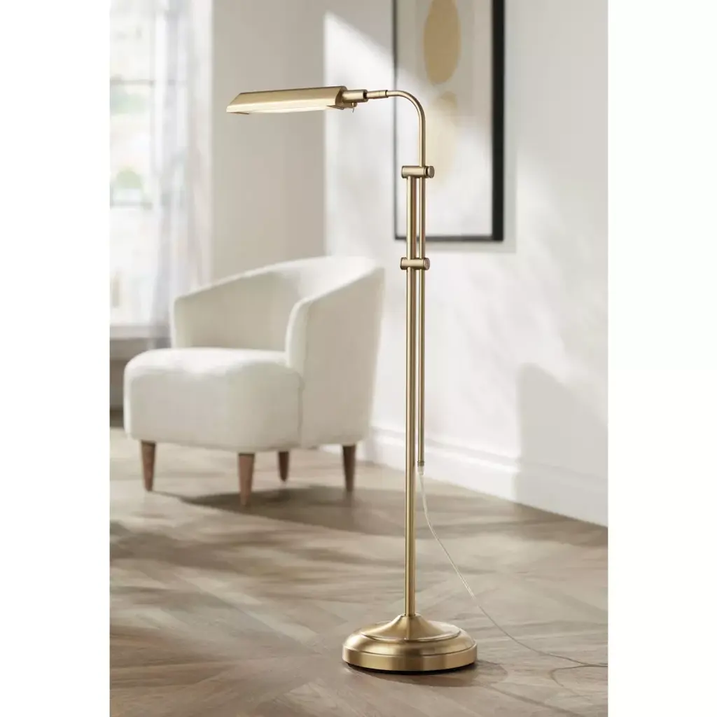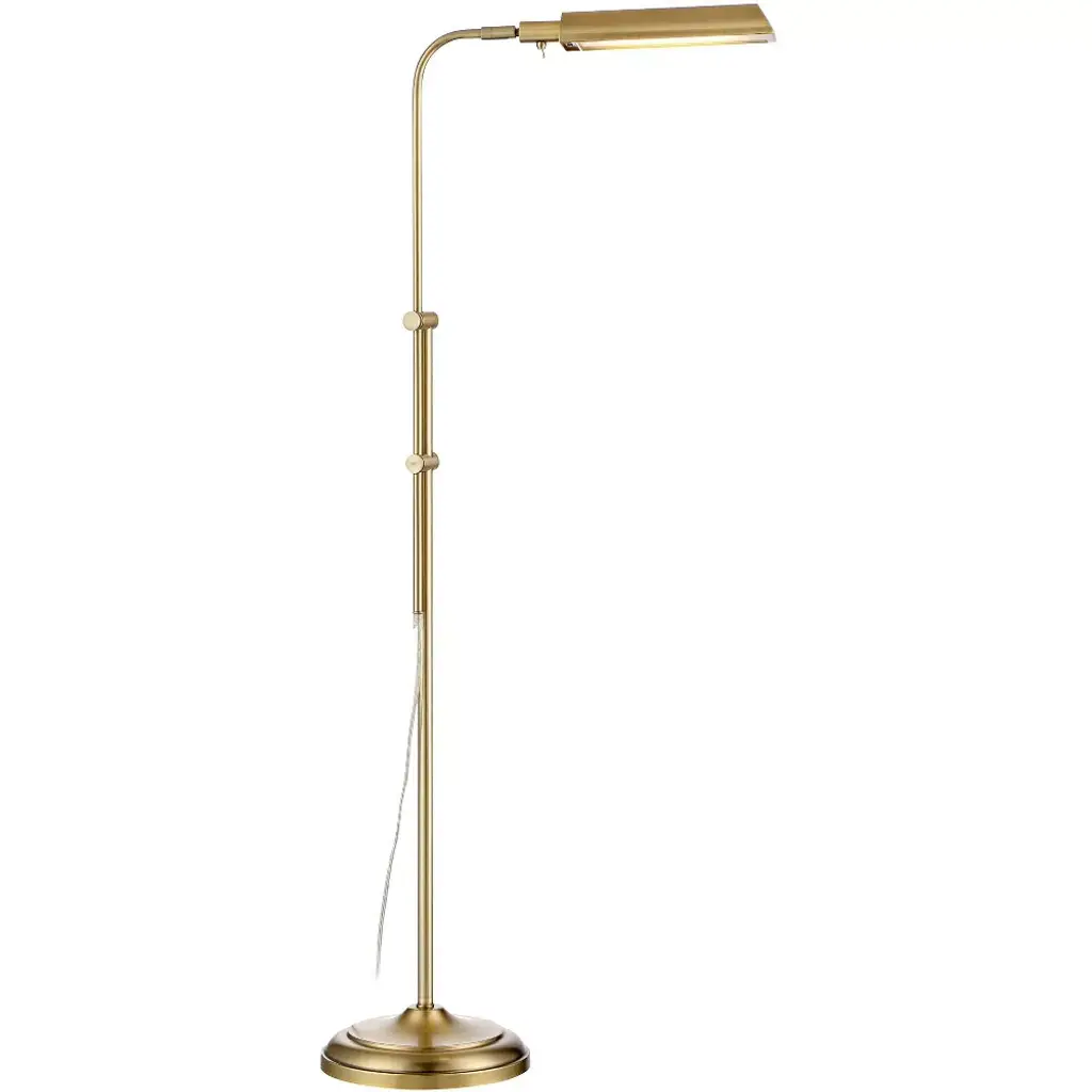 Designed for excellent lighting, this plated brass pharmacy floor lamp is a useful addition to a home office or living room area. It delivers energy-efficient LED illumination with a built-in light and has an adjustable height feature. This lamp is accented with a toggle switch and clear cord for easy usage.