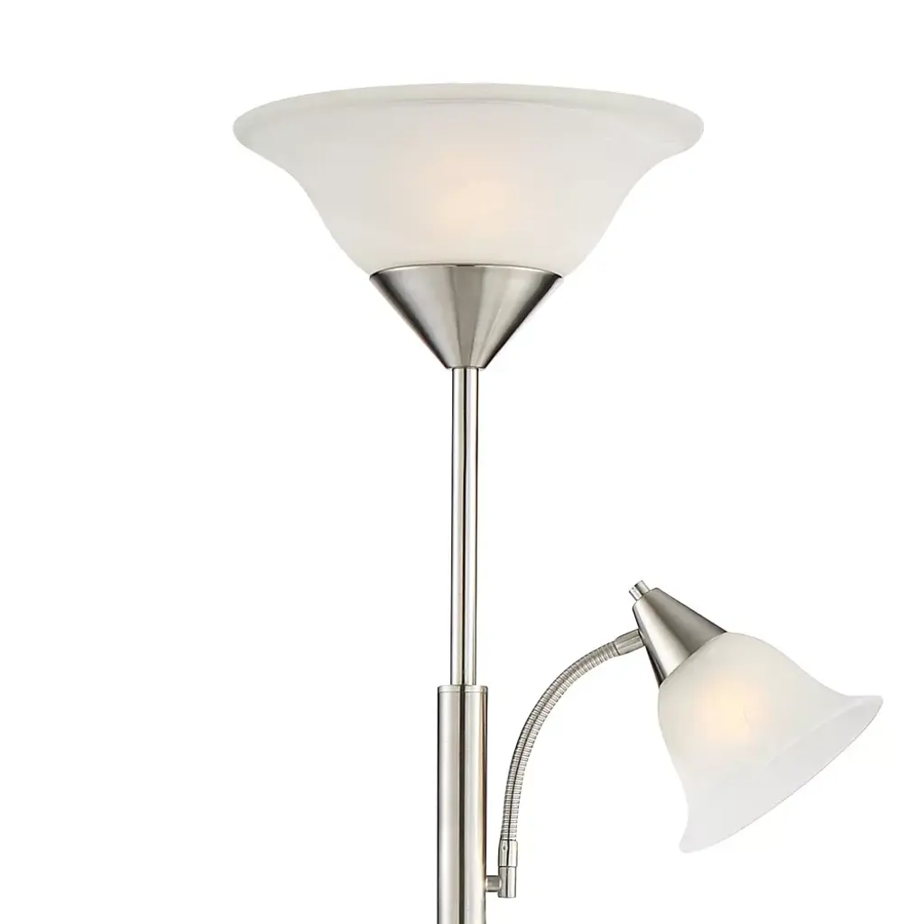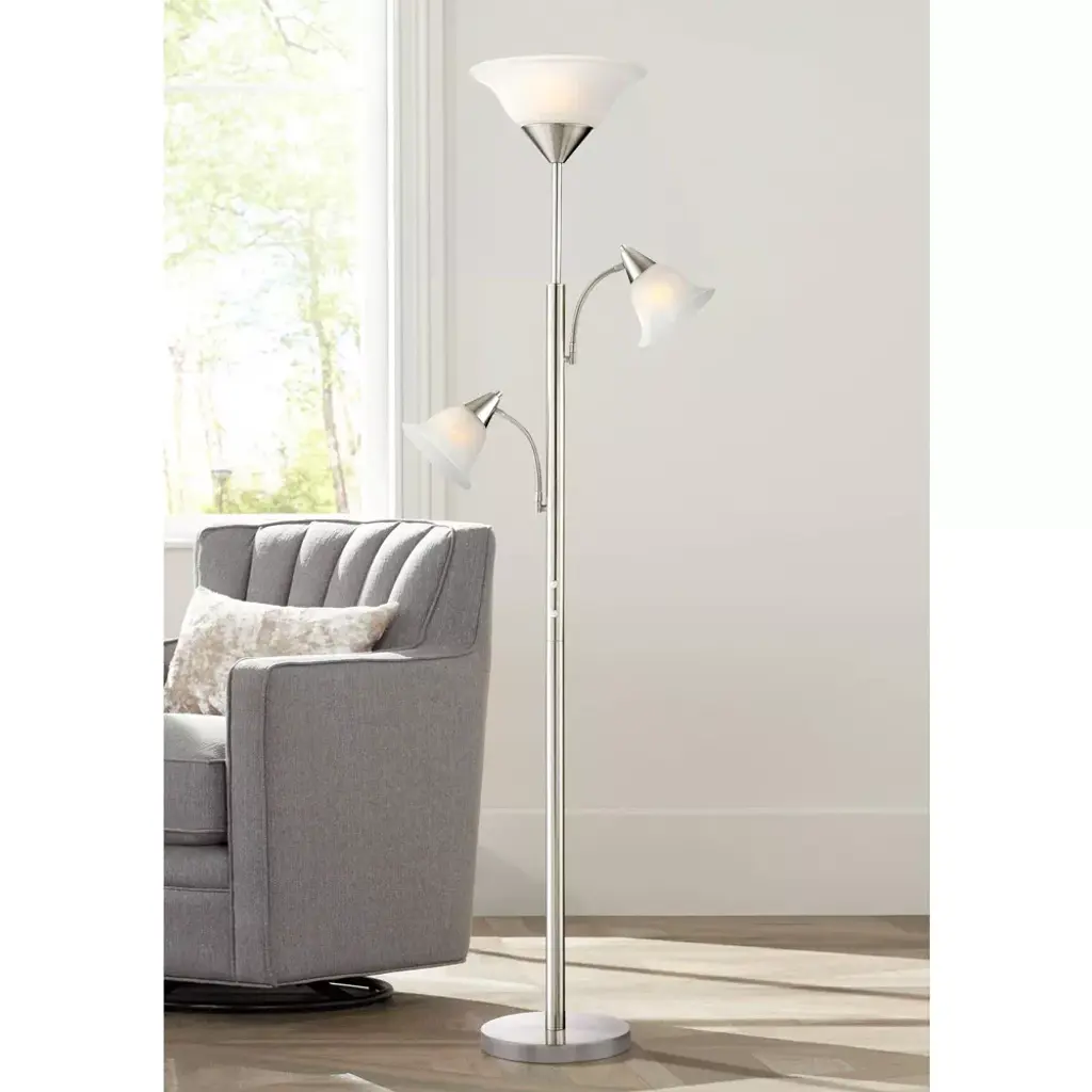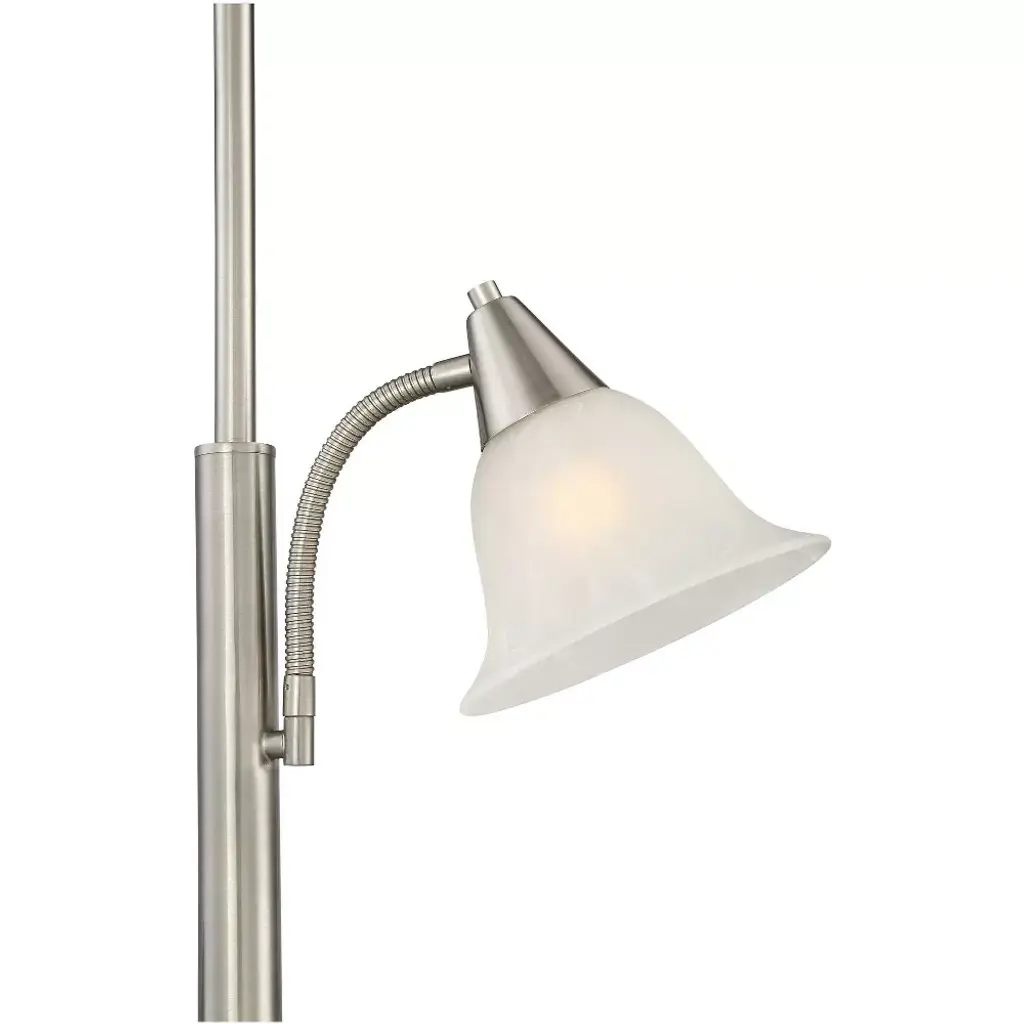 Value-priced from the 360 Lighting brand, the design comes in a sleek brushed nickel finish to the pole, lamp arms and round base. Adjustable gooseneck arm side lights provide bright reading lights. The design features alabaster glass shades that provide a soft glow. There is an on-off switch for the top light. Side lights are controlled by a 4-position switch that turns on the left light, turns on the right light, both on, both off.