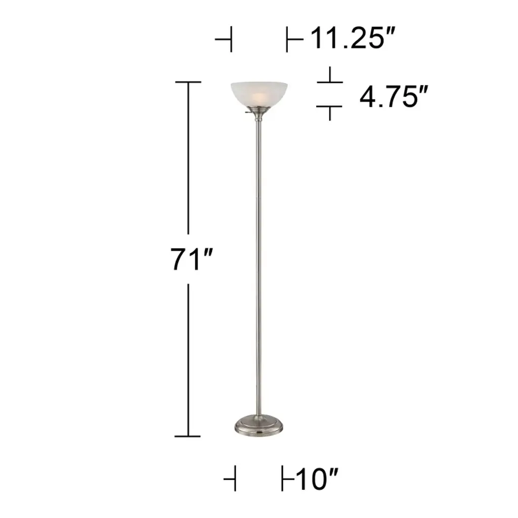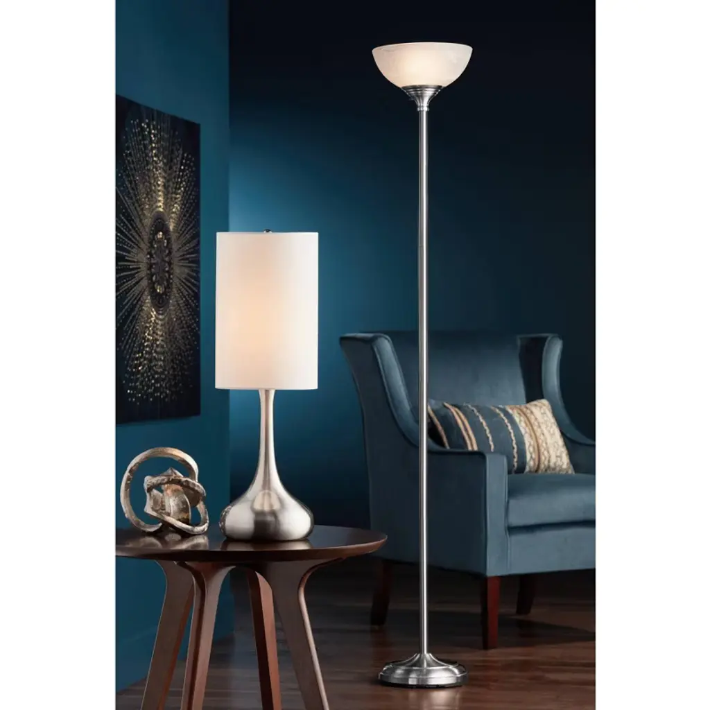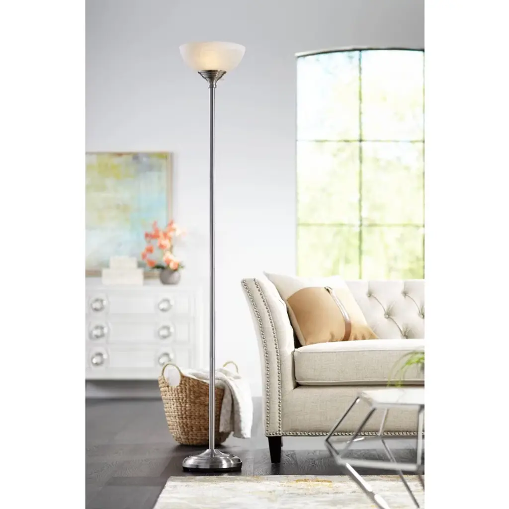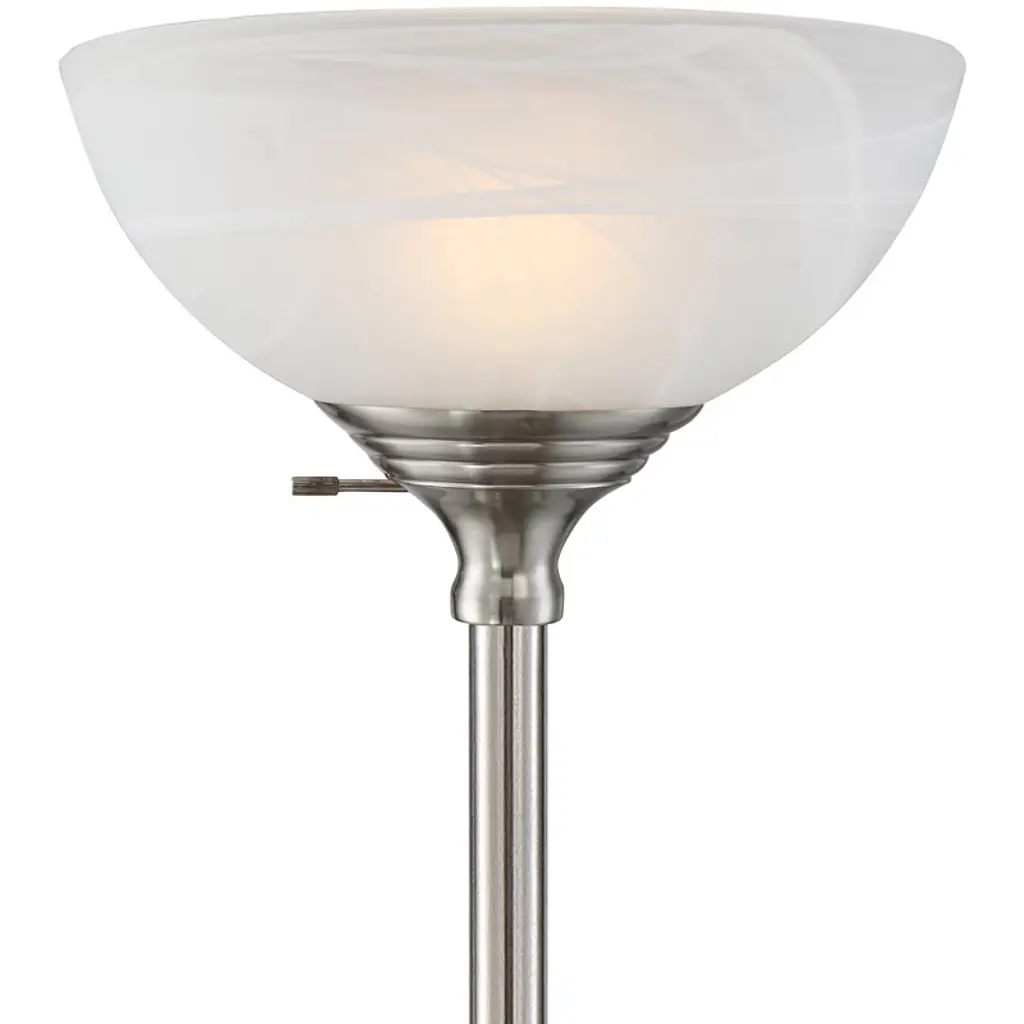 This sleek, modern torchiere floor lamp has a minimal design and slender construction. From the 360 Lighting brand, the design features a satin nickel finish that brings a sense of sparkle and elegance to your space. An alabaster glass shade rests atop the lamp to cast the ample upward light that makes torchiere lamps stand out from others. A great choice for general room illumination.