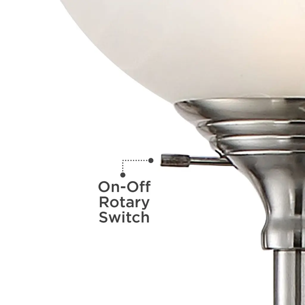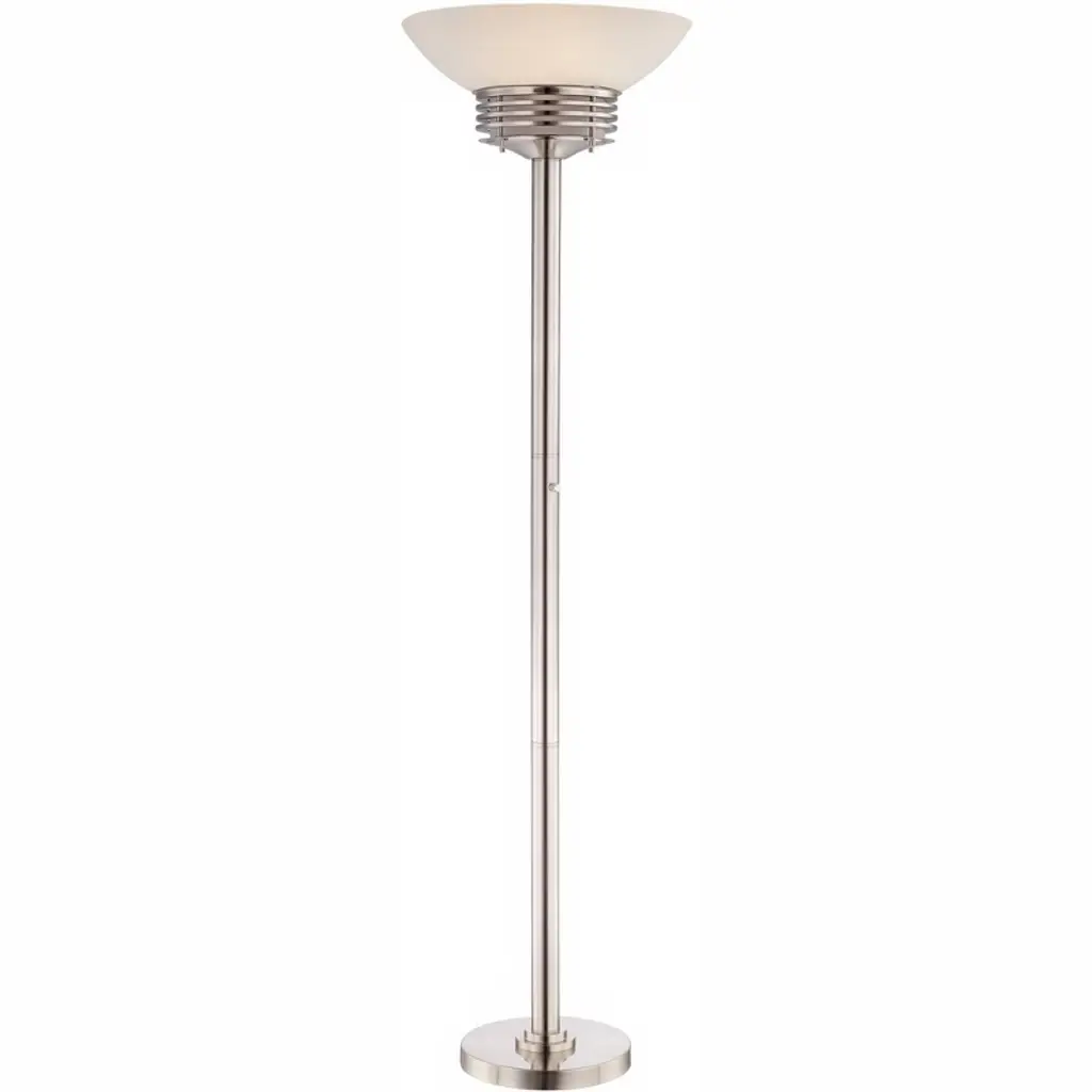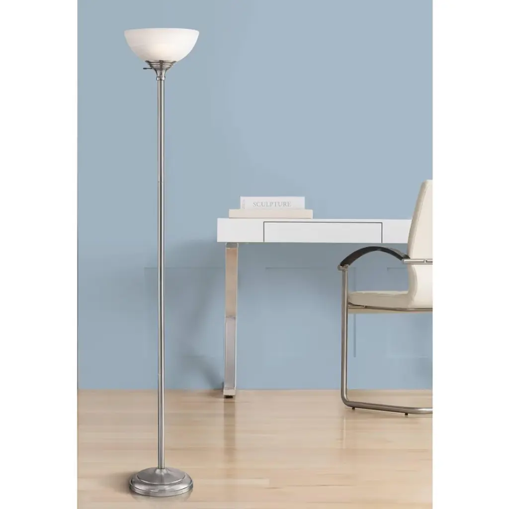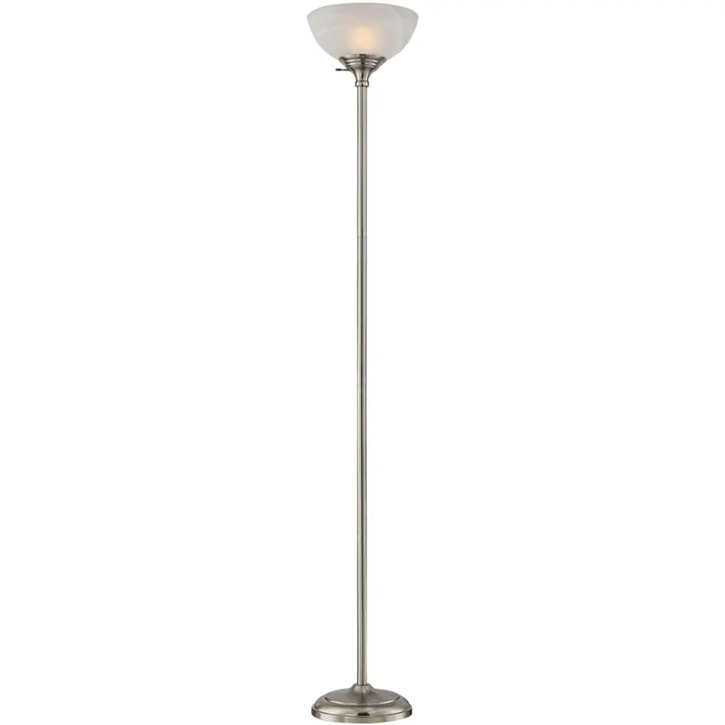 This sleek, modern torchiere floor lamp has a minimal design and slender construction. From the 360 Lighting brand, the design features a satin nickel finish that brings a sense of sparkle and elegance to your space. An alabaster glass shade rests atop the lamp to cast the ample upward light that makes torchiere lamps stand out from others. A great choice for general room illumination.