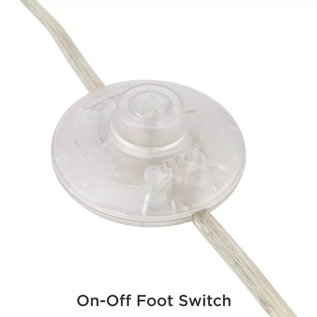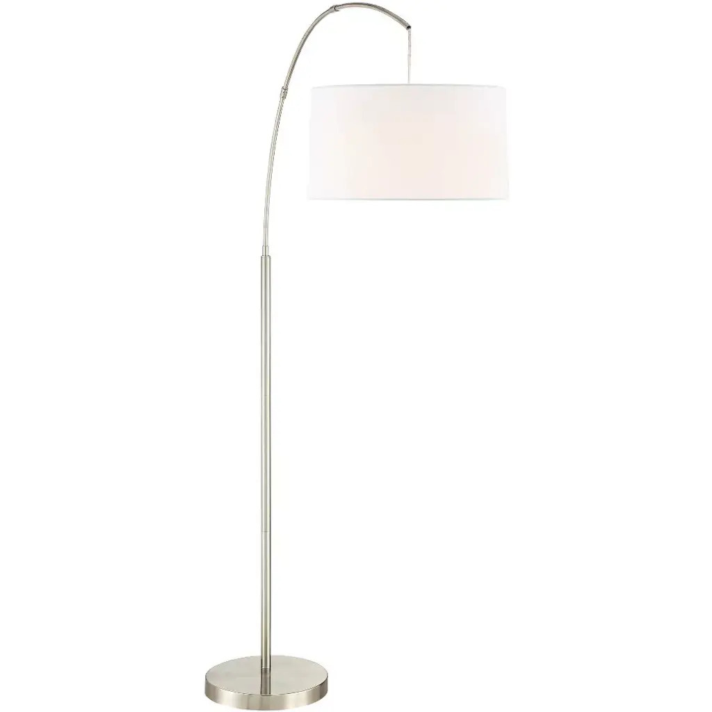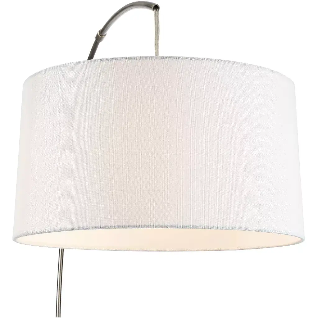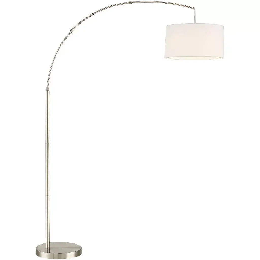 From the 360 Lighting brand, this elegant arc floor lamp with a USB dimmer offers contemporary styling for your home. It features a widely arching frame in a brushed nickel finish and a white linen drum shade on top, resulting in a sleek modern look. A great upgrade for seating areas and living rooms, this floor lamp is great for reading task lighting. The tabletop dimmer works with dimmable CFL and dimmable LED bulbs, as well as halogen and incandescent bulbs, and it also comes with a built-in USB port, allowing you to easily charge phones and other devices.