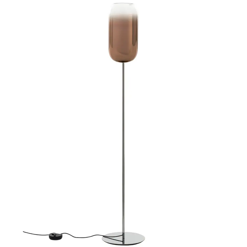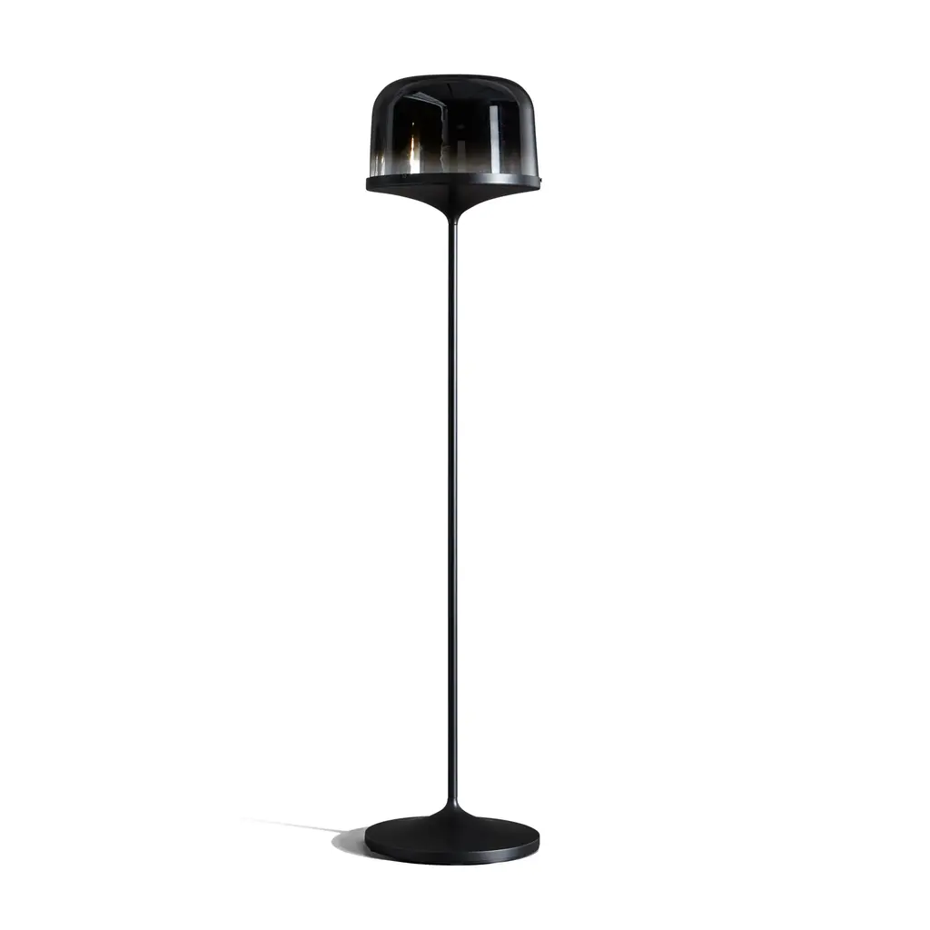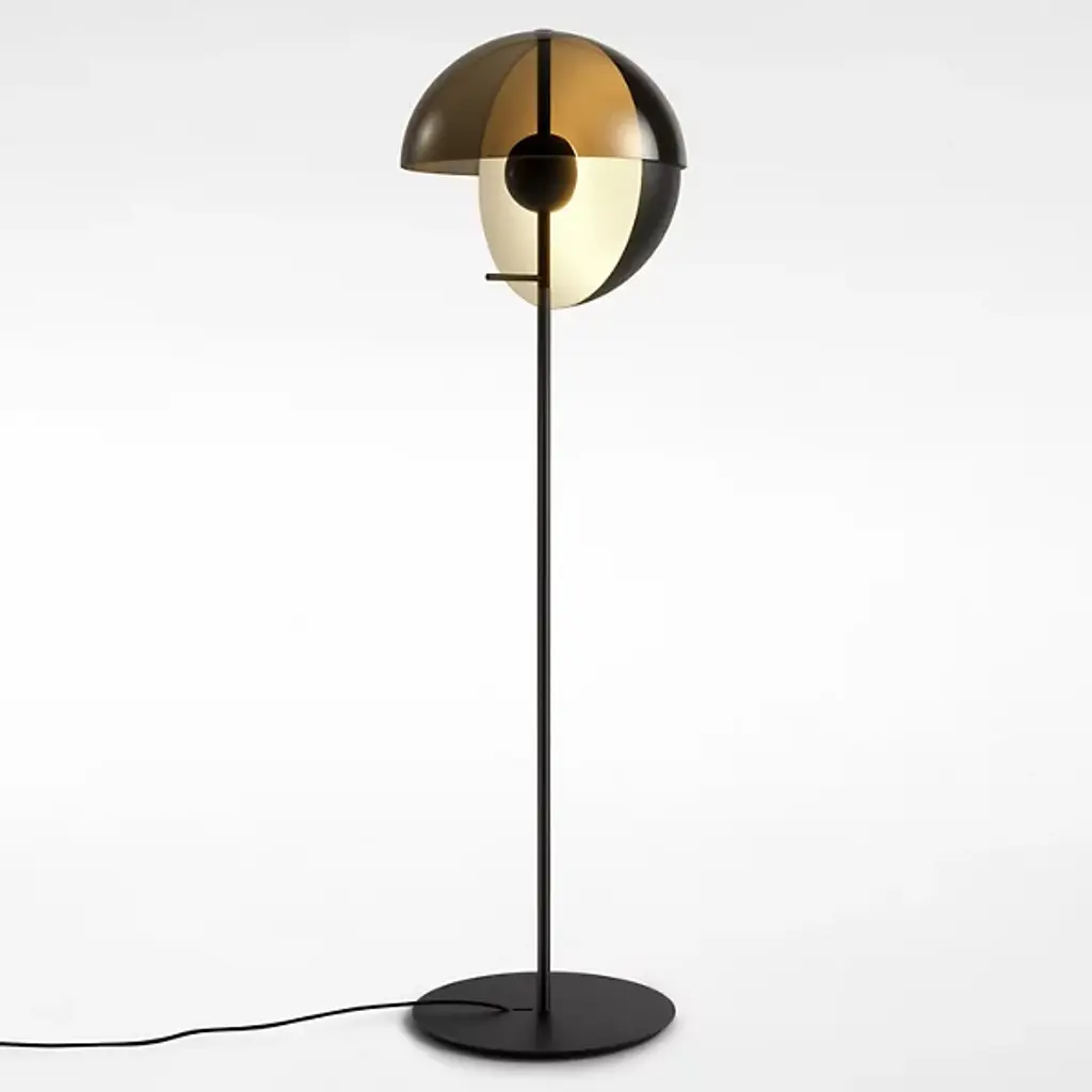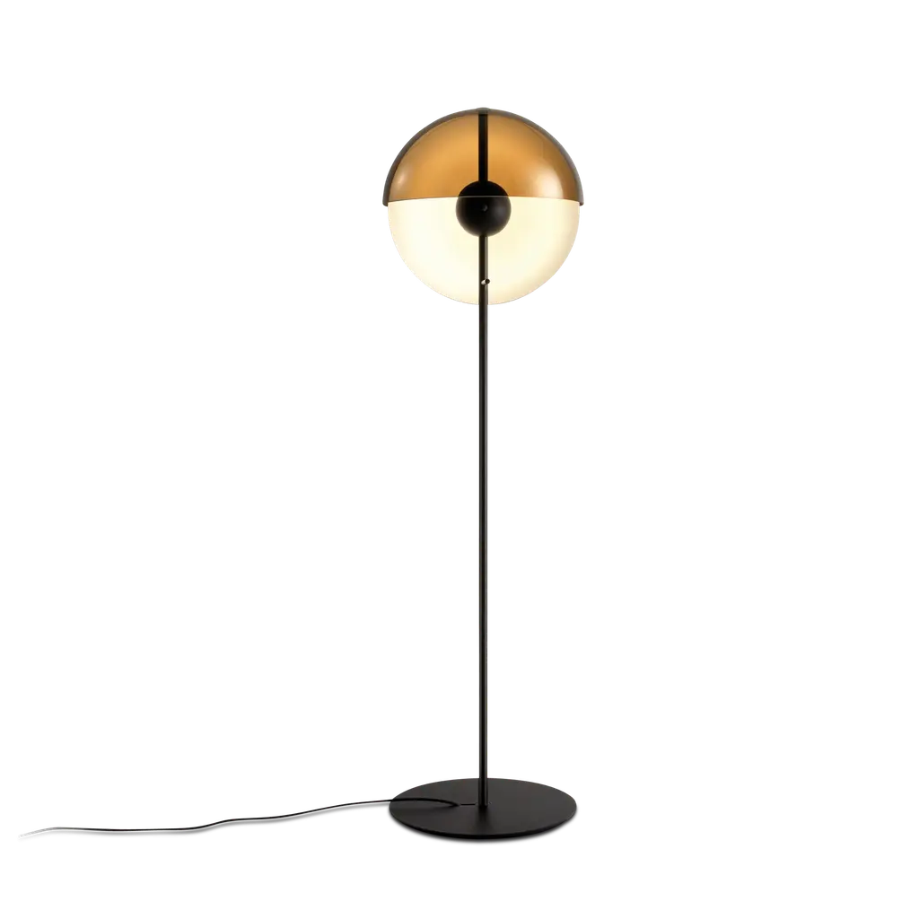 The harmonious and luxe design of this floor lamp will be a splendid addition to a modern interior, where it will be a functional source of light in a living room or study, while also being a sculptural decoration echoing organic shapes. Comprised of a circular base and streamlined stem, the lack-lacquered iron frame is equipped with three couples of bulbs (E14) each housed in an enveloping shade lined in prized gold leaf that shimmer in the light.