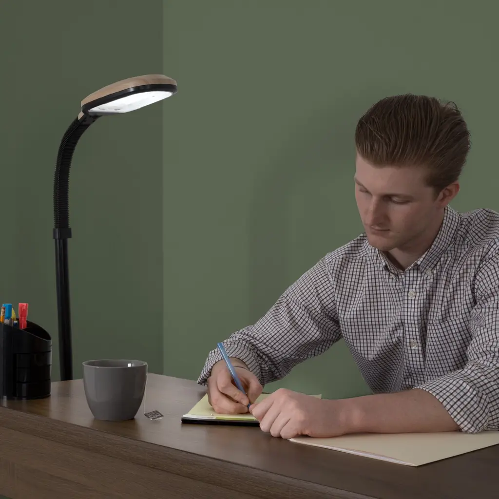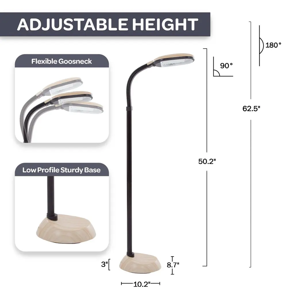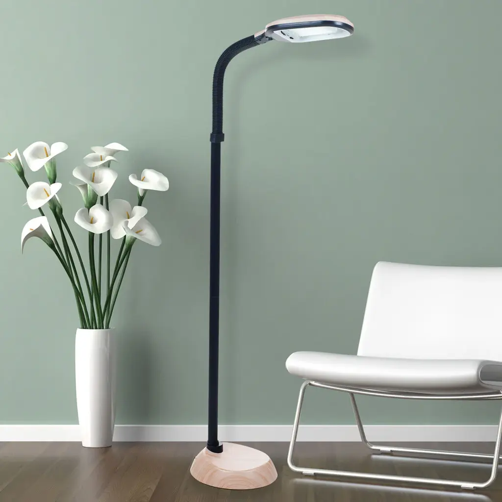 Bring stylish and modern lighting to your home, office, or workspace with the Floor Lamps by Windsor Home. This attractive reading lamp has a contemporary light woodgrain finish with a 64-inch-long cord for versatile placement. With a PL-27W bulb with a 6400K color temperature, this floor lamp projects natural light, helping to alleviate eye stress and strain. The lamp features a gooseneck arm that provides flexible height adjustment and unlimited angle choices, making it simple to focus the light exactly where you need it. A must-have addition to your office or dorm décor, this tall lamp provides full spectrum daylight hues that can brighten rooms with minimal sun exposure.