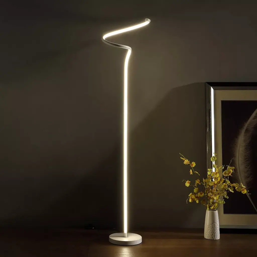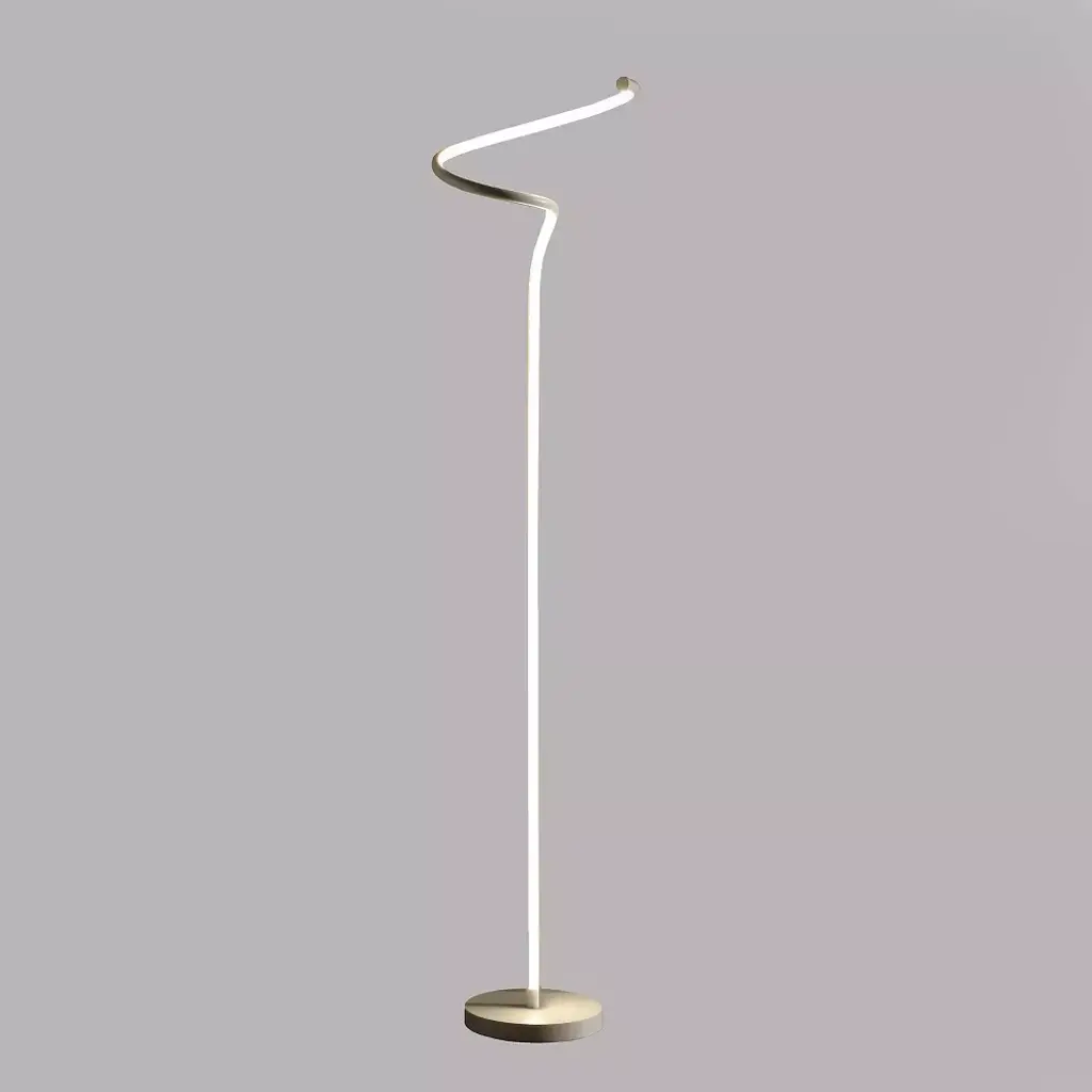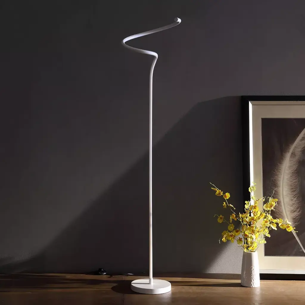 Brighten up a modern space with the stunning glow from this Curvilinear S-Curve Spiral LED Angled floor lamp. Revel in modern expressionism with the sculpture-inspired silhouette where the LED Bulb becomes part of the silhouette of this floor lamp. Constructed of metal and aluminum, the matte white finish boasts a reflective and visually striking glow. Interesting twists and curves bring a contemporary update to the energy-efficient LED light. Great for an up-to-date living room or beside a nightstand, this lamp makes a bold statement and Illuminating a living room space efficiently. A Step-On On/Off located on the Black Cord for easy access. Airy and streamlined Angled Outline Floor Lamp is an easy fit in any space, with a slim, round shaped base that fits easily into corners or tight spaces next to a sofa. The design makes a great light source next to any living spaces, or use in an office setting as a bright work light. Integrated LED fixtures come built in into the fixture. They are designed to provide a specific color and Lumen output and they do not have typical “bulbs” that can be replaced. Integrated LED fixtures typically last for many years, often a decade or more.