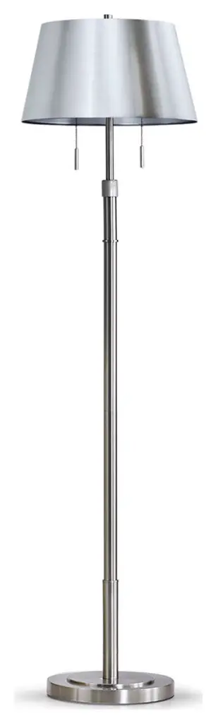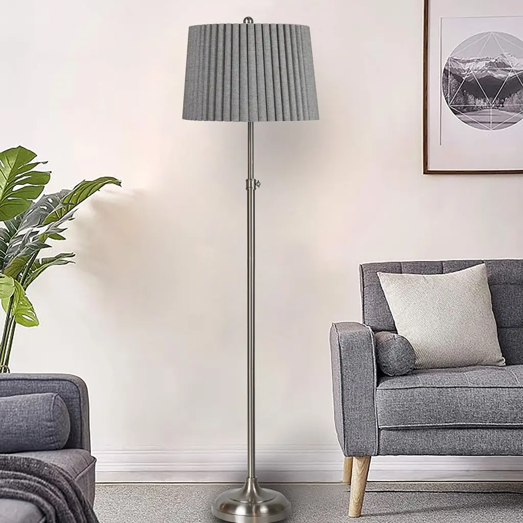 This metal floor lamp is adjustable in height from 54.75"-62". The transitional column metal floor lamp has a brushed steel finish. Its industrial & tailored design makes it varied function a real statement. The styling and finish will coordinate with all furnishings to work in every room. The grey mini fluted shade is a perfect compliment. It uses 1-100W bulb(not included), easy 3 way switch and is UL & CSA listed. Showcase your brilliant tastes through the simple, chic look this lamp possesses while accenting your favorite decor.