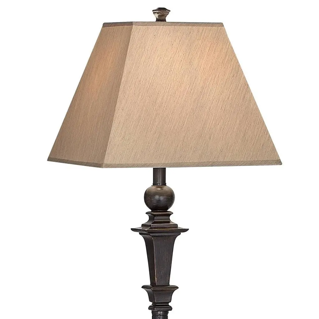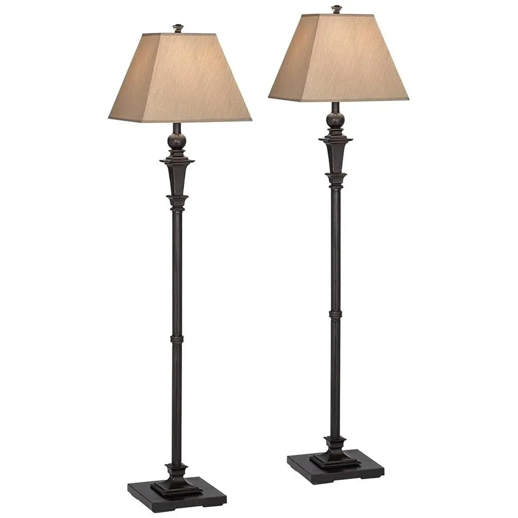 PRODUCT DETAILS: Set of 2 floor lamps. Each is 59" high overall. Bases are 10" square. Shades are 7" across the top x 14" across the bottom x 11" high. Weigh 8.8 lbs. Each uses one maximum 150 watt standard-medium base bulb (not included). On-off rotary socket switch. Set of two traditional floor lamps. Design from the Regency Hill brand. Fluted poles with decorative details. Italian bronze finish with distressed detailing. Metal construction pole and components. Cast resin construction square base. Taupe faux silk square-sided shades. 7 1/2-foot long cords. DESCRIPTION: Simple, traditional elegance describes this set of classic floor lamps. From the Regency Hill, each features a metal base with a square pedestal bottom and decorative ball fonts near the top. Finished in Italian bronze with a square hardback shade that completes the appealing look.