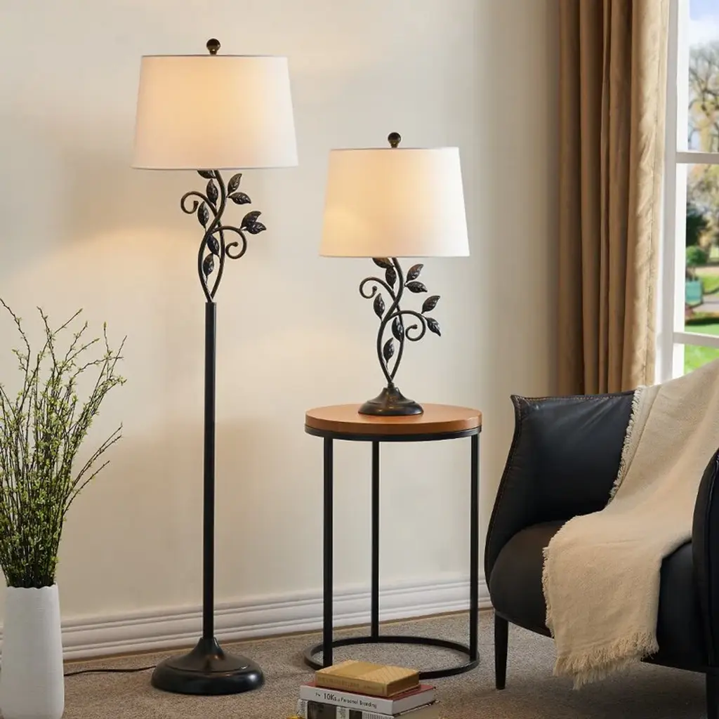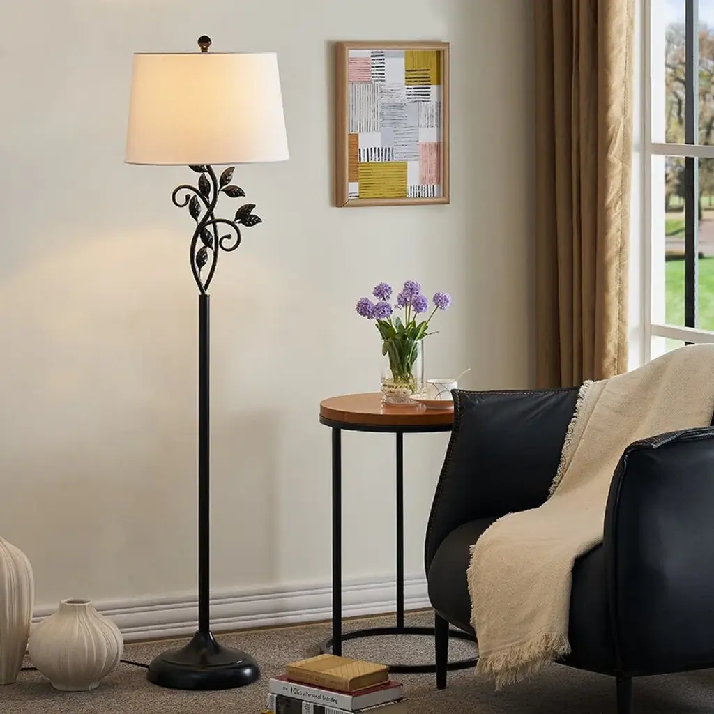 Enjoy the beauty of its classic fabric shade and leaf accents for an elegant contrast. You can place this floor lamp next to your sofa or recliner in the living room to effortlessly charm the surrounding area.Features:· A gorgeous and unique look to add life to your space· Light body design does not take up space, perfectly integrated into your space· Floor lamp table lamp with the same series, you can enrich your furniture with.· Two-color lampshade available, different light optionsProduct Details:· Bulbs not included· Switch Type: Rotary Socket;3-Way Switch· Fixture Material: Metal· Maximum Wattage (per bulb): 100 Watt· Shade Material: Fabric