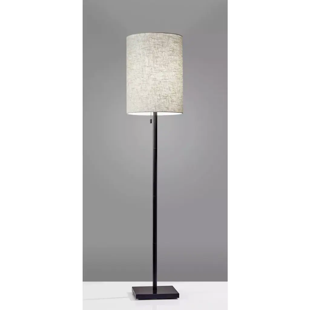 The Liam Floor Lamp is an elegant style that highlights simple materials and a classic silhouette. A thick dark bronze finished metal pole supports a natural textured fabric shade. A tall cylinder shade is contrasted by a compact square shaped metal base. A simple pull chain turns the lamp on and off. Place this floor lamp in your living room for a soft, transitional look. This lamp measures 60.5" tall and looks great along with a variety of modern décor styles.