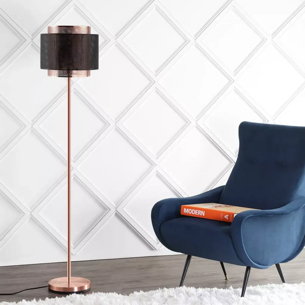 This modern metal floor lamp combines two finishes, copper and blackened metal, to stunning effect. Layered mesh drums allow enough light through to give a subtle glow, illuminating but not overpowering your space. The ideal height for beside a chair or sofa, we love utilizing this floor lamp for a home office or living space.