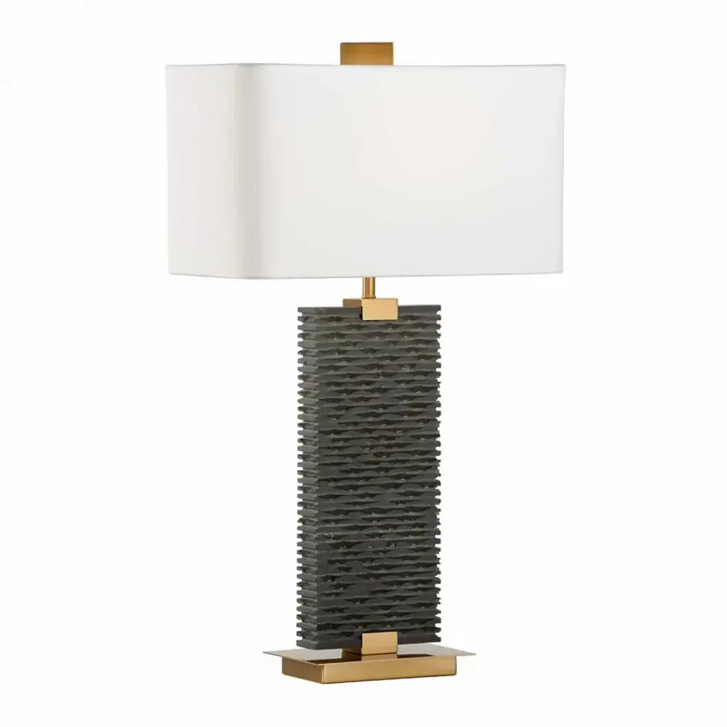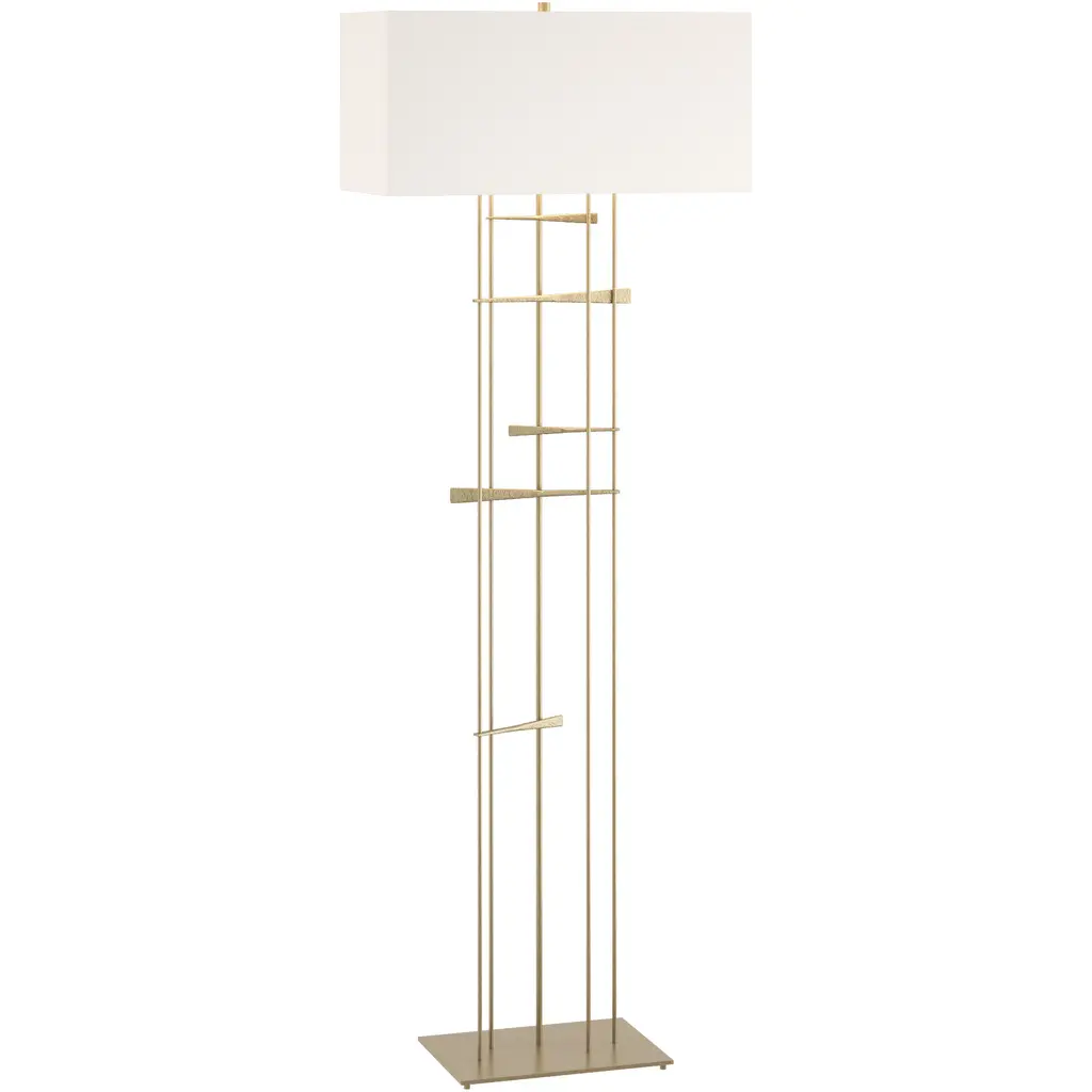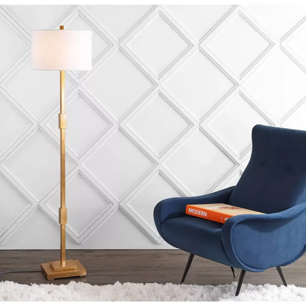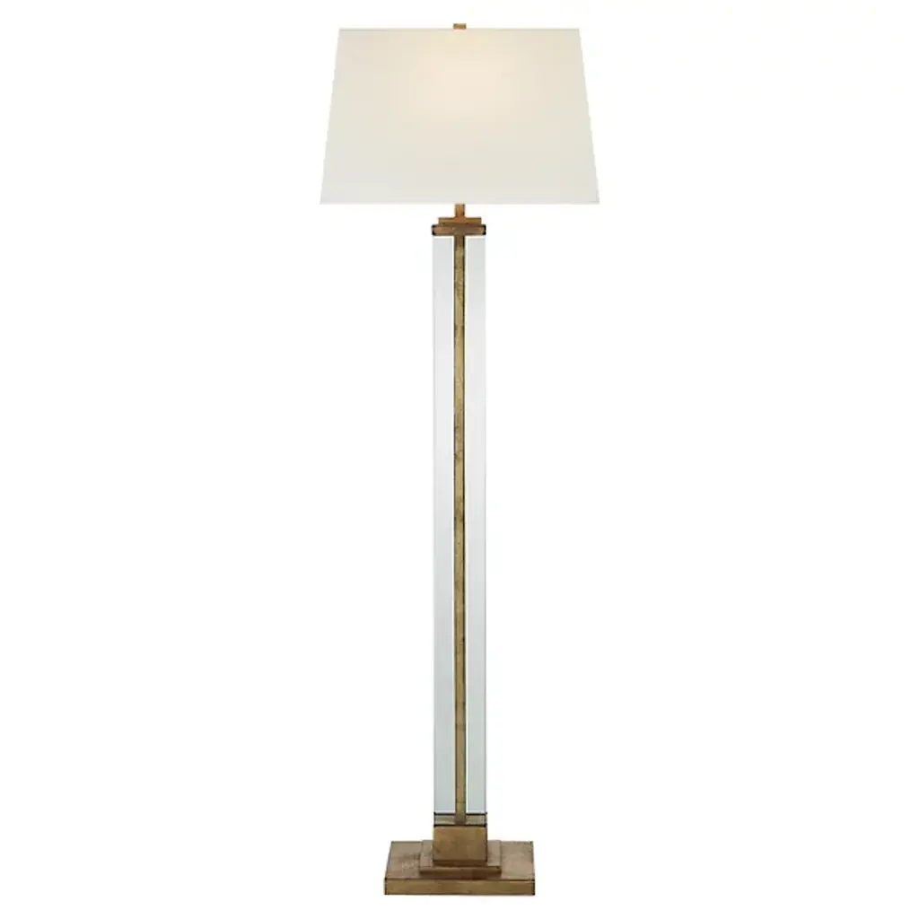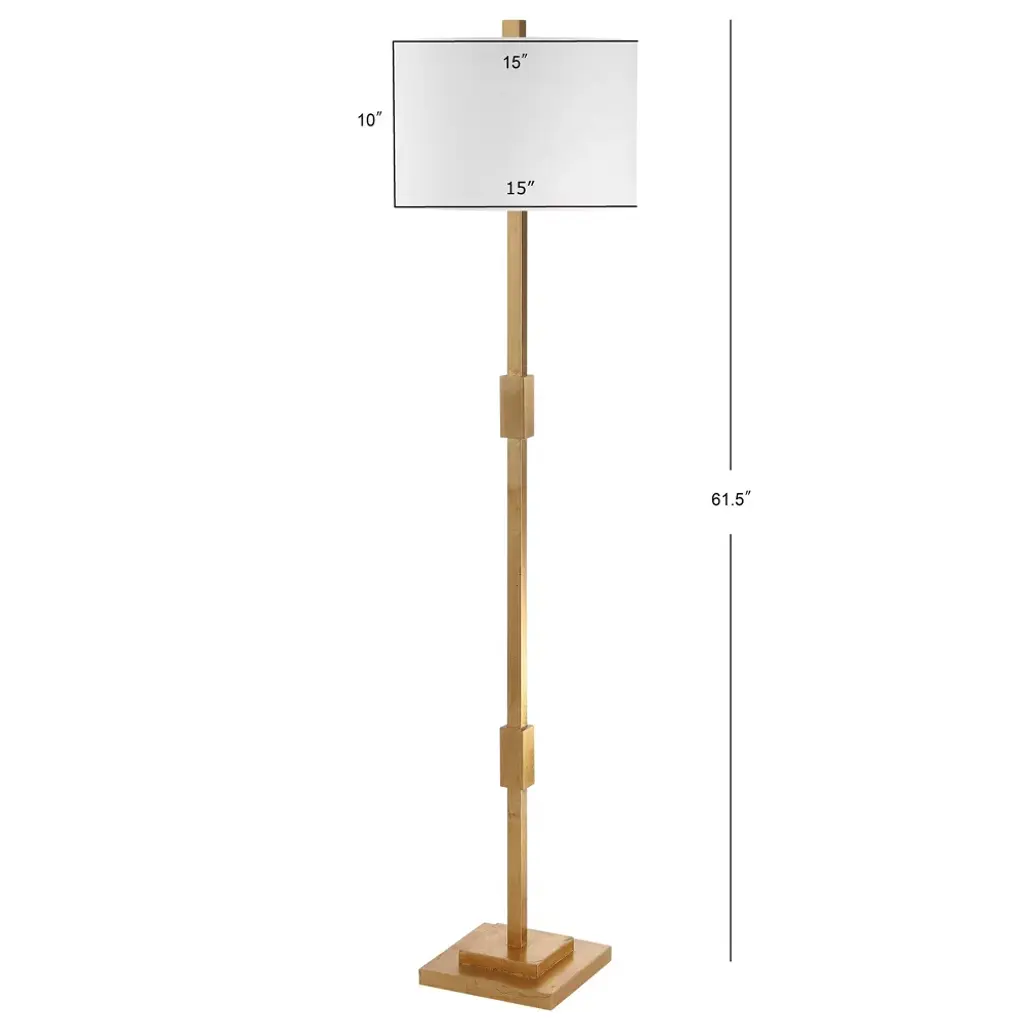 Appealing in its clean simplicity, this gold leaf floor lamp lends a refined presence to any living area. Geometric simplicity done right, this gold leaf stunner is worlds away from average. Its trend-forward column structure and stepped pedestal base evoke strong edges, in contrast to the lovely linen drum shade that softens the look. The gold leaf details extend to the matching finial, while the cord is silk-wrapped for an added luxe touch.