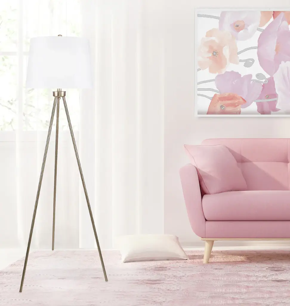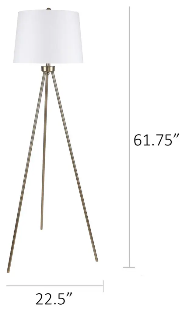 Versatile and minimalist, this contemporary floor lamp showcases a unique plated gold frame with sleek stabilizing tripod legs. Crowned with a crisp off-white linen tapered shade, this lamp is the perfect finishing touch to any modern décor.This lamp adds chic style to any space - whether it''s set behind the couch, sitting next to your bed, stationed in the office, or even tucked in your favorite reading nook.61.75" tall, this metal floor lamp is supported by tripod legs that span 22.5" in diameter and features a plated gold finish and an off-white linen tapered hardback drum shade measuring 16" at its widest and 11" tall.Uses one 100-watt maximum "A" bulb (not included) and features an E26 socket with a 3-way switch.Get custom colored lighting and effects by using an appropriate 100-watt maximum smart bulb (not included), or plug your lamp into a smart outlet (not included) that can be used with virtual assistants such as Amazon''s Alexa or the Google Home Assistant for ultimate control.