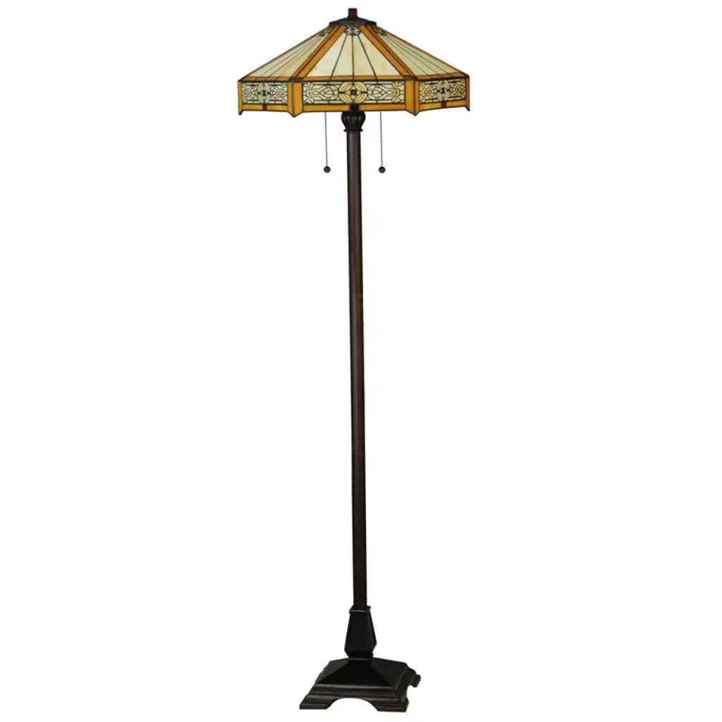 Add a touch of color to any room in your house with this hand-painted art glass floor lamp. It features an eye-catching white pattern with clear texturized glass accents This beautiful lamp comes complete with a rounded weighted base for added stability.