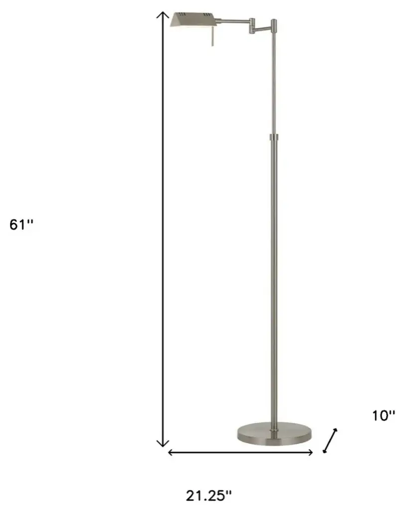 This 61" nickel adjustable swing arm floor lamp is a great way to add some brightness to any corner of your home. The lamp is made of sturdy metal and features a nickel color. A stationary base marries with a flexible swing arm that allows you to extend and move the light to where you need it. The light that this lamp throws is soft and warm to elevate the look of most any space in your home. It is perfect for virtually any decor. 61" H x 21.25" W x 10" D