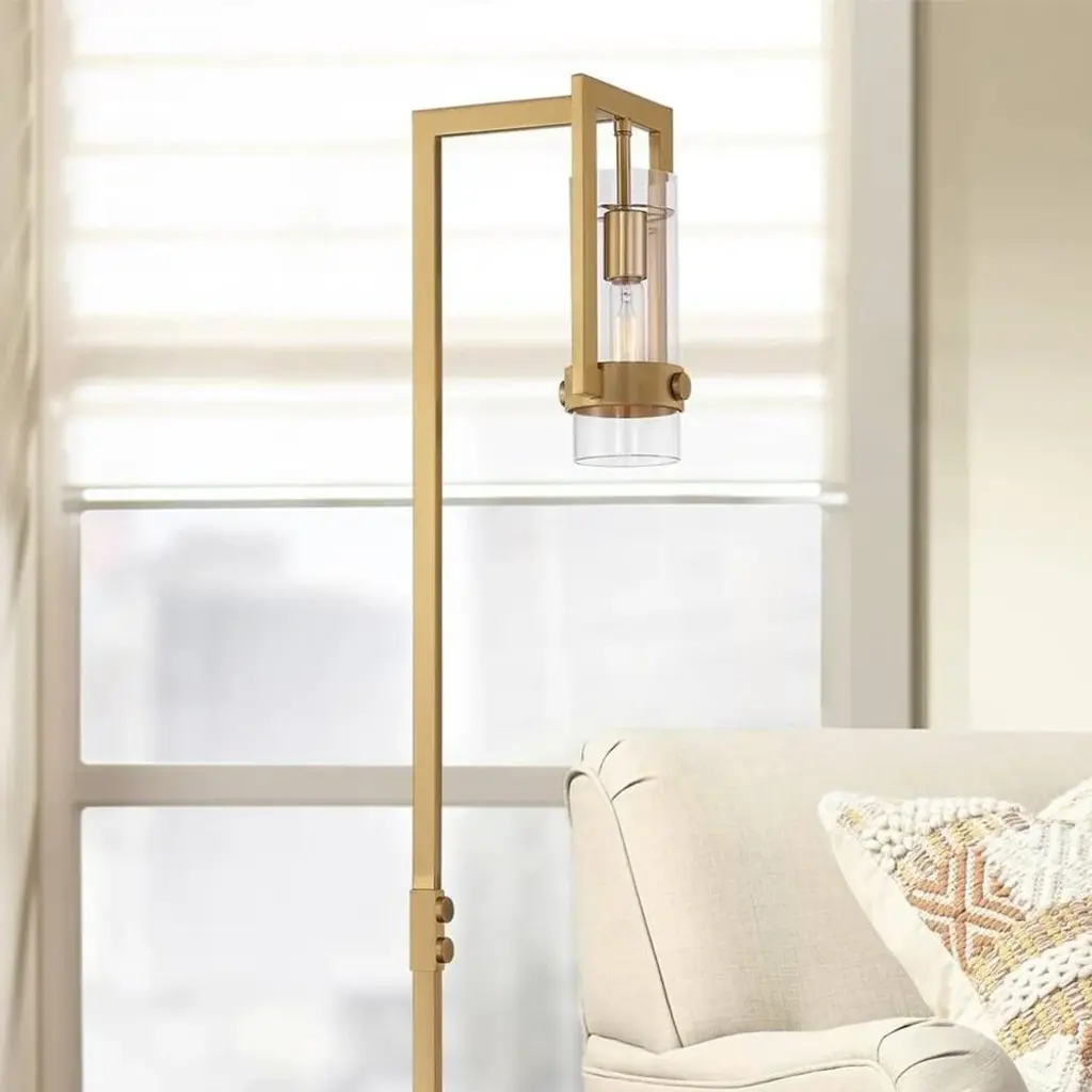 RODUCT DETAILS: 61" high. Base 12" x 10". Shade 10" long x 4" wide. 12" extension from column to outside edge of shade. Weighs 19.8 lbs. Uses one maximum 100 watt standard-medium base light bulb (not included). Shown with a T-Type tube bulb, which is recommended. On/off step switch in the cord. Warm gold finish column and arm. Metal construction. Rectangular black matte base. Clear glass cylinder shade allows the bulb to be seen. 8-foot long clear silver cord. DESCRIPTION: From the Possini Euro Design collection, this uniquely styled lamp offers clear glass, warm gold and a contrasting matte black base. Place in your favorite reading area or light up a room with a distinctive flair.