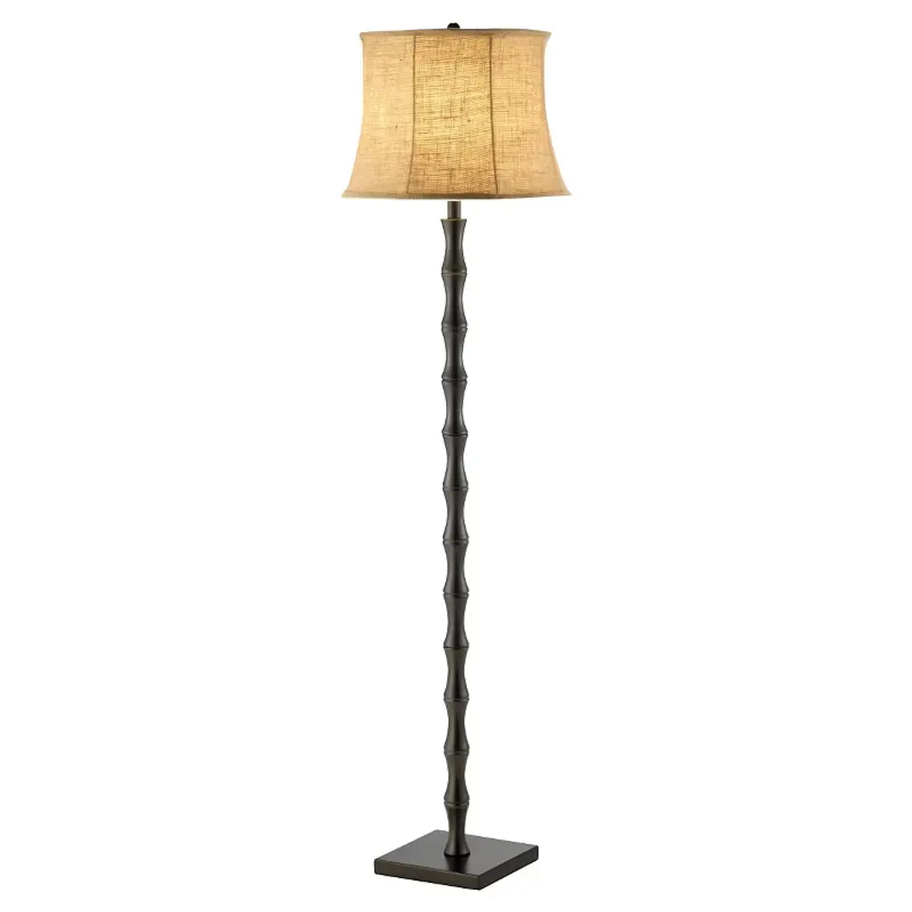 With a painted black metal pole with a repeating motif resembling carved wood, the Stratton floor lamp is a perfect style for updated traditional or soft contemporary spaces. Try its placement in the den, home office, or wherever you want to add a warm note. The medium brown burlap bell shade is secured with a round black wooden finial. A 3-way rotary socket switch will only work with a 3-way light bulb, otherwise this lamp will function with simple on/off switch at its highest setting. This floor lamp has a black cord and is smart outlet compatible. Bulb is not included.